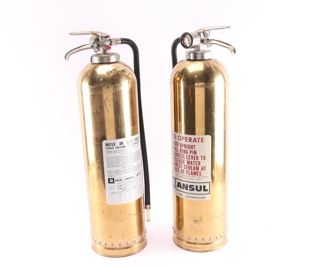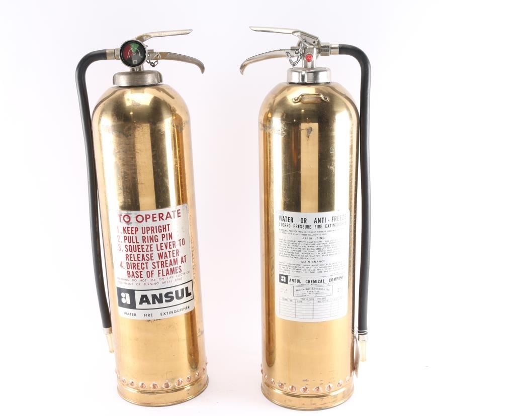 Two brass water fire extinguishers with Ansul labels. Measure 27" tall and 23 1/2" circumference.