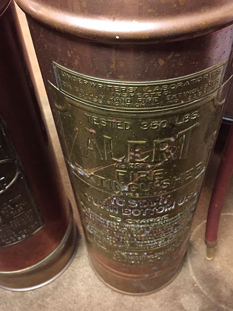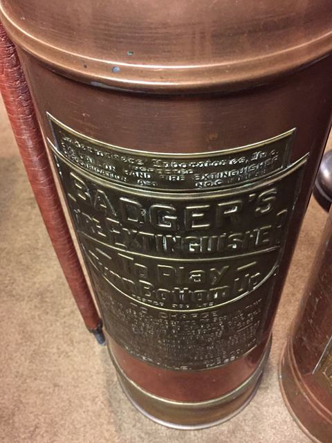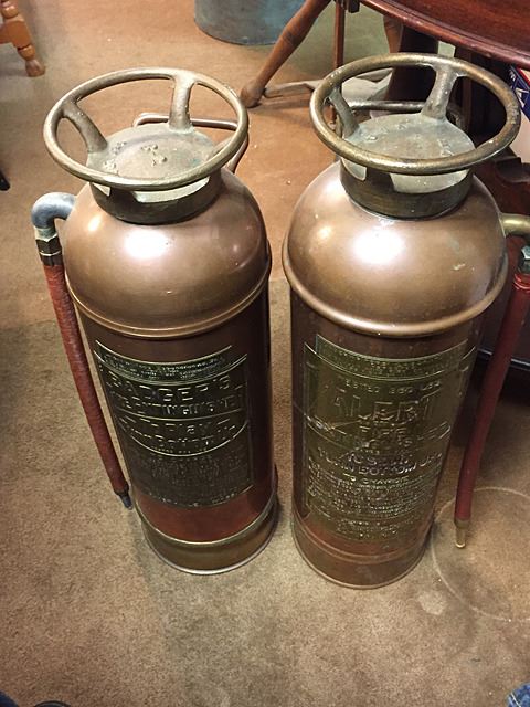 2 Vintage Fire Extinguishers, copper, Badger's and Alert.