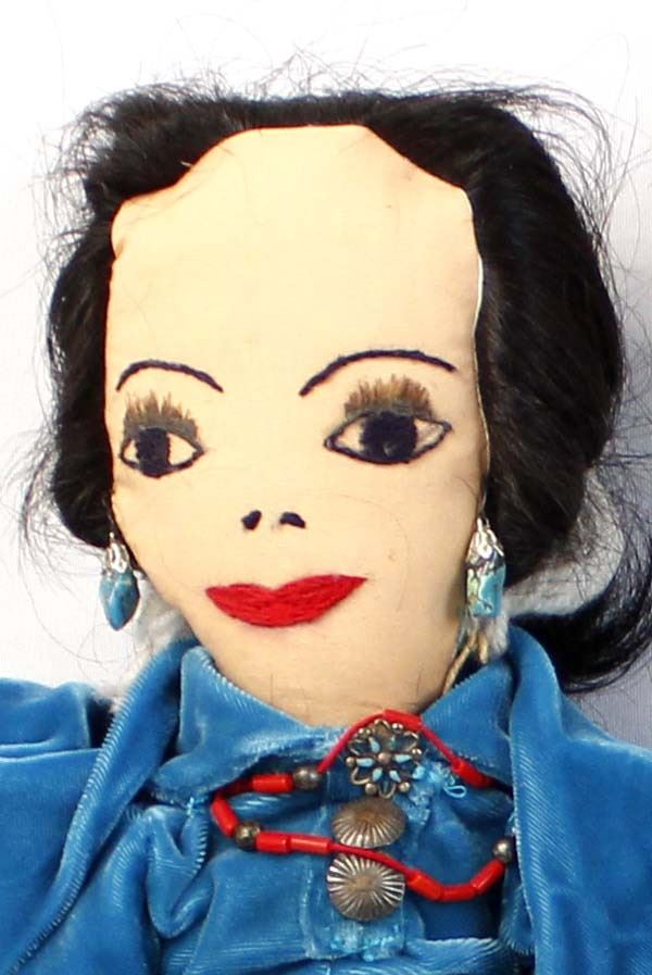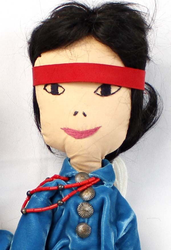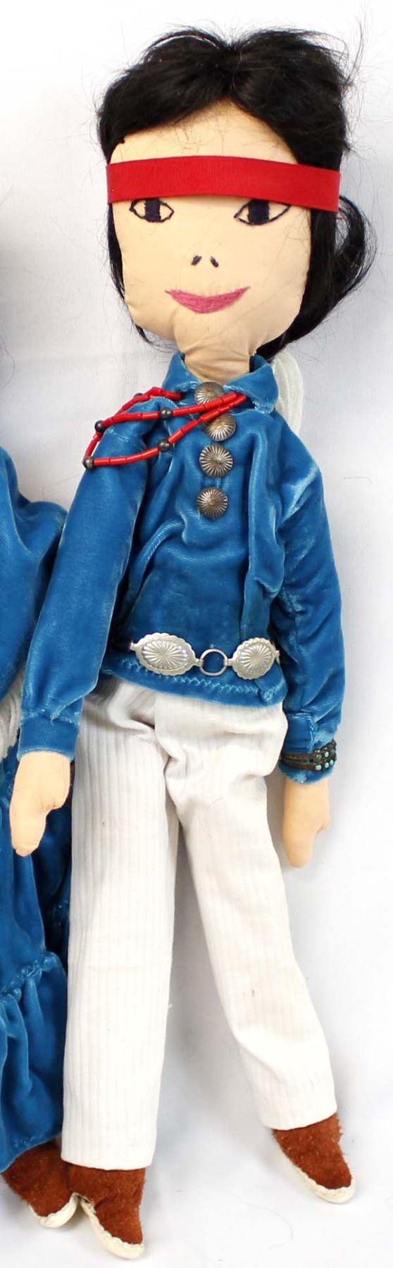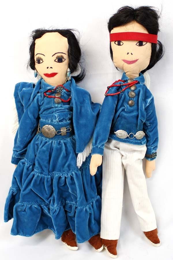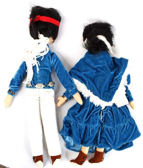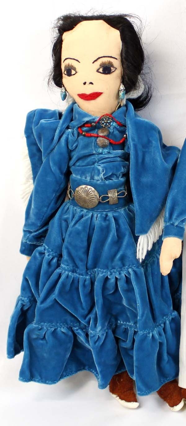 2 Vintage Handmade Native American Navajo Cloth Dolls, measure 21.5"L, each wearing traditional clothing, embroidered faces, beaded necklaces, metal concho belts, and metal buttons on velvet clothing, leather moccasins, she is wearing turquoise nugget earrings, real human hair on both dolls, she has on a traditional velvet dress and cape, he is wearing traditional velvet shirt