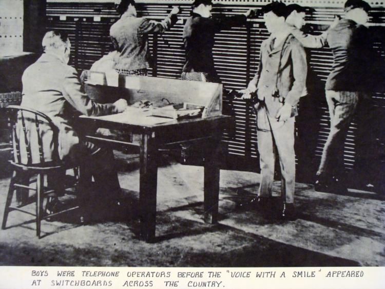 Women operators receive voice training to become "voices with smiles." * Medium: Photographic print on paper * Date: 1916Image Size: 15 x 20" * Paper Size: 17 x 22"Condition: ExcellentBoys were telephone operators before the "voice with a smile" appeared at switchboards across the country. * Medium: Photographic print on paper * Image Size: 15 x 20" * Paper Size: 17 x 22" * Condition: Excellent *