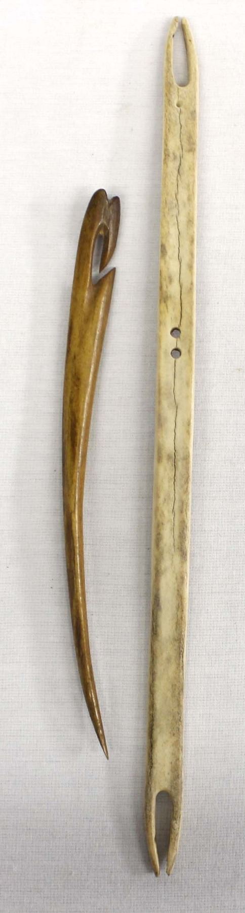2 Antique/Vintage Inuit Carved Bone Tools, includes 1. Inuit Carved Bone Needle, measures 13''L x 1''W, used to repair fishing nets 2. First Nations Eskimo Carved Bone Needle, large measuring .5''W x 9''L, beautiful patina