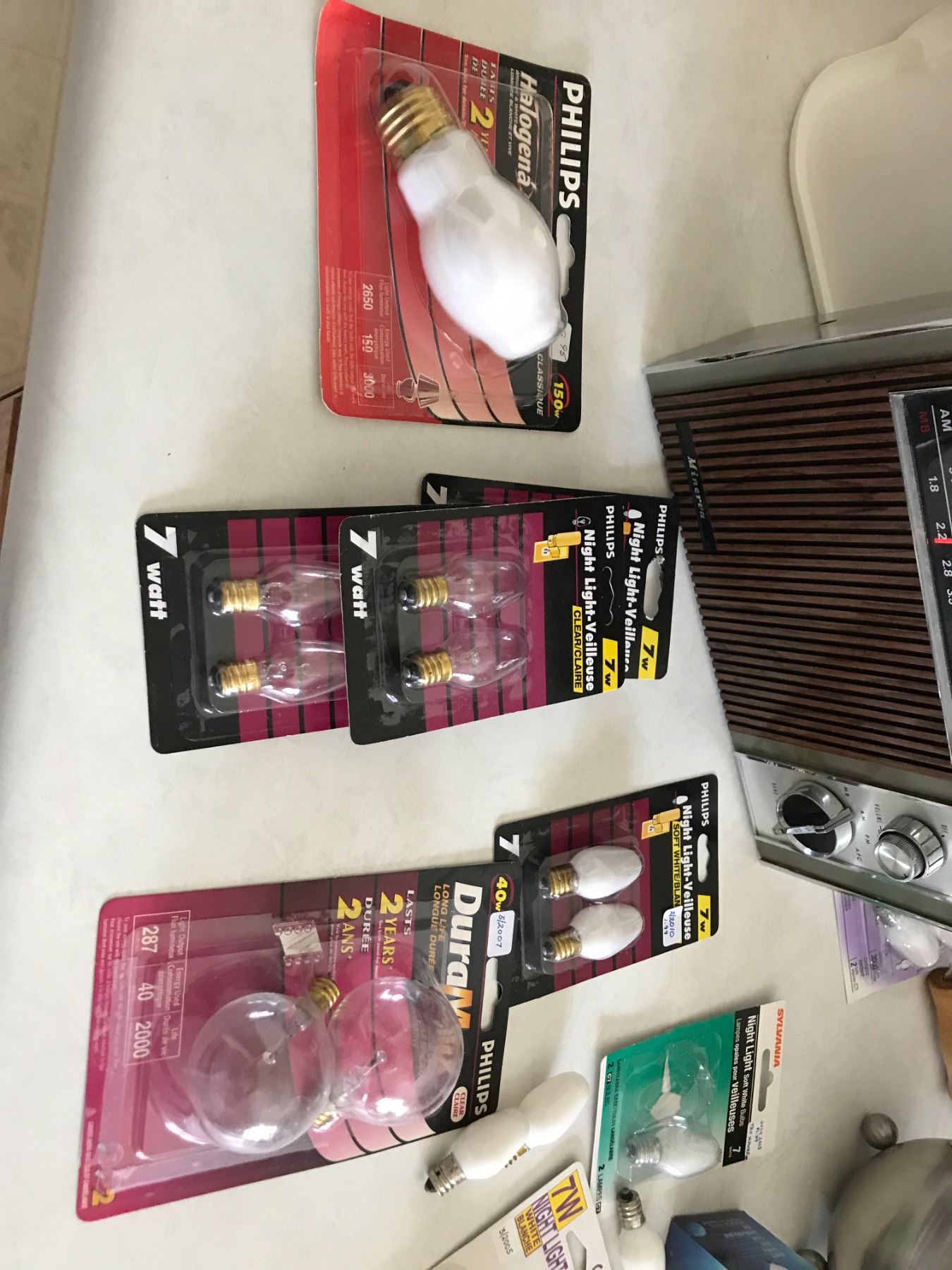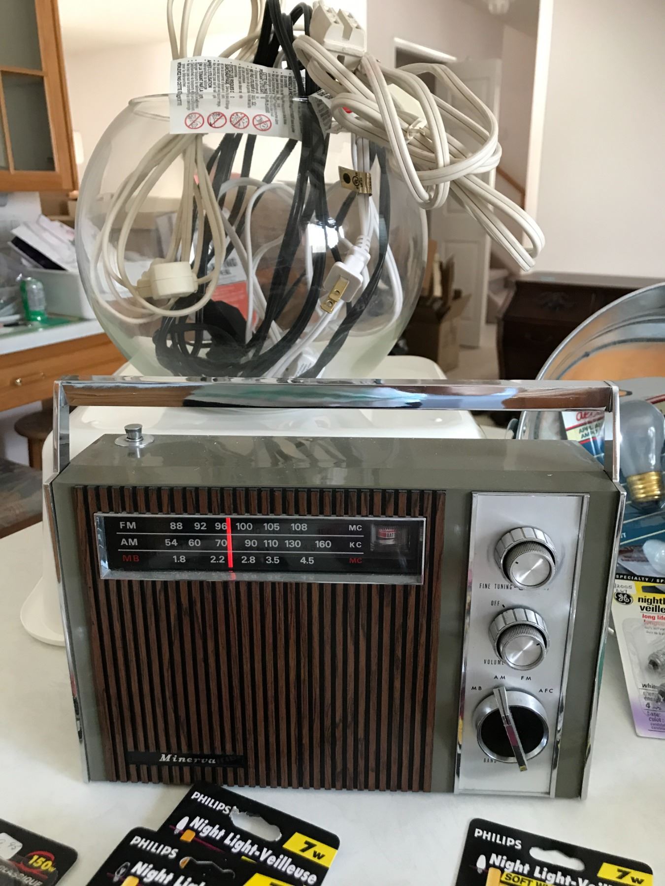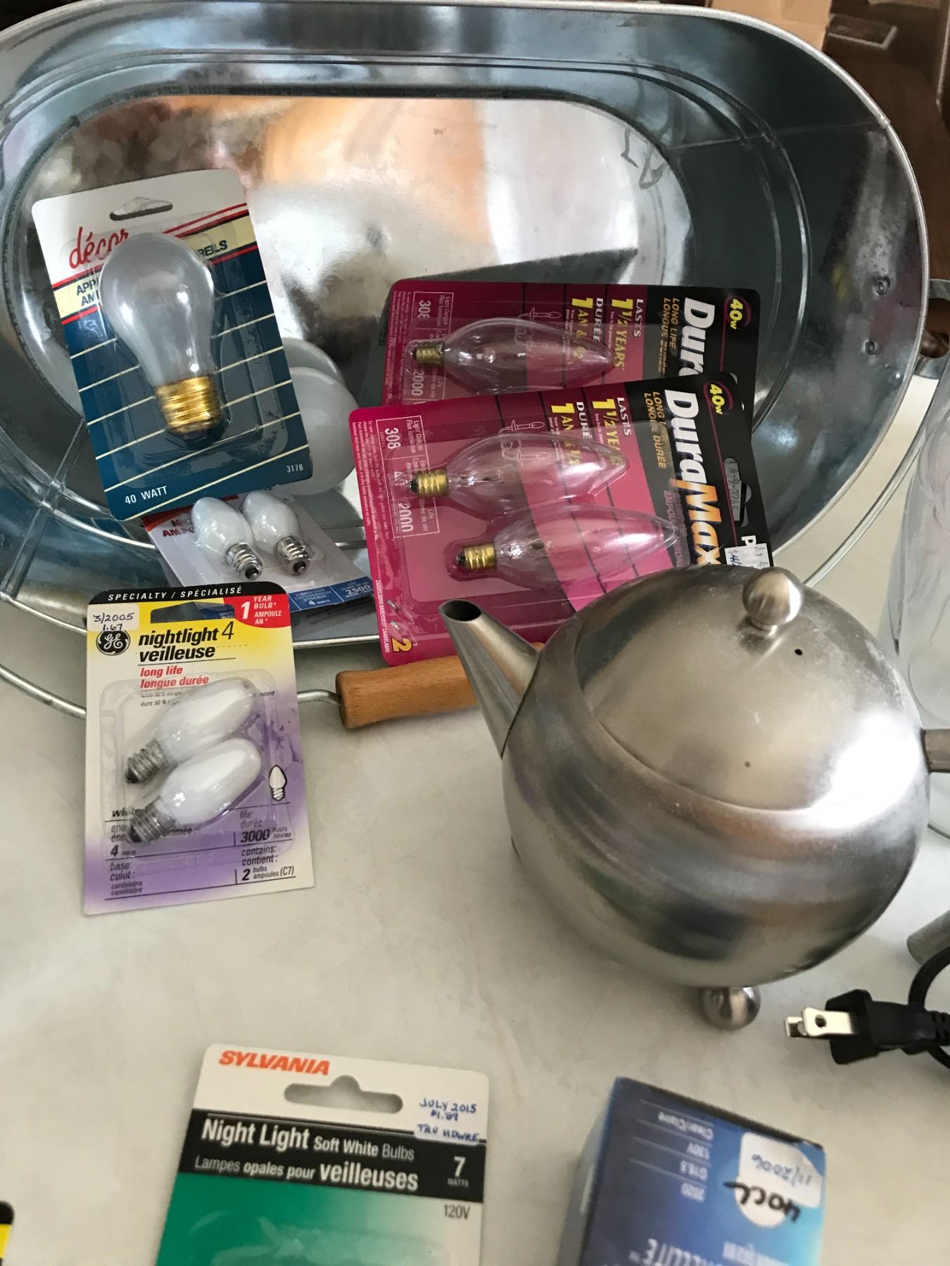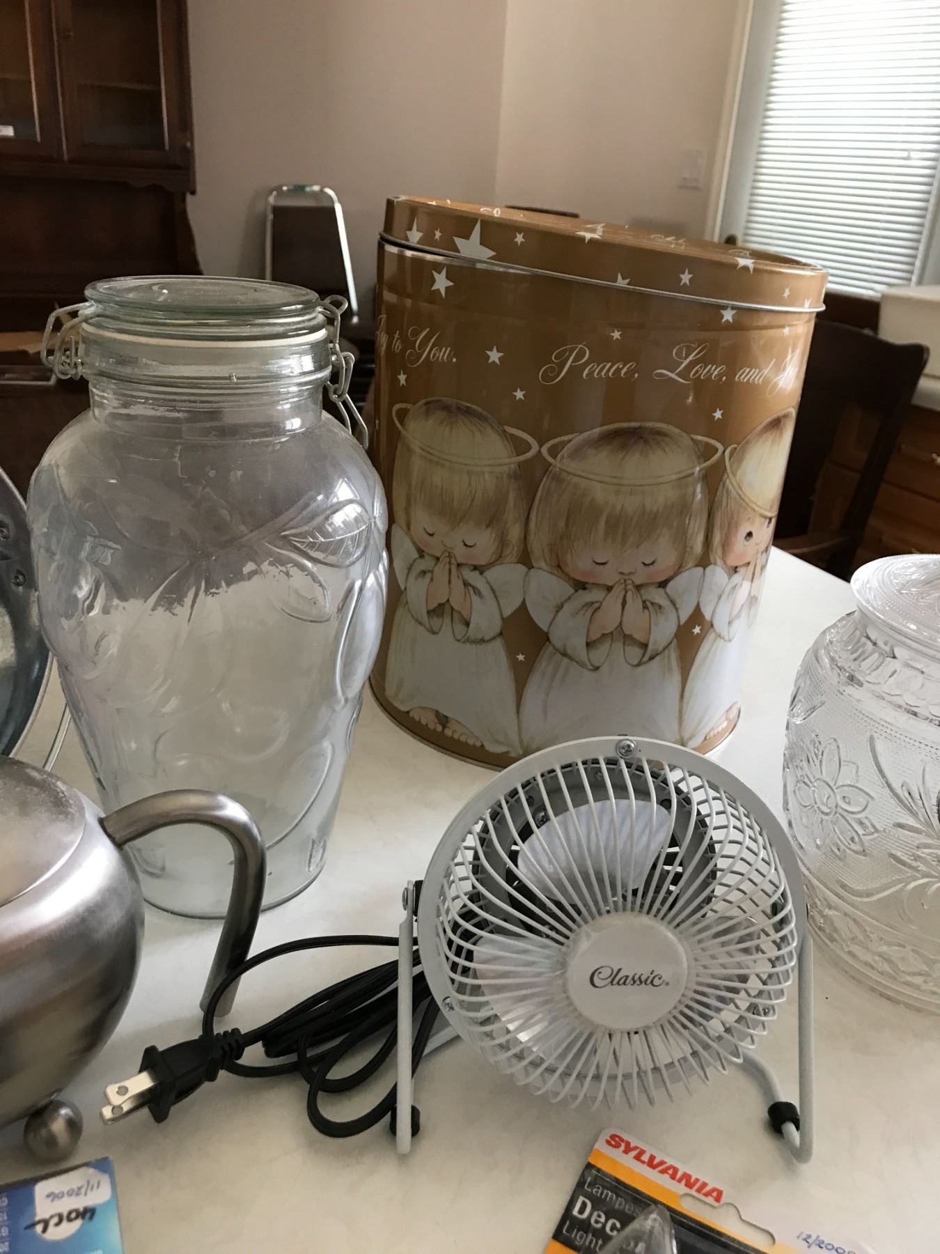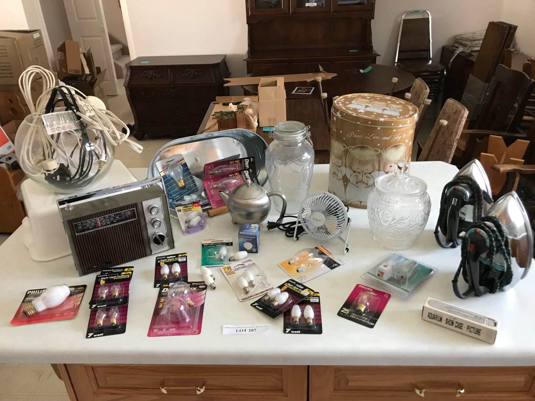 2 Vintage Irons, Minerva Radio, Mini Fan, Canning Jar, , Silver Teapot, Bucket, Glass Canister, Asst Lightbulbs, , Glass Bowl, Extension Cords, Angel Tin