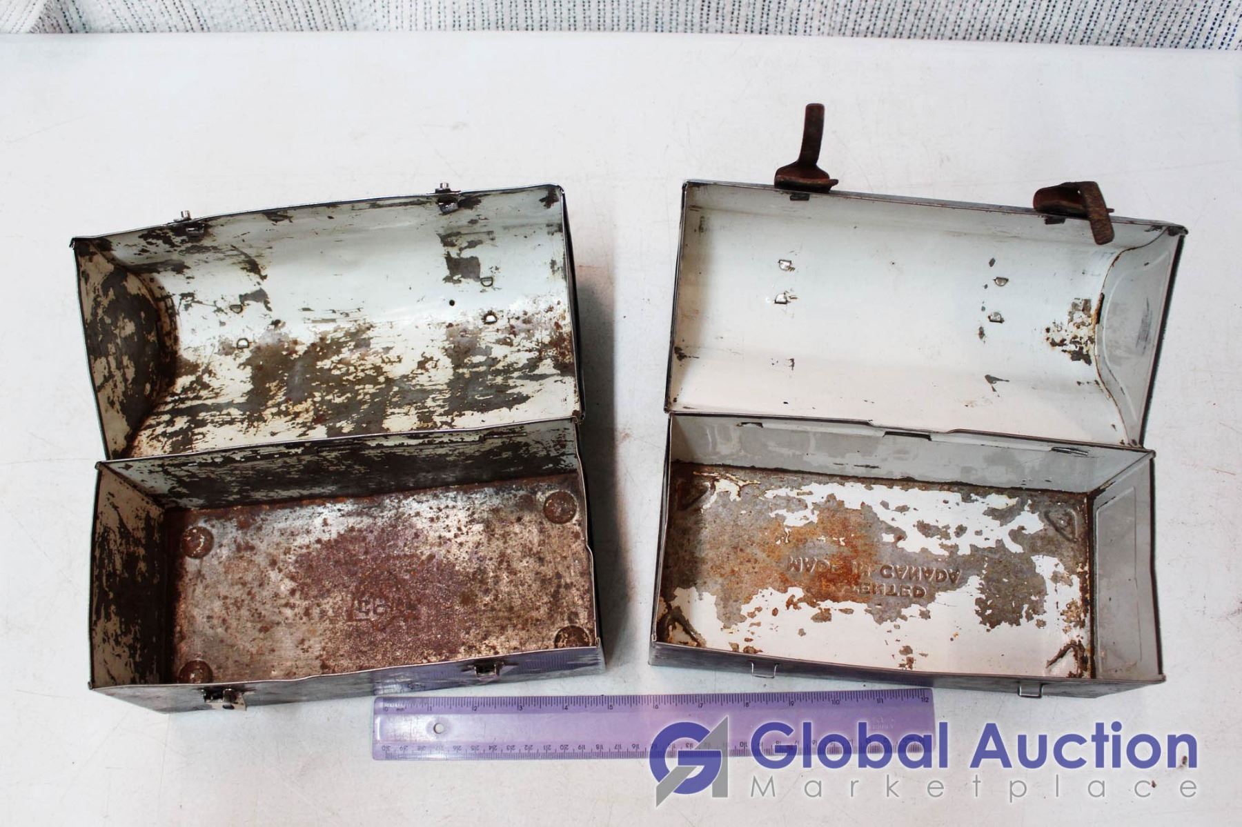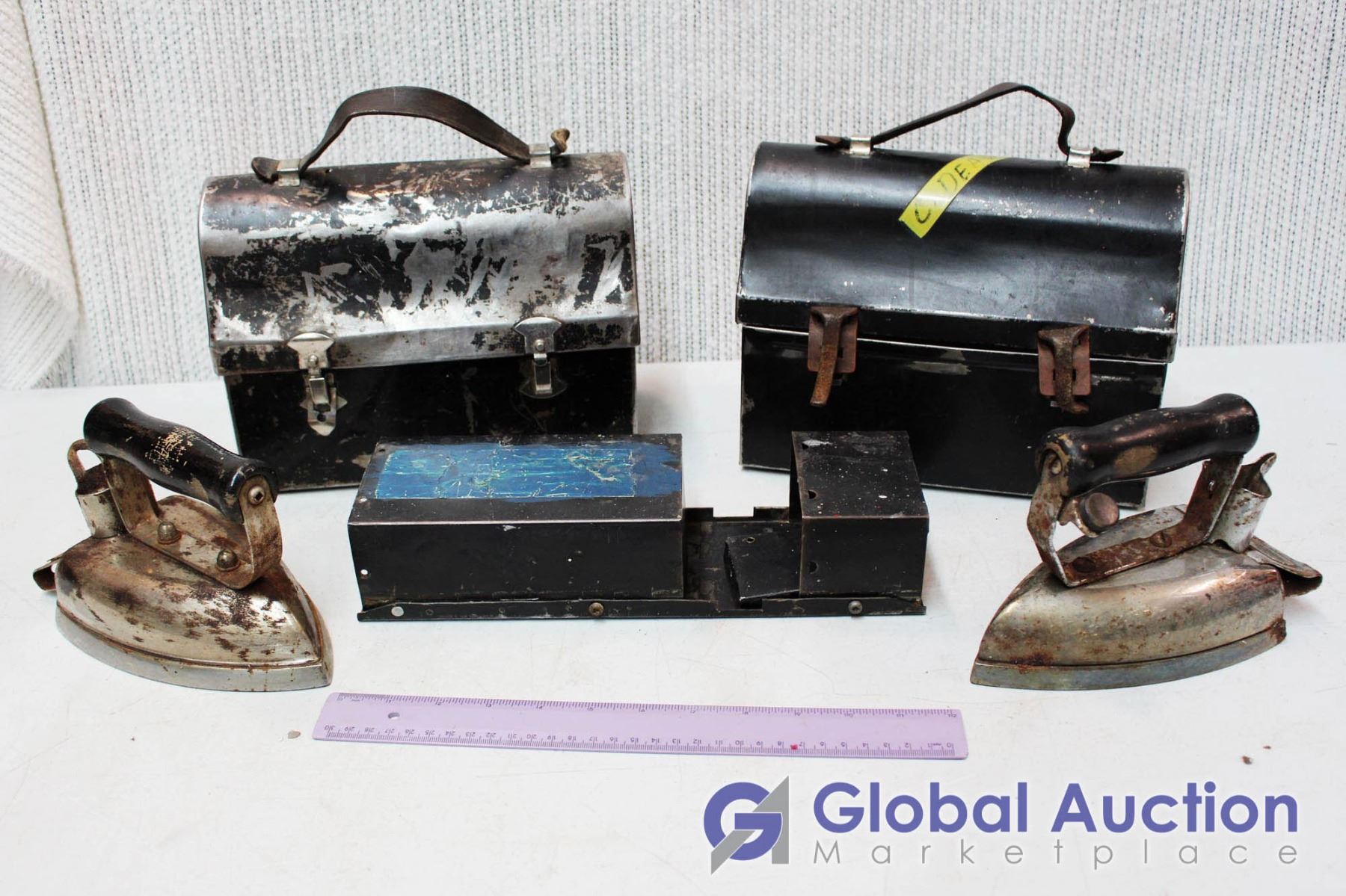 (2) Vintage Lunch Kits, (2) Sad Irons