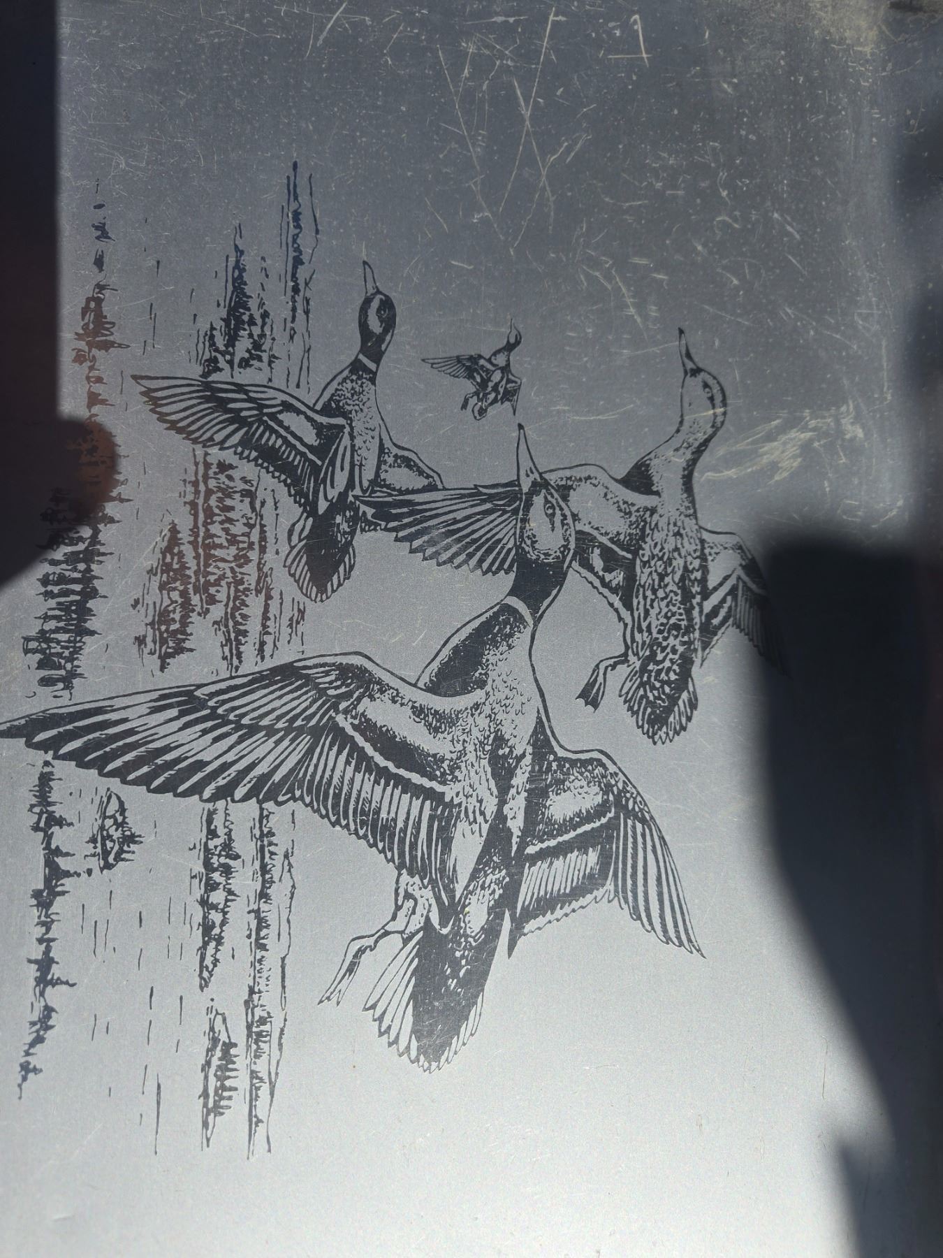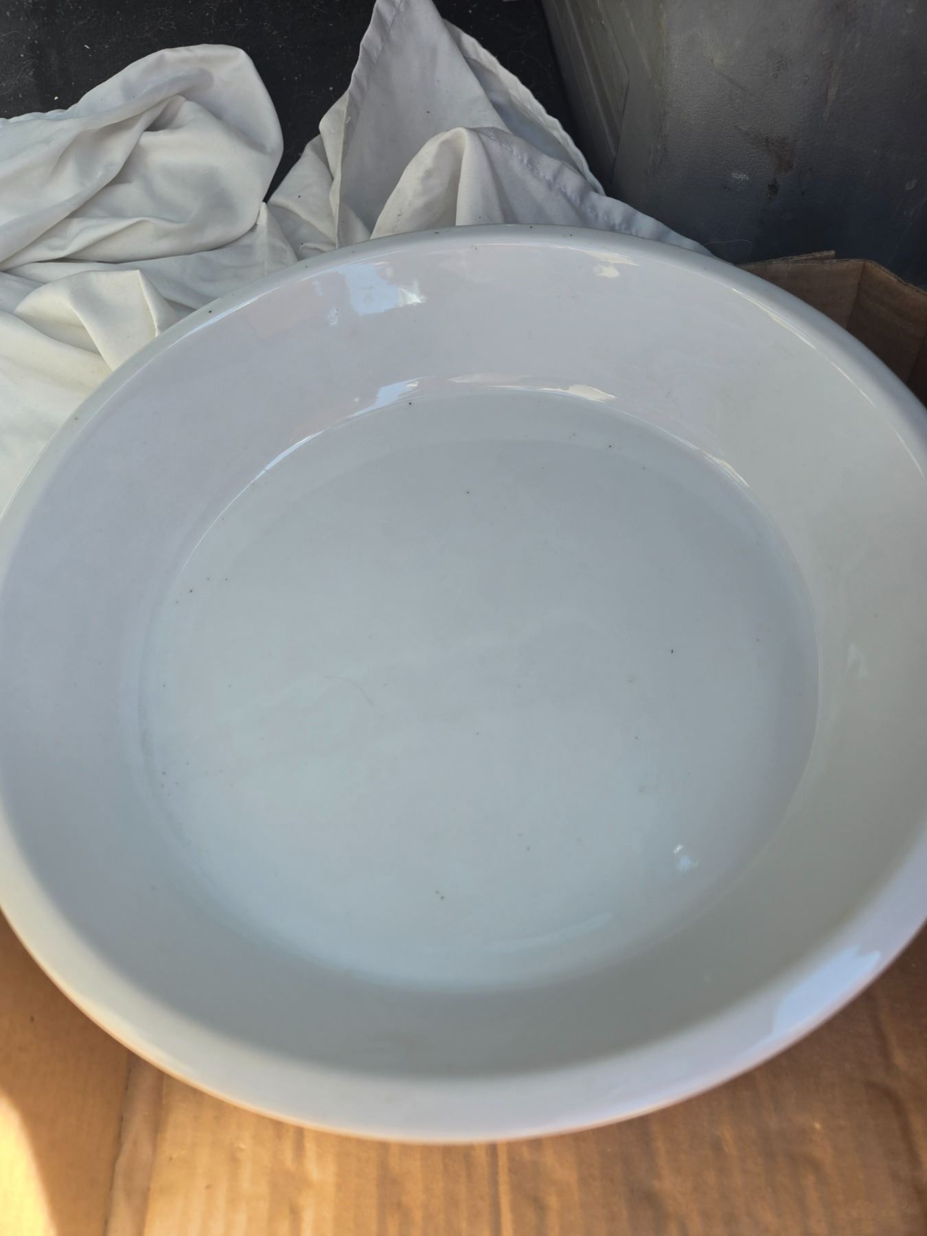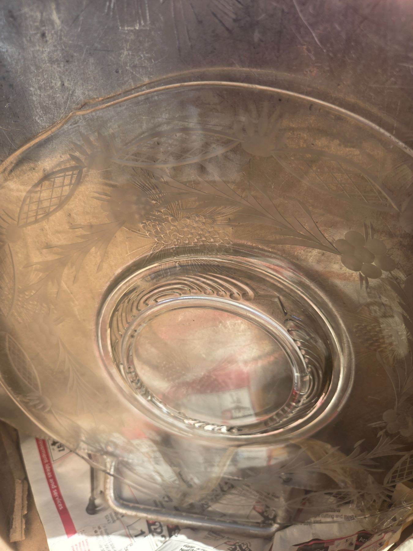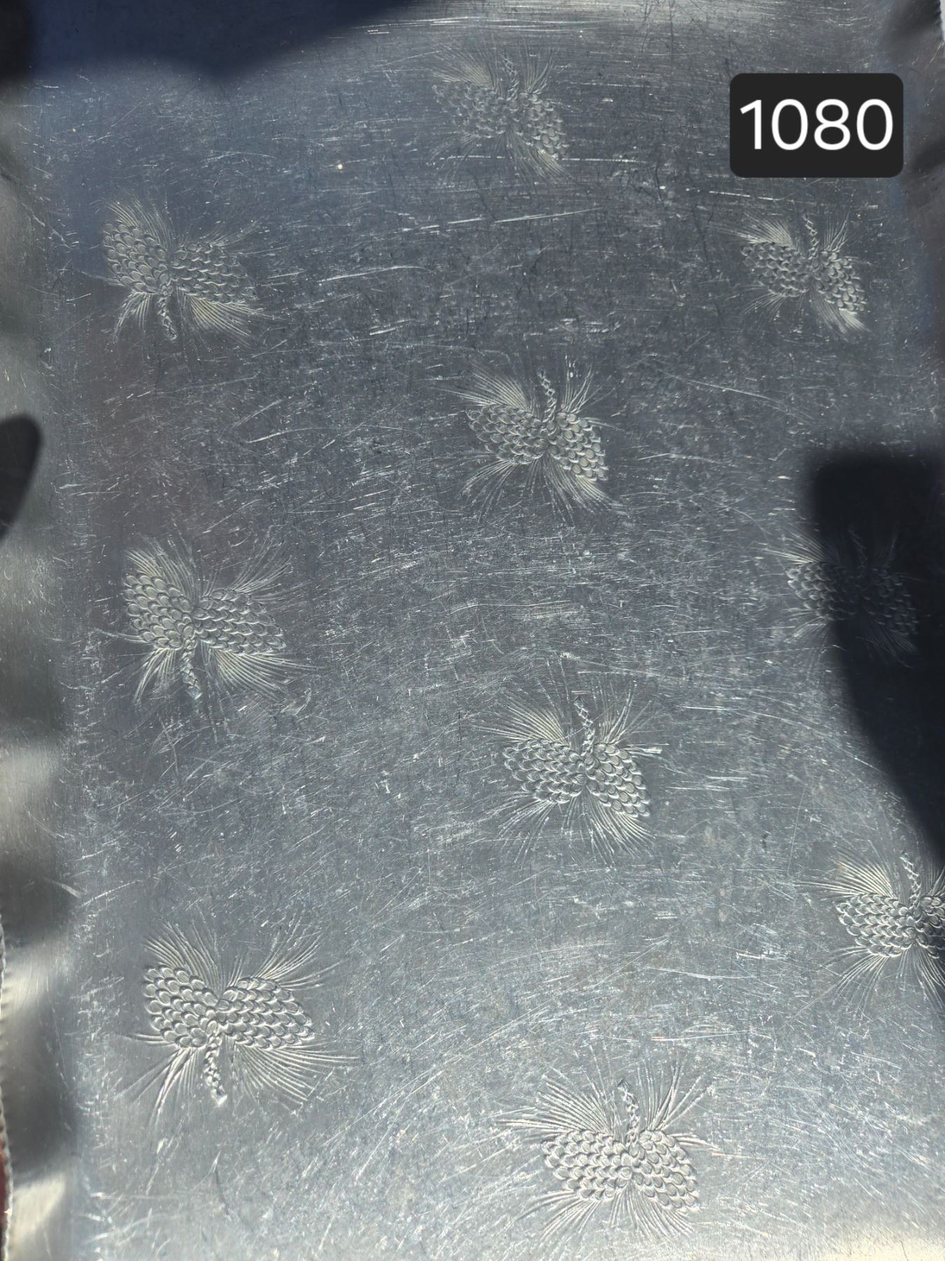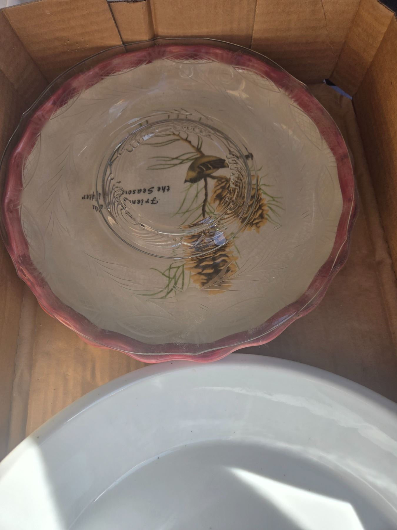 2 Vintage Metal Serving Trays – both etched. 1 Glass Plate. 2 Ceramic Deep Dish Pie Plates