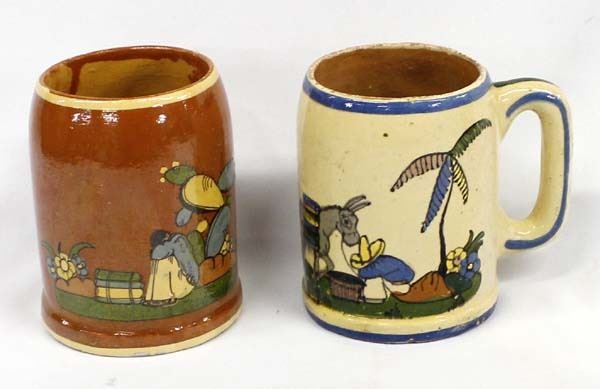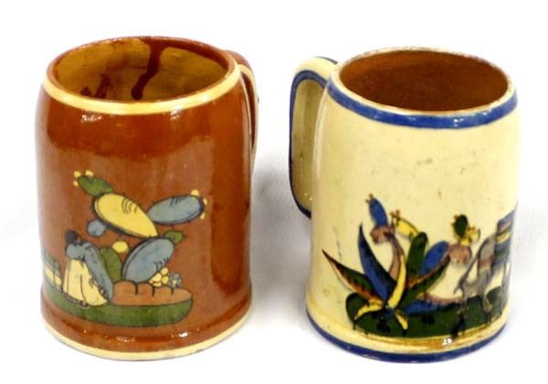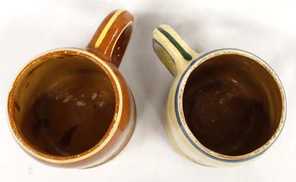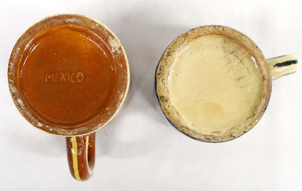 2 Antique/Vintage Mexican Redware Pottery Cups, beautifully hand painted, the larger one is stamped Mexico and measures 3.5'' x 5.5'' x 5''