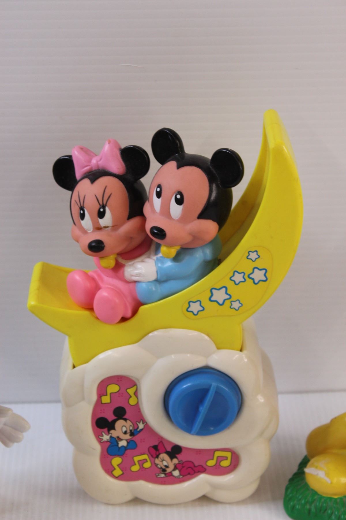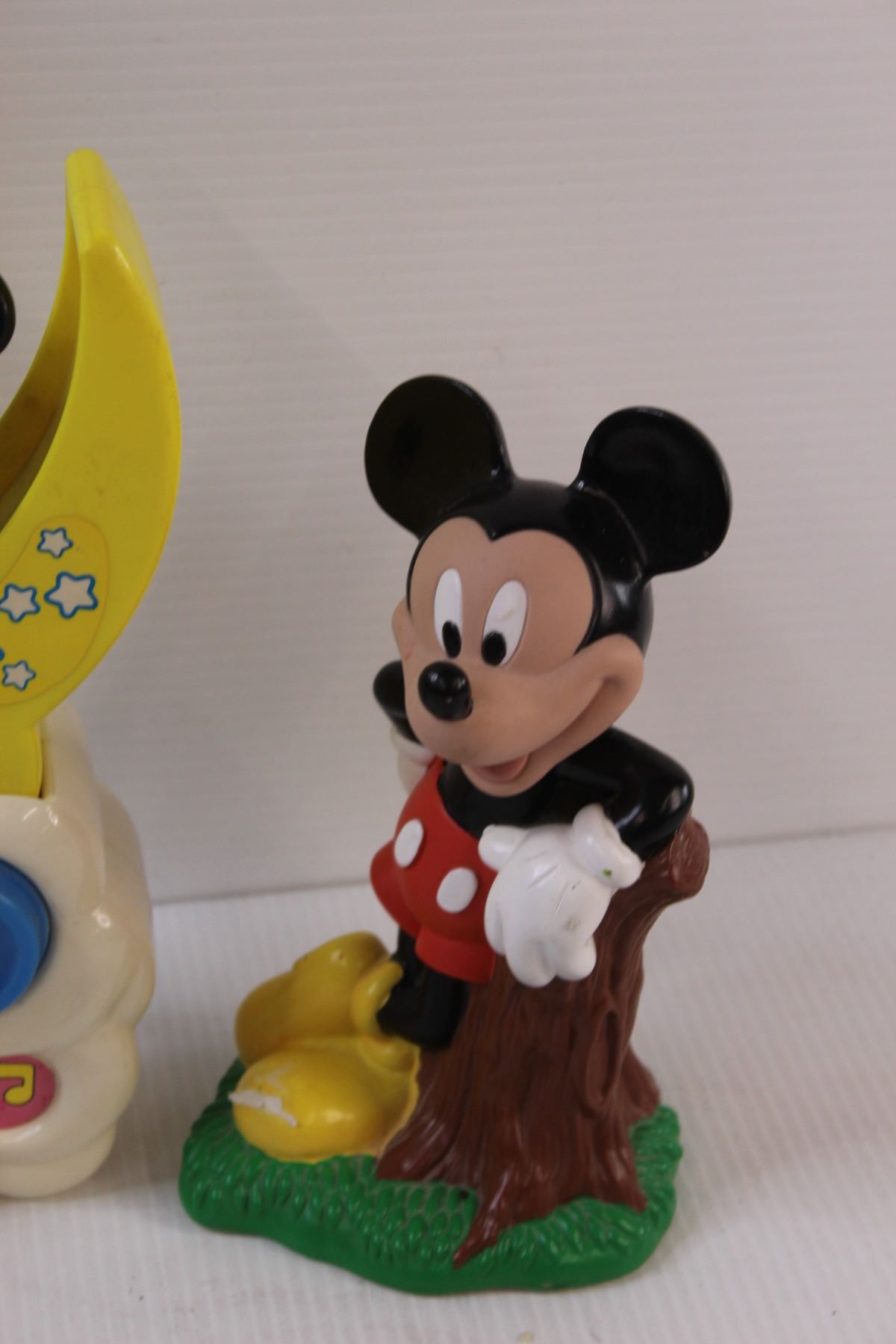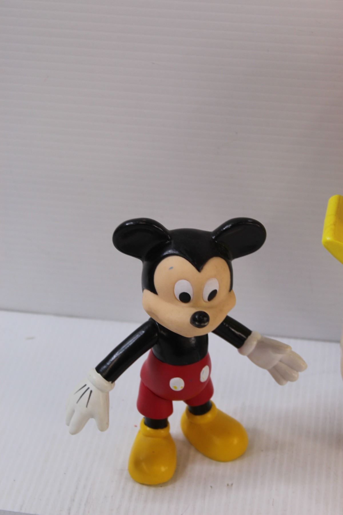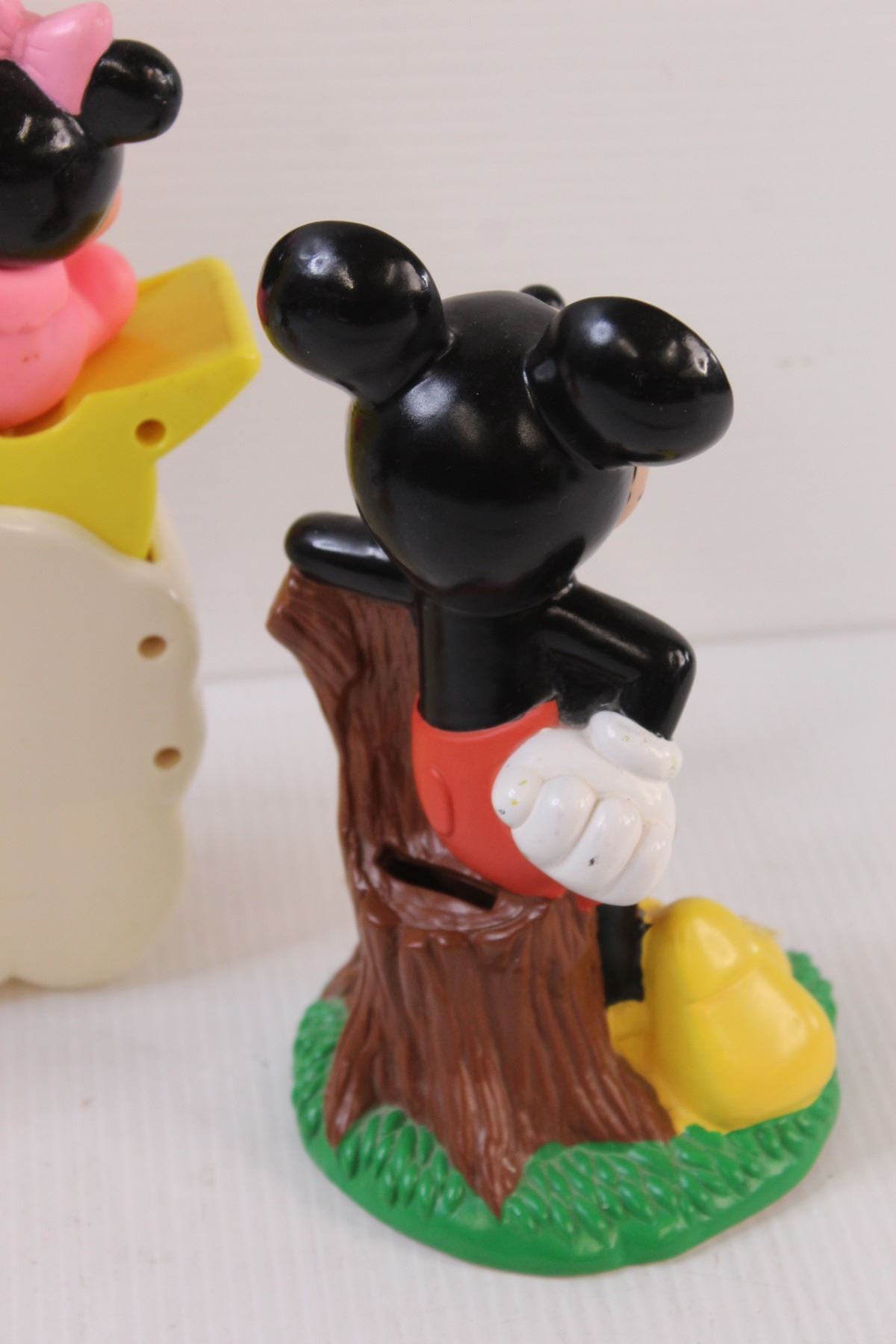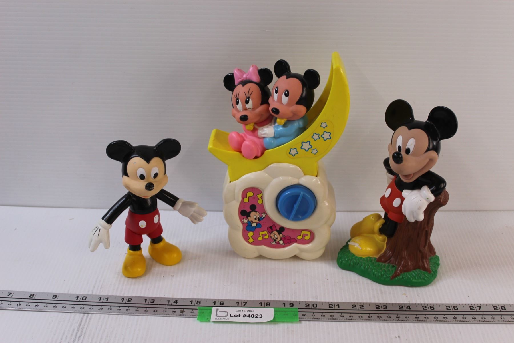 (2) Vintage Mickey Mouse Action Figures w/ (1) Vintage Mickey Mouse Coin Bank w/ Mickey Mouse Music Player