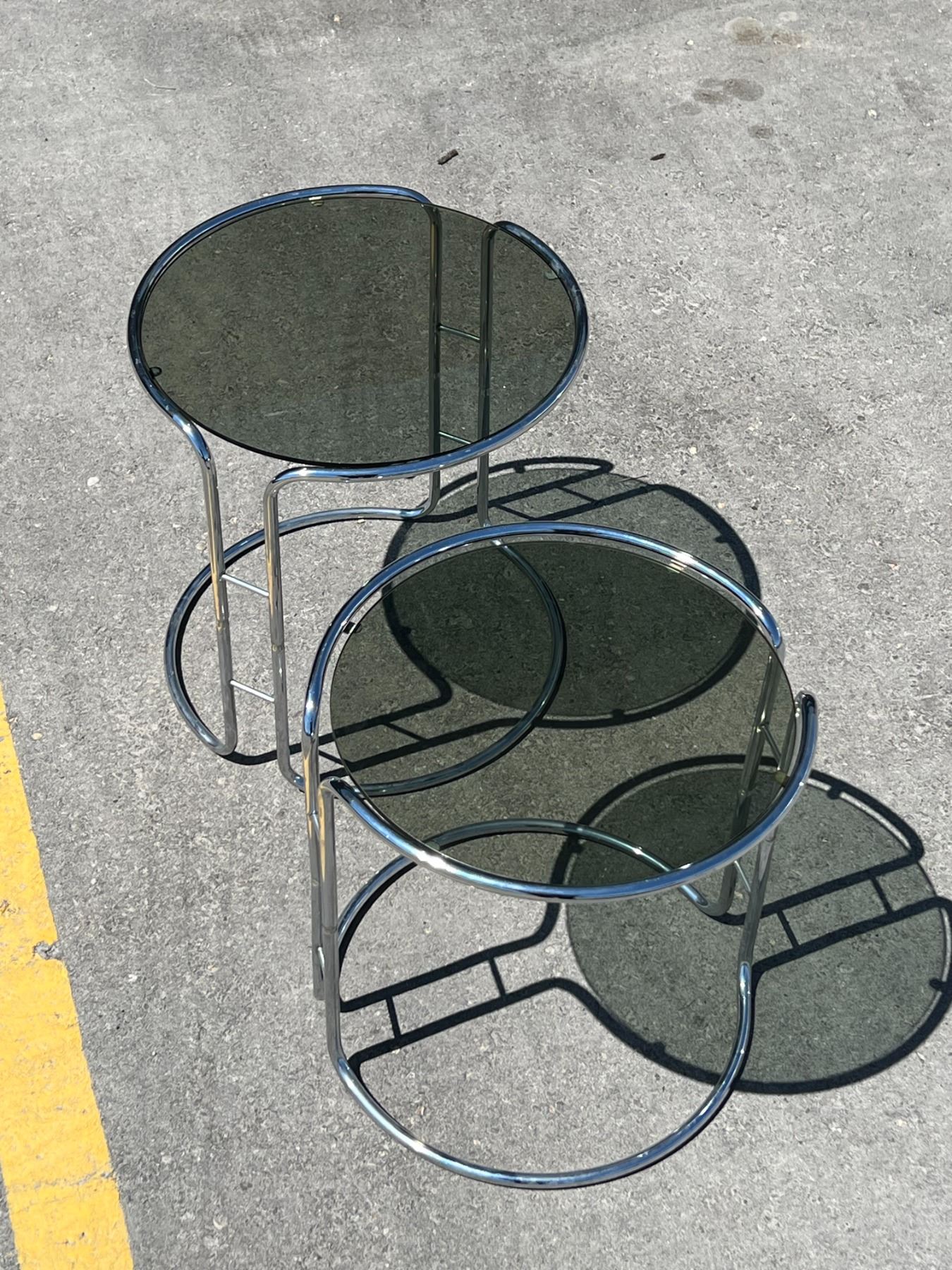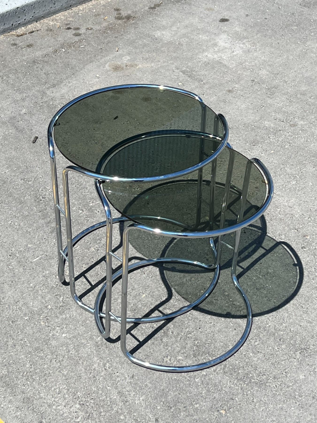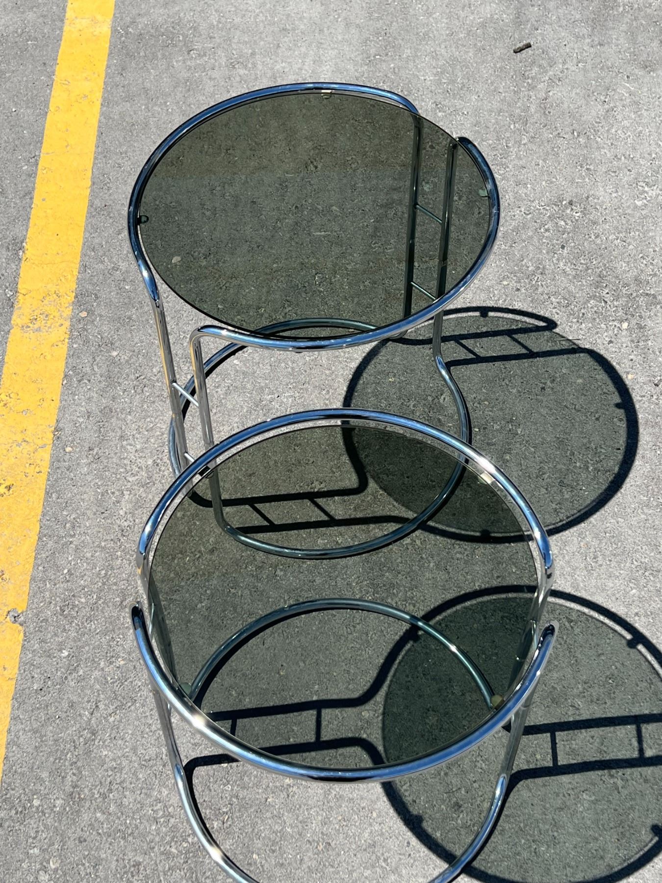 2 Vintage Mid Century Chrome & Smoked Glass Nesting Tables (see all photos). Smaller table glass has an edge chip (see photos)