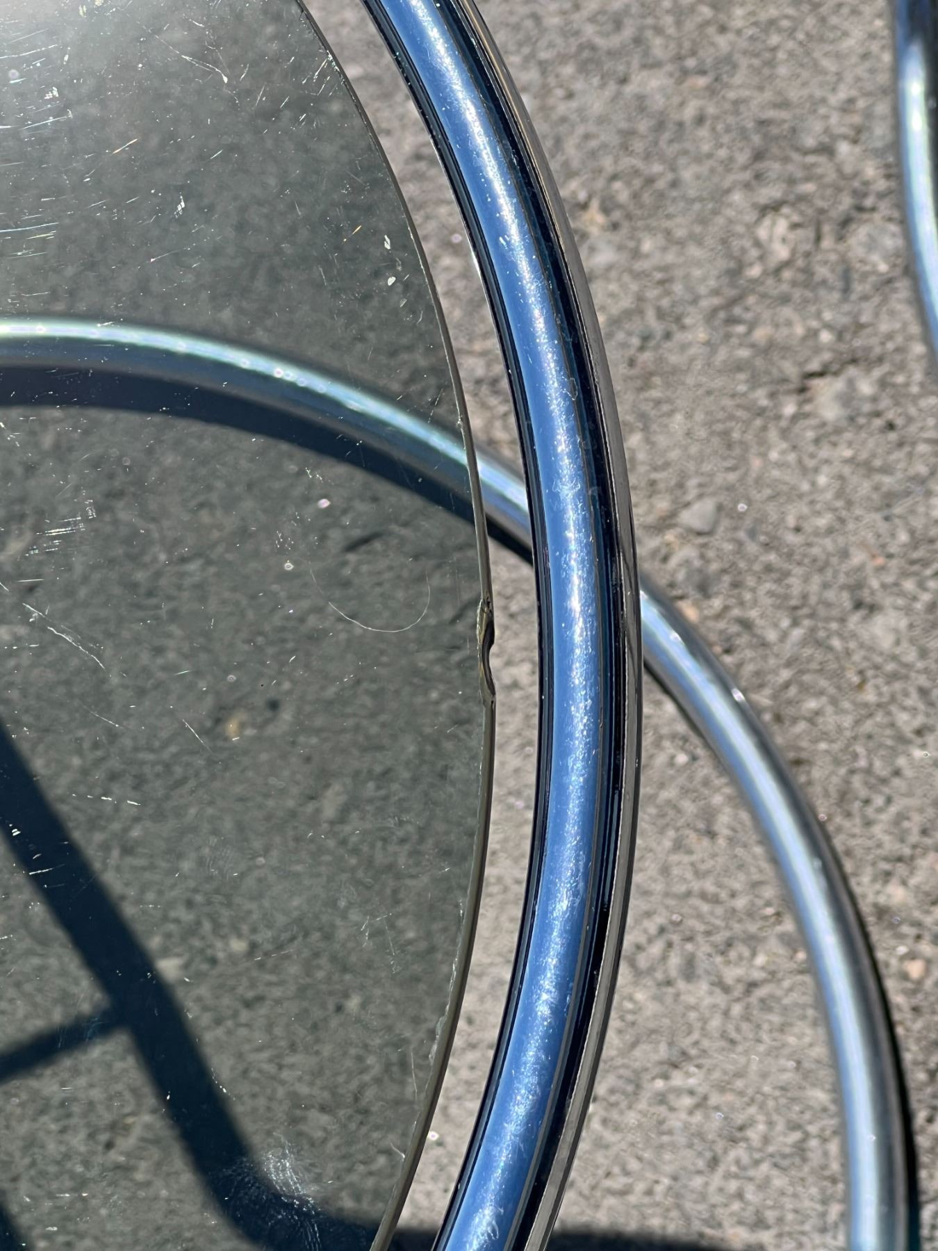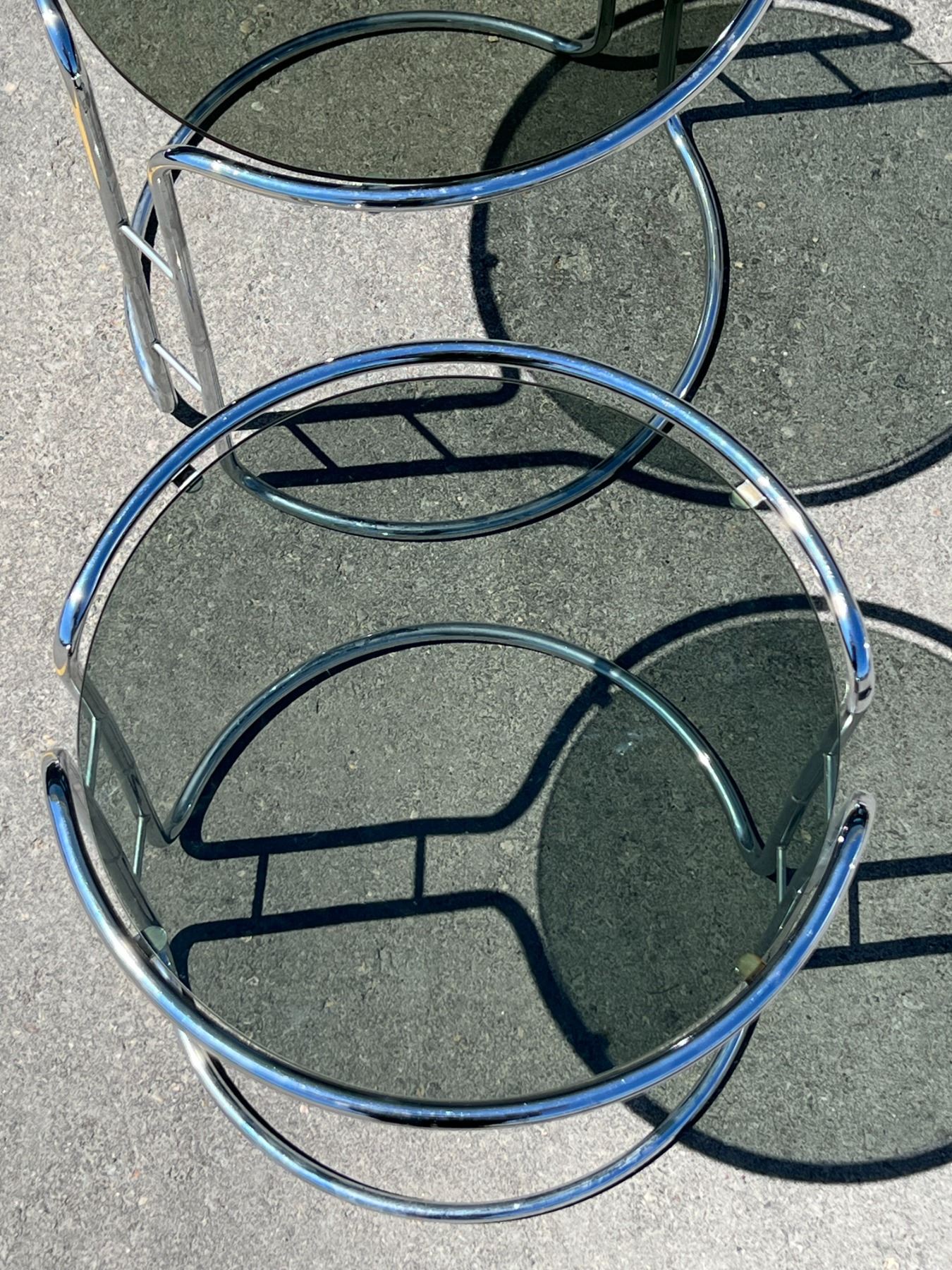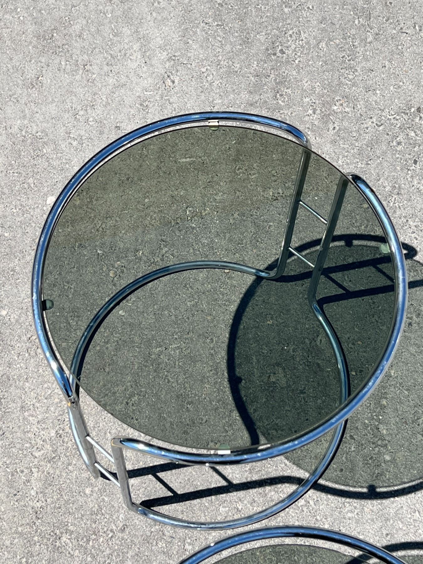2 Vintage Mid Century Chrome & Smoked Glass Nesting Tables (see all photos). Smaller table glass has an edge chip (see photos)