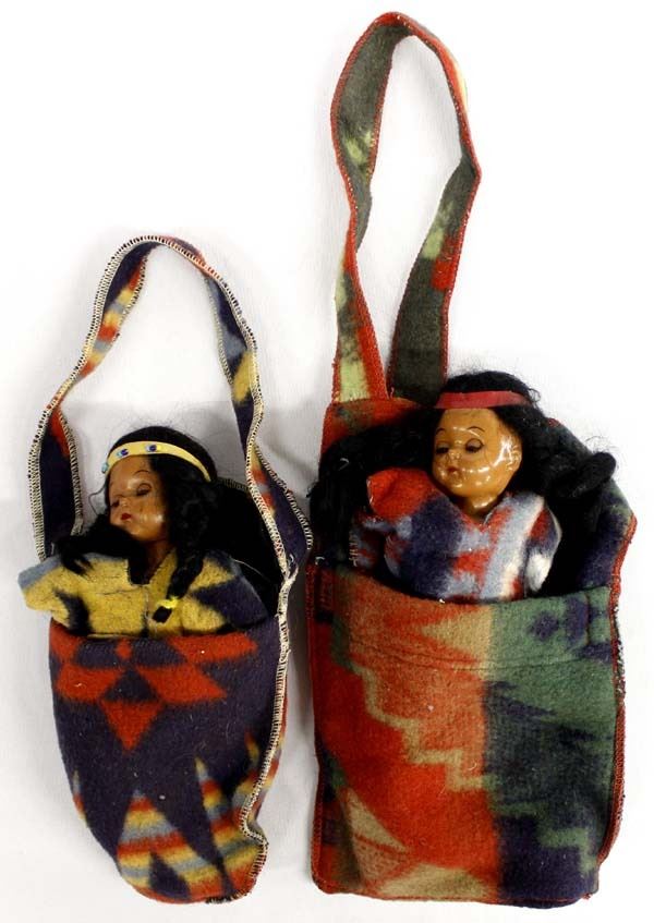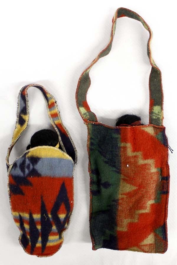 2 Vintage Composition Dolls, Native American Style, wrapped in blankets, the one doll is marked on the back ''Plastic Molded Arts Co. L.I.C. New York'', both come in fleece purses, measure 4.5'' x 9''