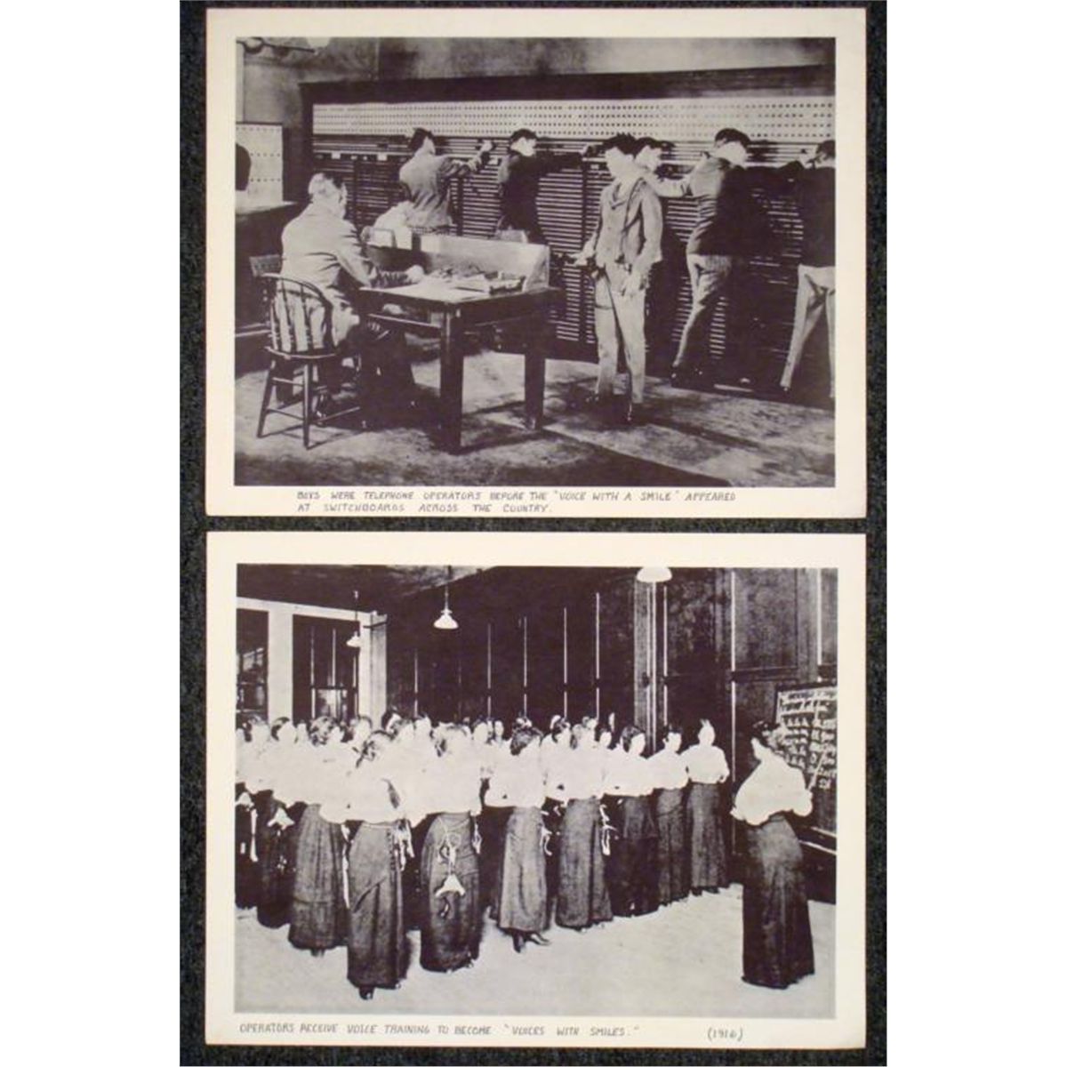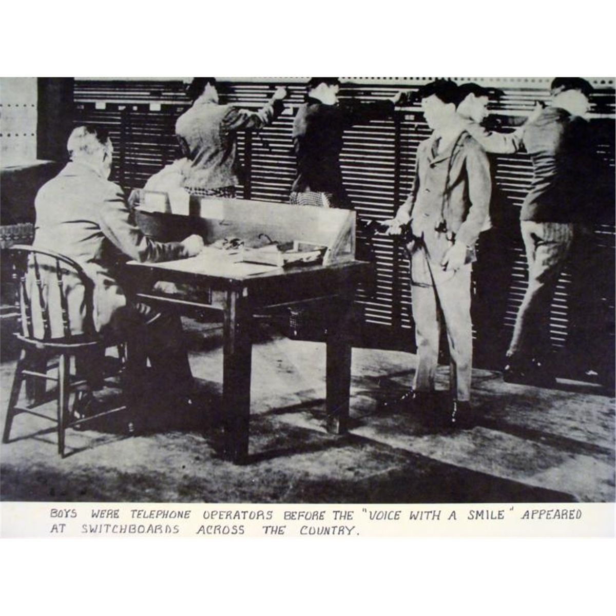 Women operators receive voice training to become "voices with smiles." * Medium: Photographic print on paper * Date: 1916Image Size: 15 x 20" * Paper Size: 17 x 22"Condition: ExcellentBoys were telephone operators before the "voice with a smile" appeared at switchboards across the country. * Medium: Photographic print on paper * Image Size: 15 x 20" * Paper Size: 17 x 22" * Condition: Excellent *