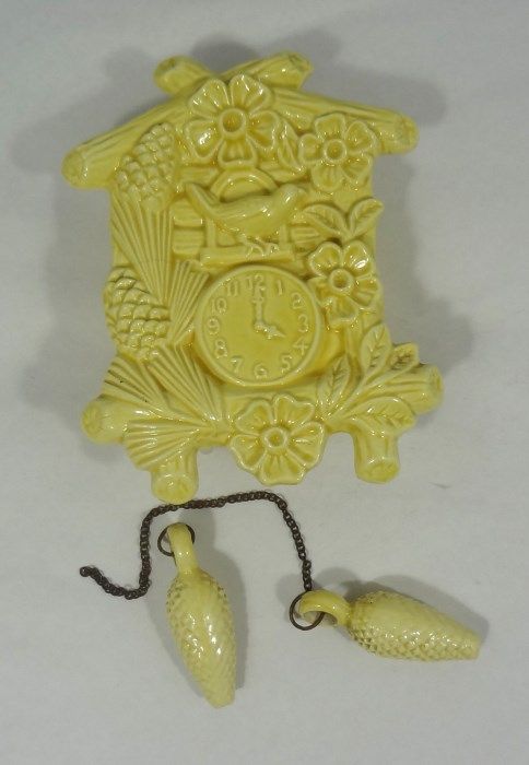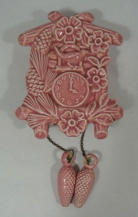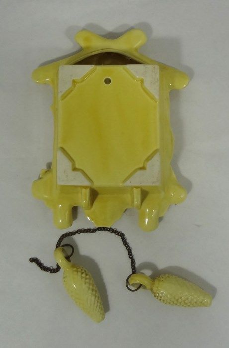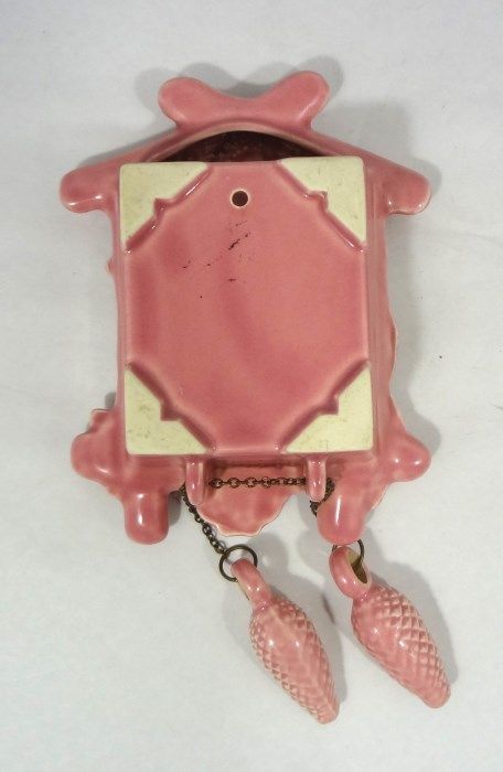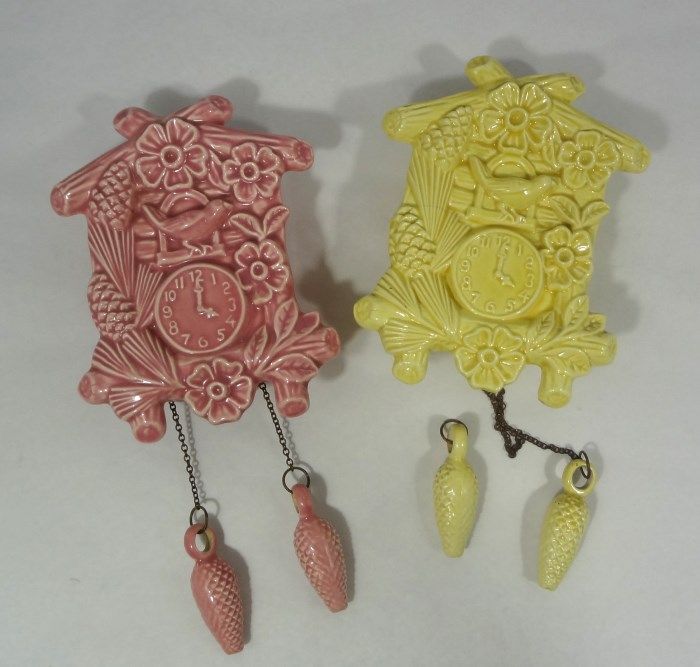2-Vintage Pottery Cuckoo Clock Wall Pockets in this lot. One is pink in color and one is yellow in color; both in great shape. The yellow clock has a hairline crack. Neither piece is signed. They measure 7" tall and 6" at the widest part. Est Value $50.00-80.00