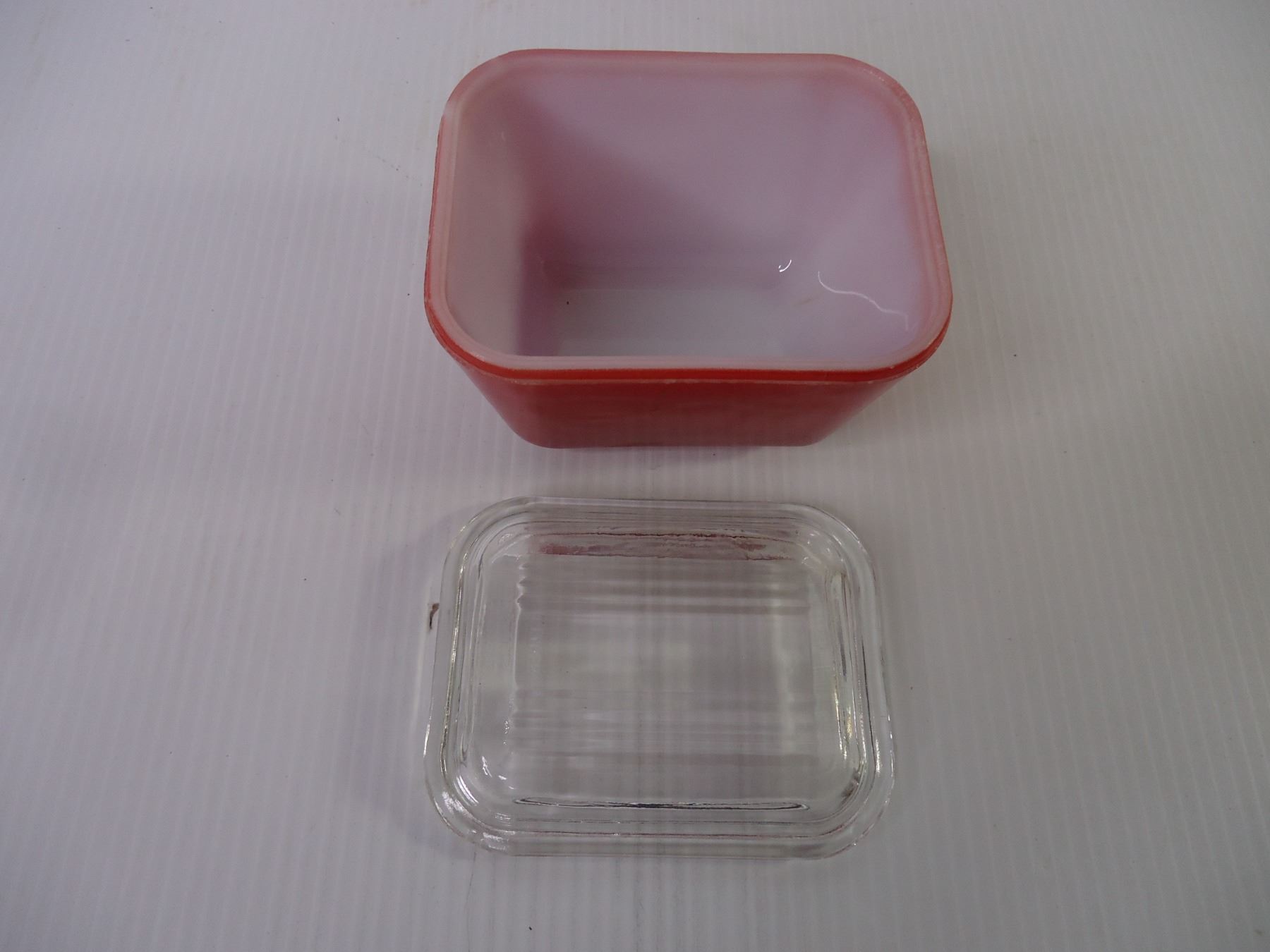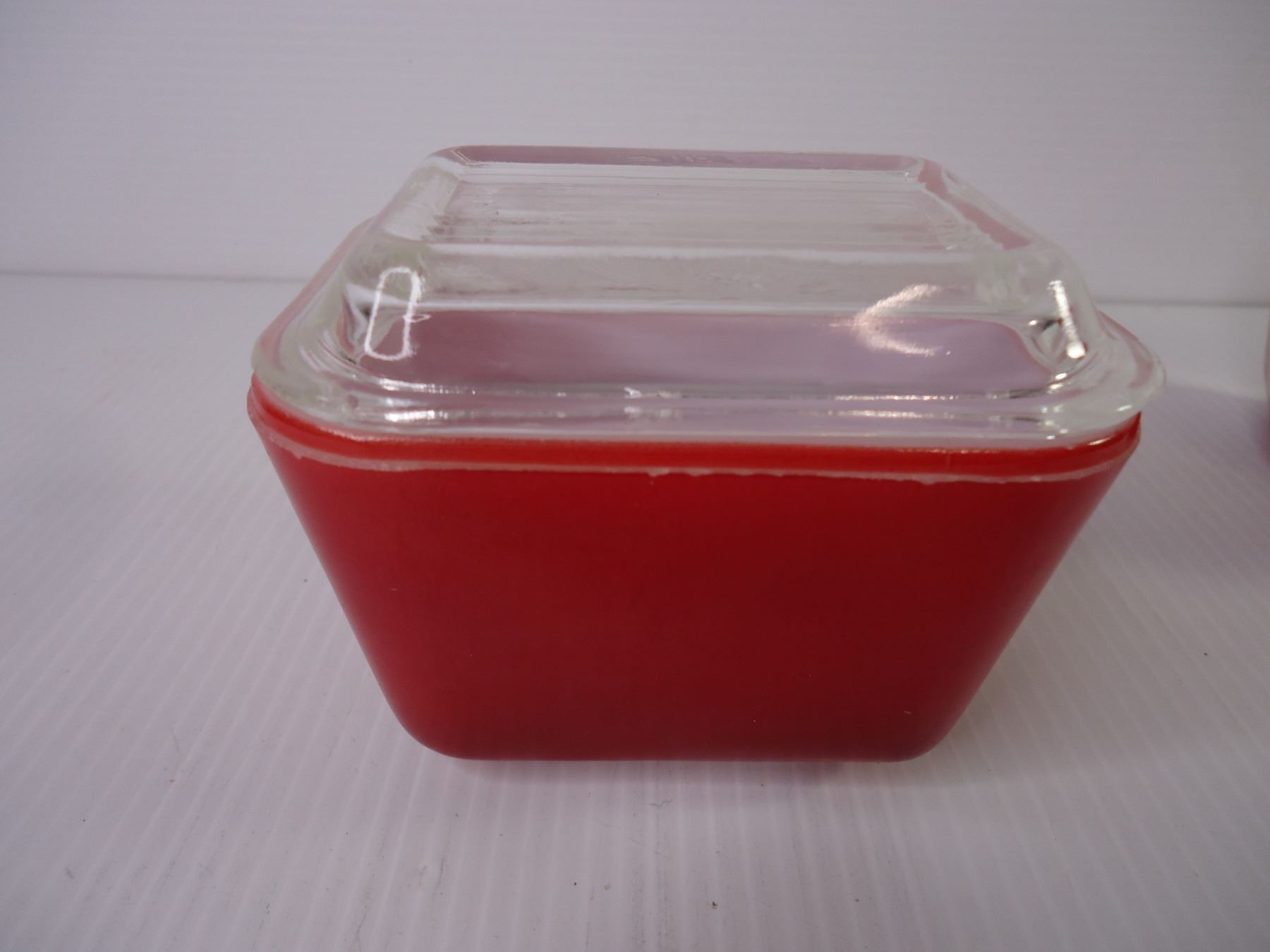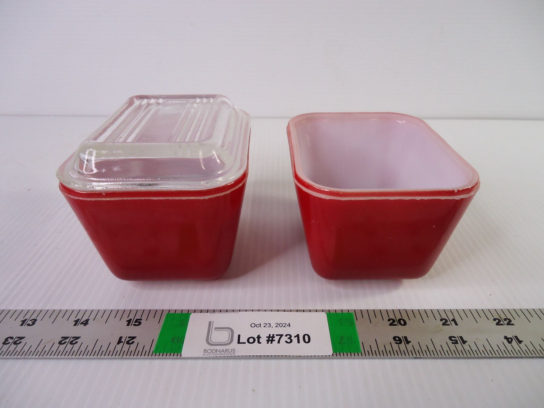 (2) Vintage Pyrex Red Refrigerator Dish with Ribbed Lid- the other has no lid