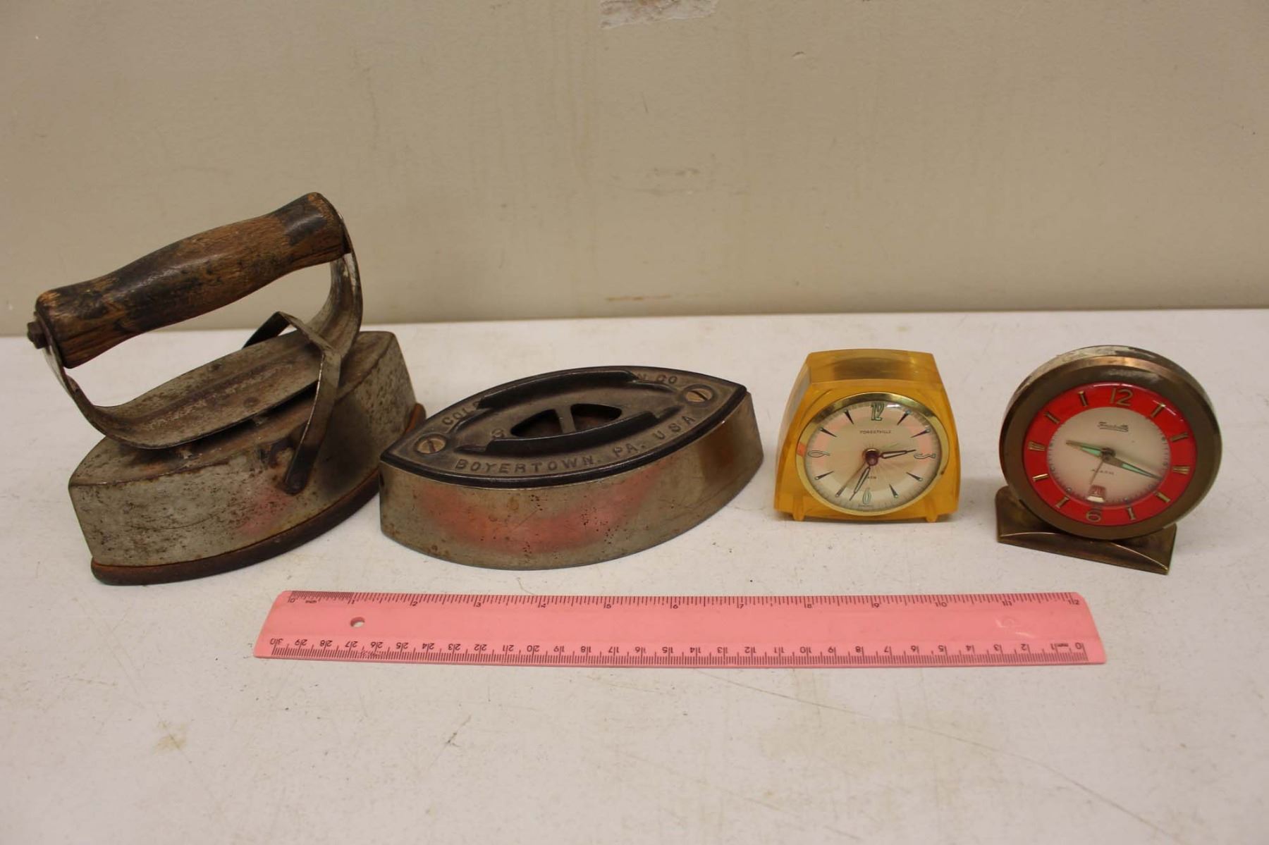 (2) Vintage Sad Irons, (2) Vintage Alarm Clocks