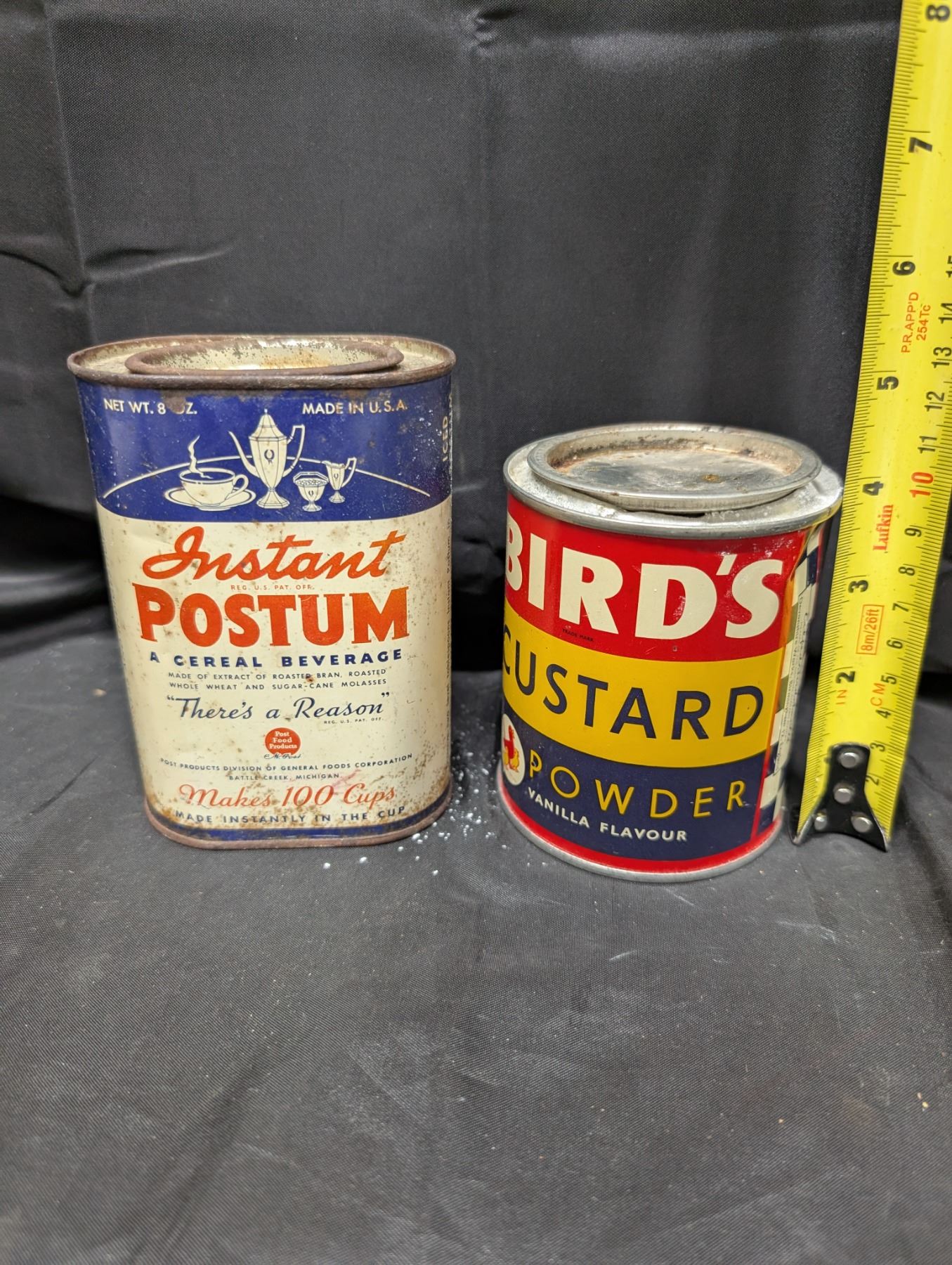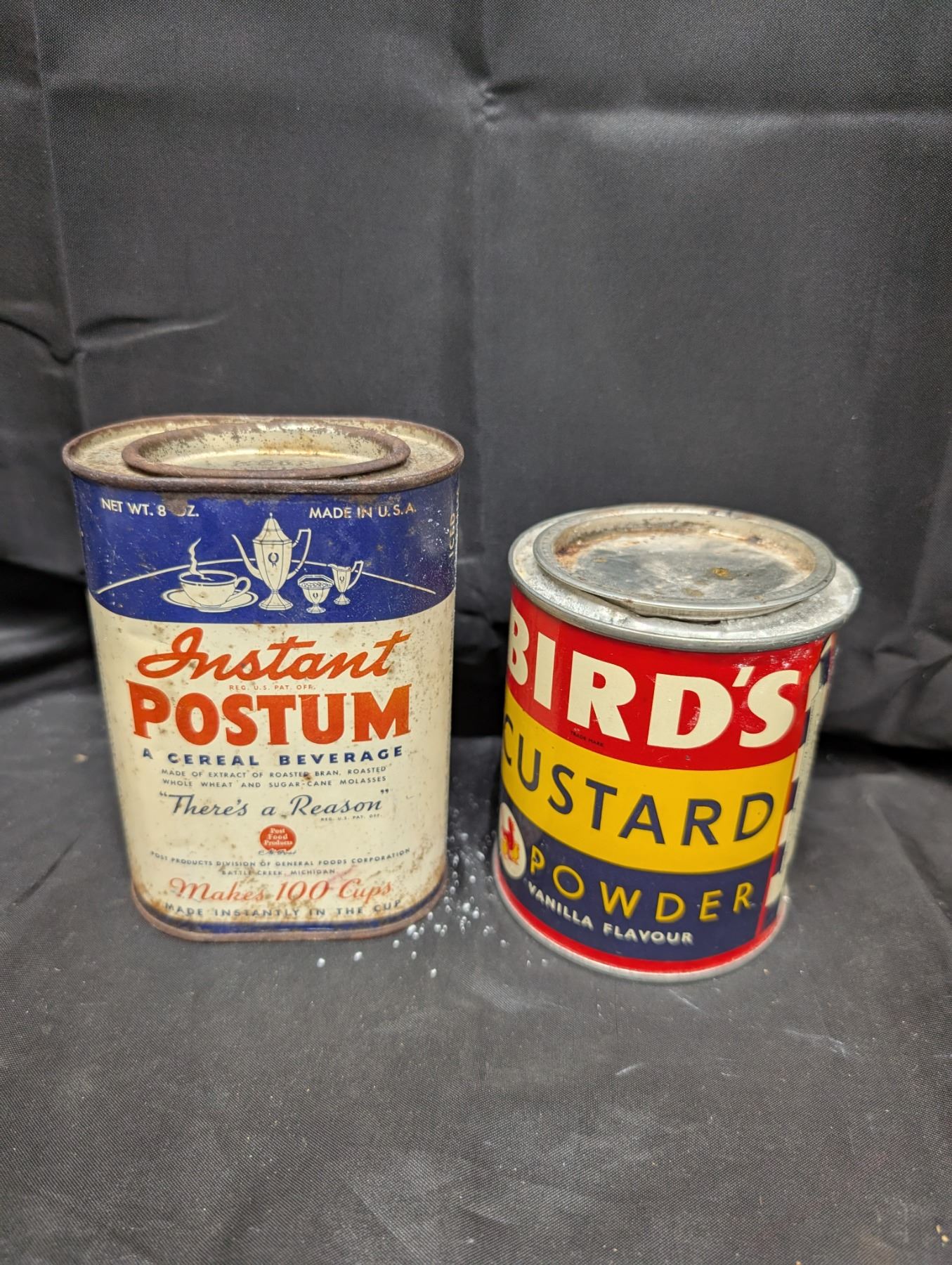 (2) Vintage Tin Cans (1) Full of Birds Custard and (1) Instant Postum