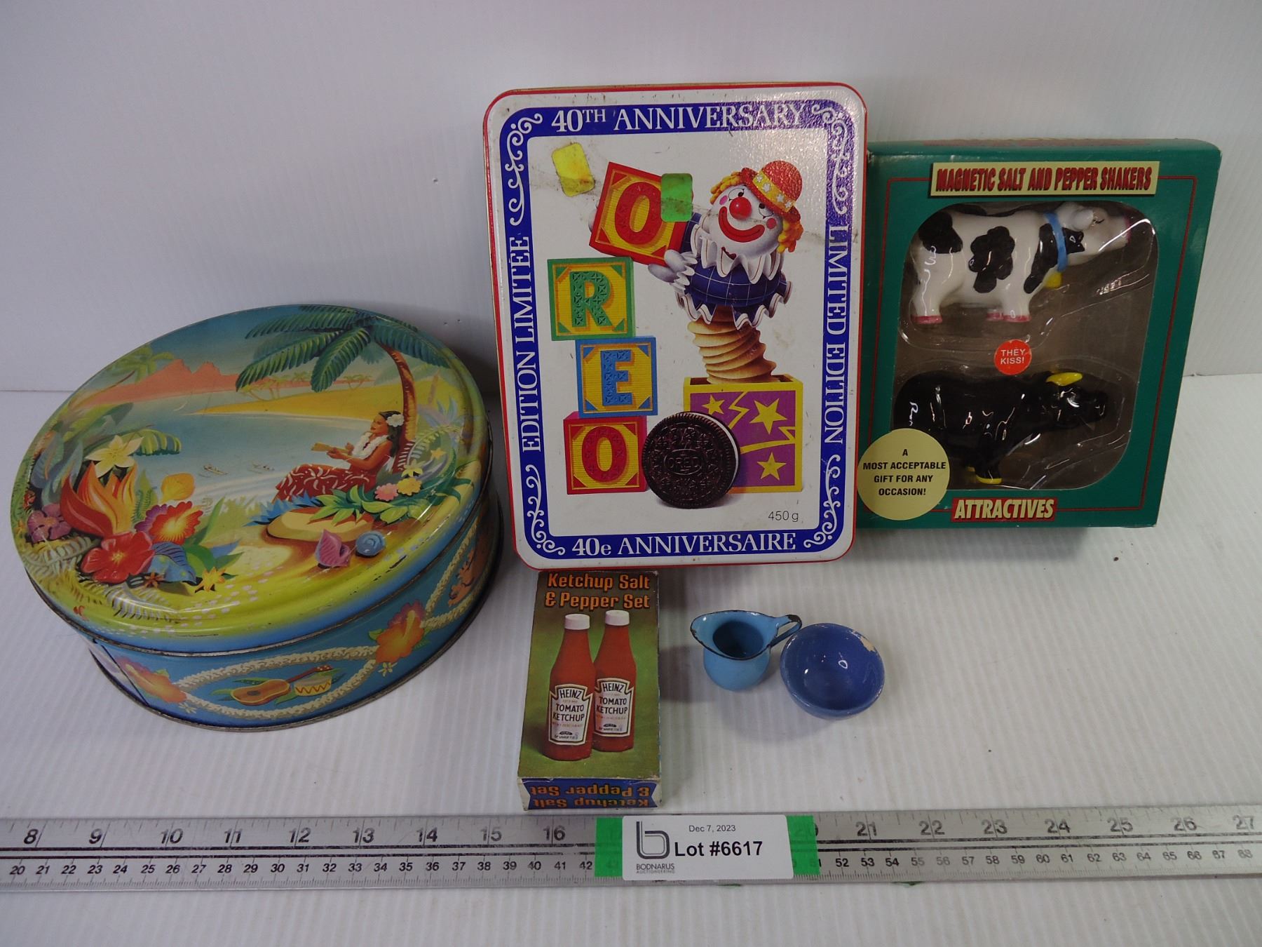 (2) Vintage Tins and (2) Salt/Peppers and (2) Miniatures