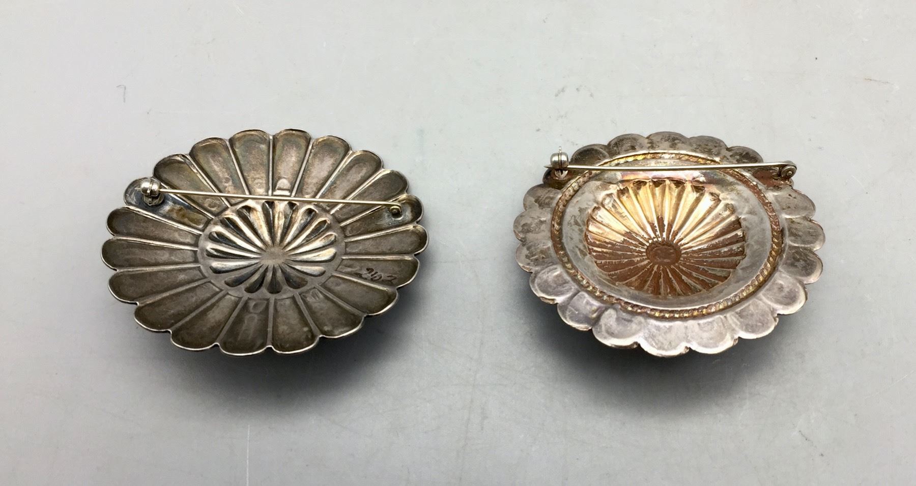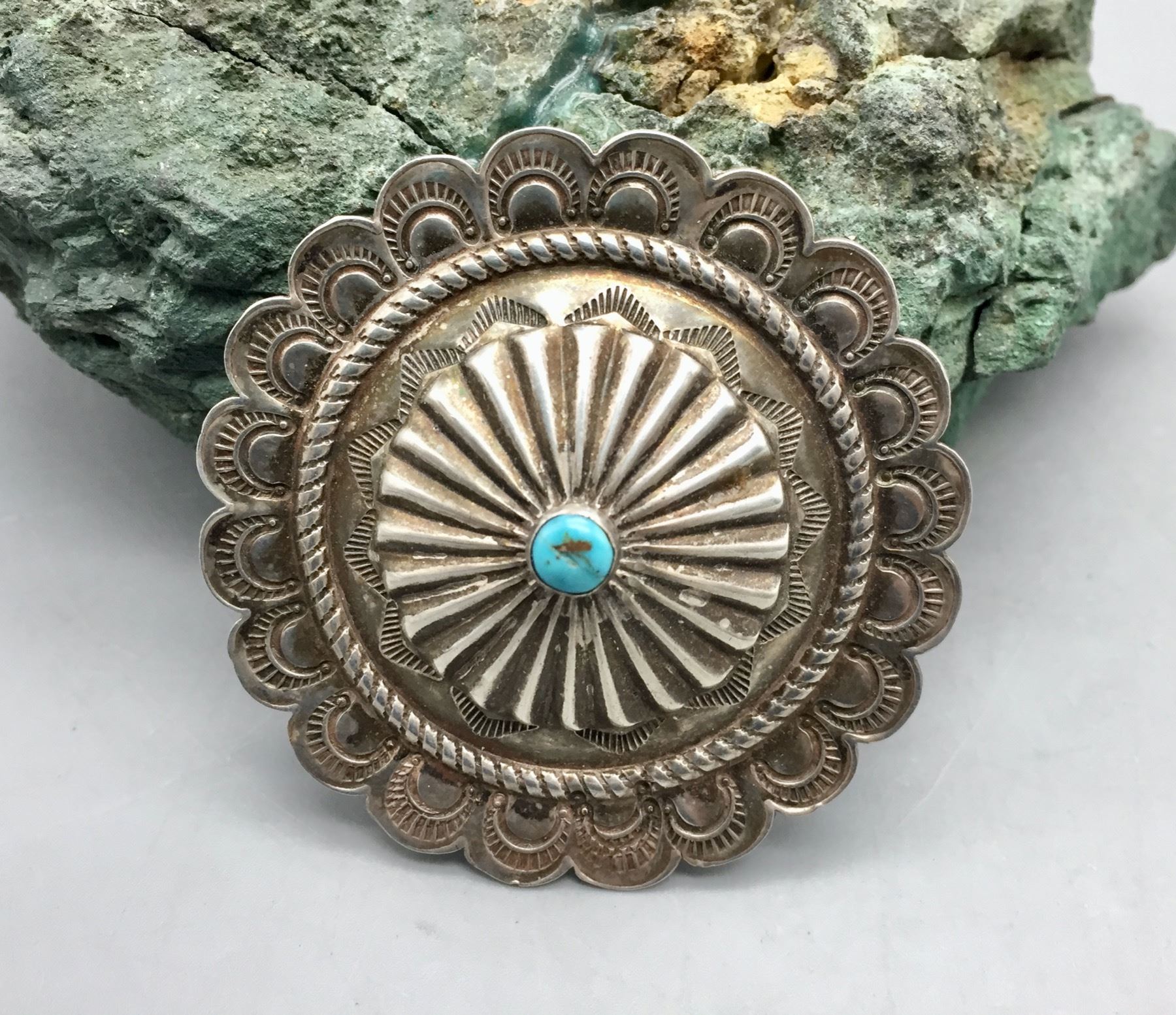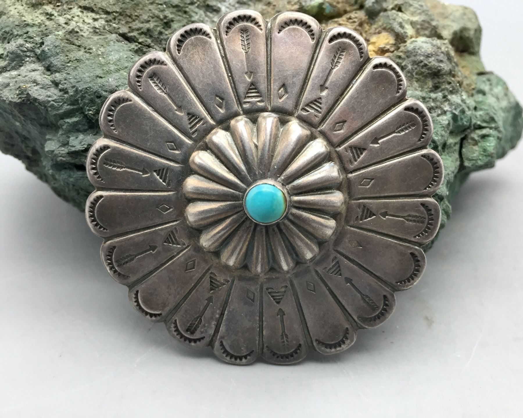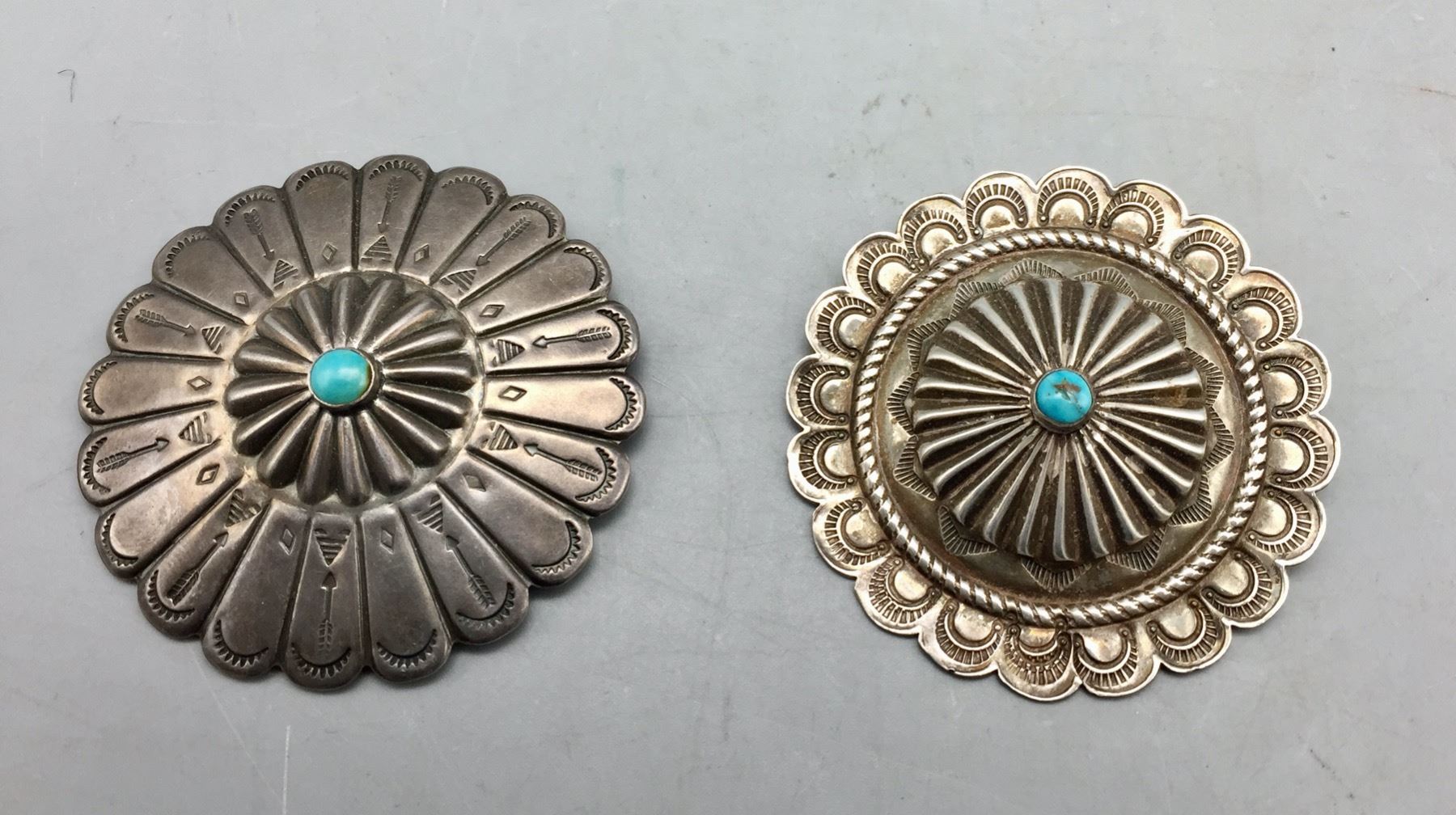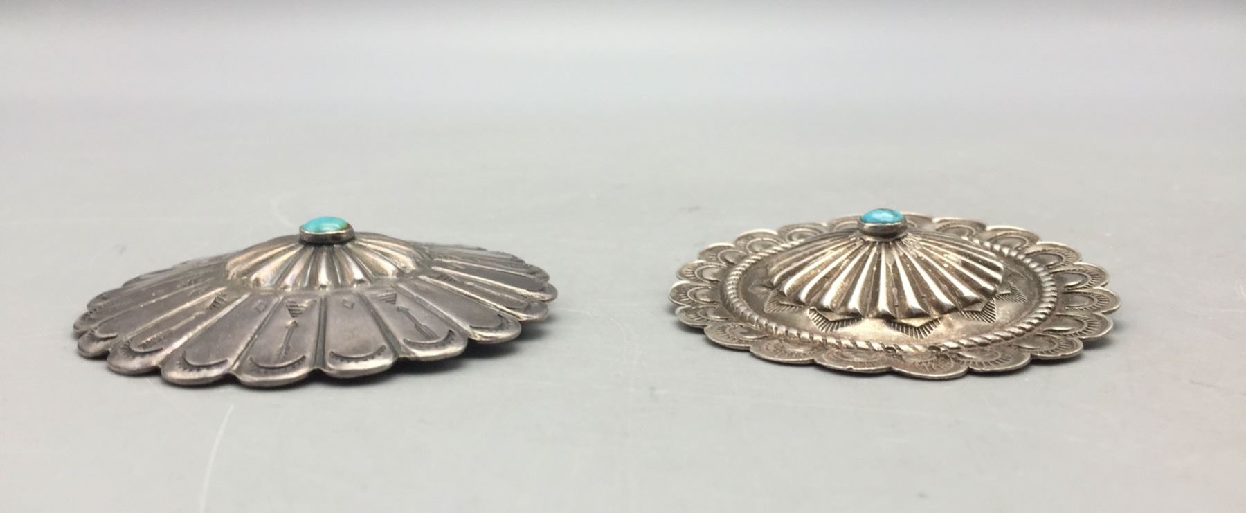 Description: Offered for sale in this lot are two vintage concho style pins. Each has unique stamp work and are sterling silver. Maker: Various. Approx. Age: Vintage. Size: Various combined weight is 40.7 grams. Condition: Good for its age, normal wear expected. Please look closely at the pictures - they are an important part of our description. Shipping: There will be a $5 handling / packaging fee for shipping this lot. The actual cost of postage will be added on top of that.