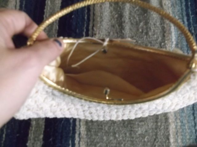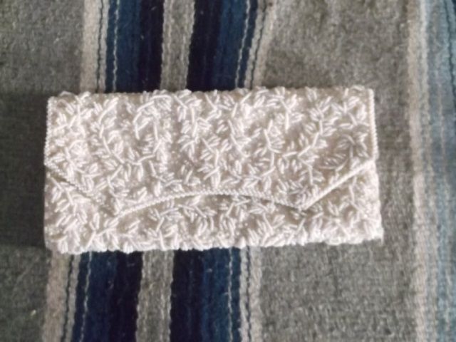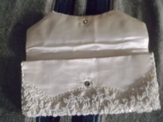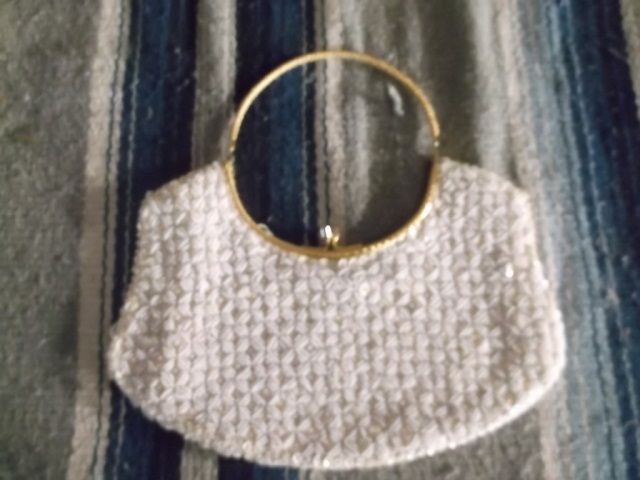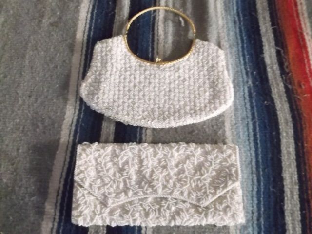 One has a curved gold tone metal handle with pearl beads approx. 11" x 8", the other is a La Regale Ltd. pearl beaded clutch hand made in Hong Kong approx 10" long X 5" high tracking # 111 & 100