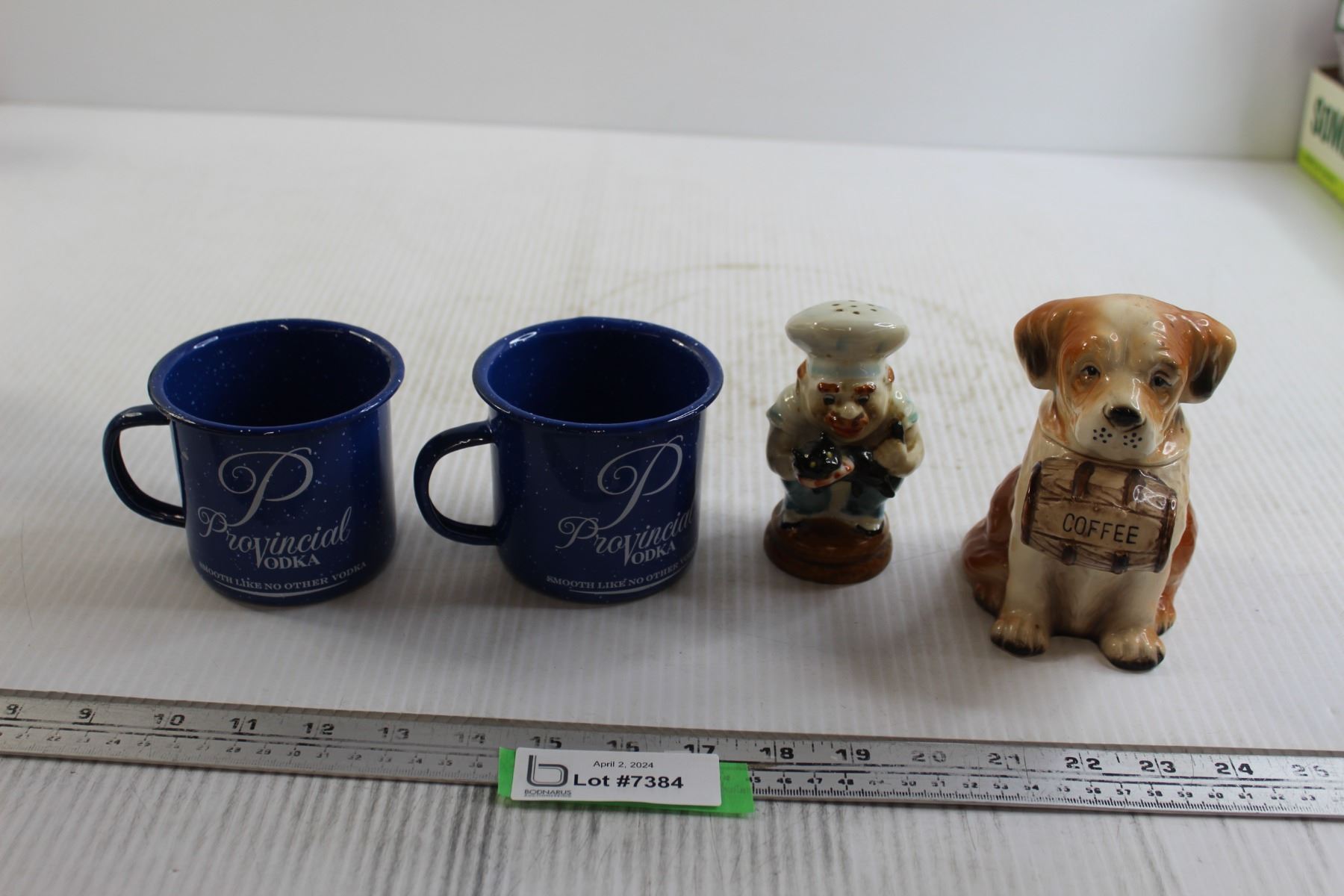 (2) Vodka Mugs, Cat and Chef Shaker, Puppy Coffee Ground Holder