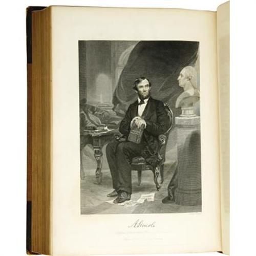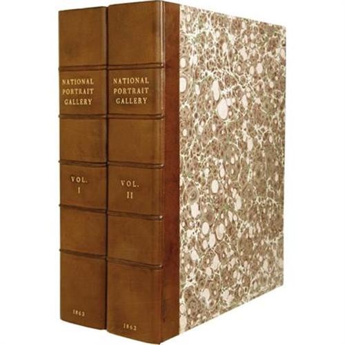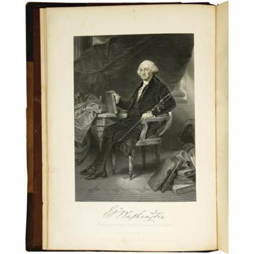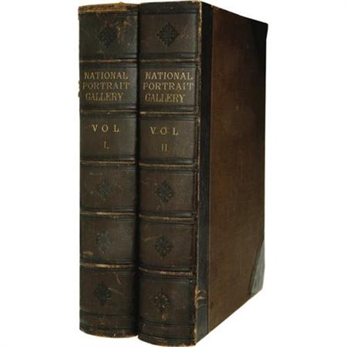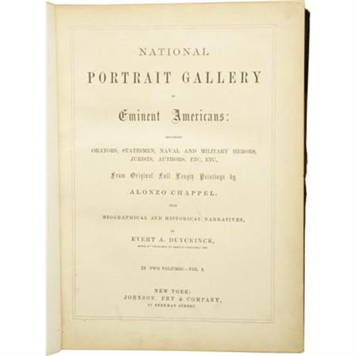 <B>Two Volume Quarto Set of <I>National Portrait Gallery of Eminent Americans:</B></I></B></I> <I>Including Orators, Statesmen, Naval and Military Heroes, Jurists, Authors, Etc., Etc., from Original Full Length Paintings by Alonzo Chappel with Biographical and Historical Narratives, by Evert A. Duyckinck.</B></I> (New York: Johnson, Fry & Company, 1862), two volumes, 488 pages & 470 pages respectively, half leather with five raised spine bands as well as gilt spine lettering, 4to (8.5" x 11.25"), housed in a sturdy custom leather-backed slipcase with marbled paper boards. All edges gilt. Evert A. Duyckinck was a prolific editor of historical American reference works in the mid 19th century, and this National Portrait Gallery collection is among his best and most favored works. Contained herein are over a hundred striking steel engravings of various famous American historical personages plus brief biographical sketches by Duyckinck. The set presented here is in about very good condition, with some noticeable wear to the leather on both volumes, bumped corners, and mild rubbing to the boards of each as well. The binding is tight on each volume, with minimal off-setting of the engravings, confined mostly to the protective tissue adjacent to each illustration. The text shows scattered foxing in small areas, but is overall very clean. This set of <I>National Portrait Gallery of Eminent Americans</B></I> is a real feast for both the mind and the eye for any fan and/or collector of American history.<BR><BR><b>Shipping:</b> Books & Catalogs (<a target="_blank" href="http://www.heritageauctions.com/common/shipping.php">view shipping information</a>)