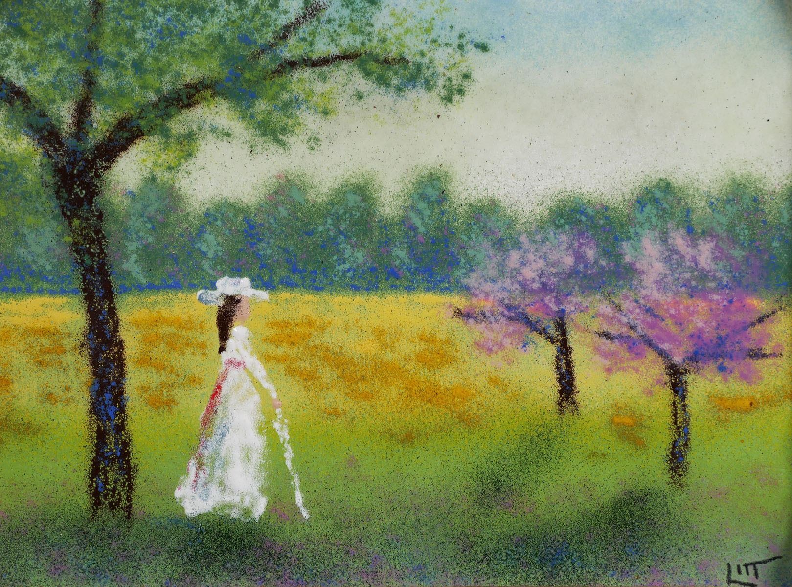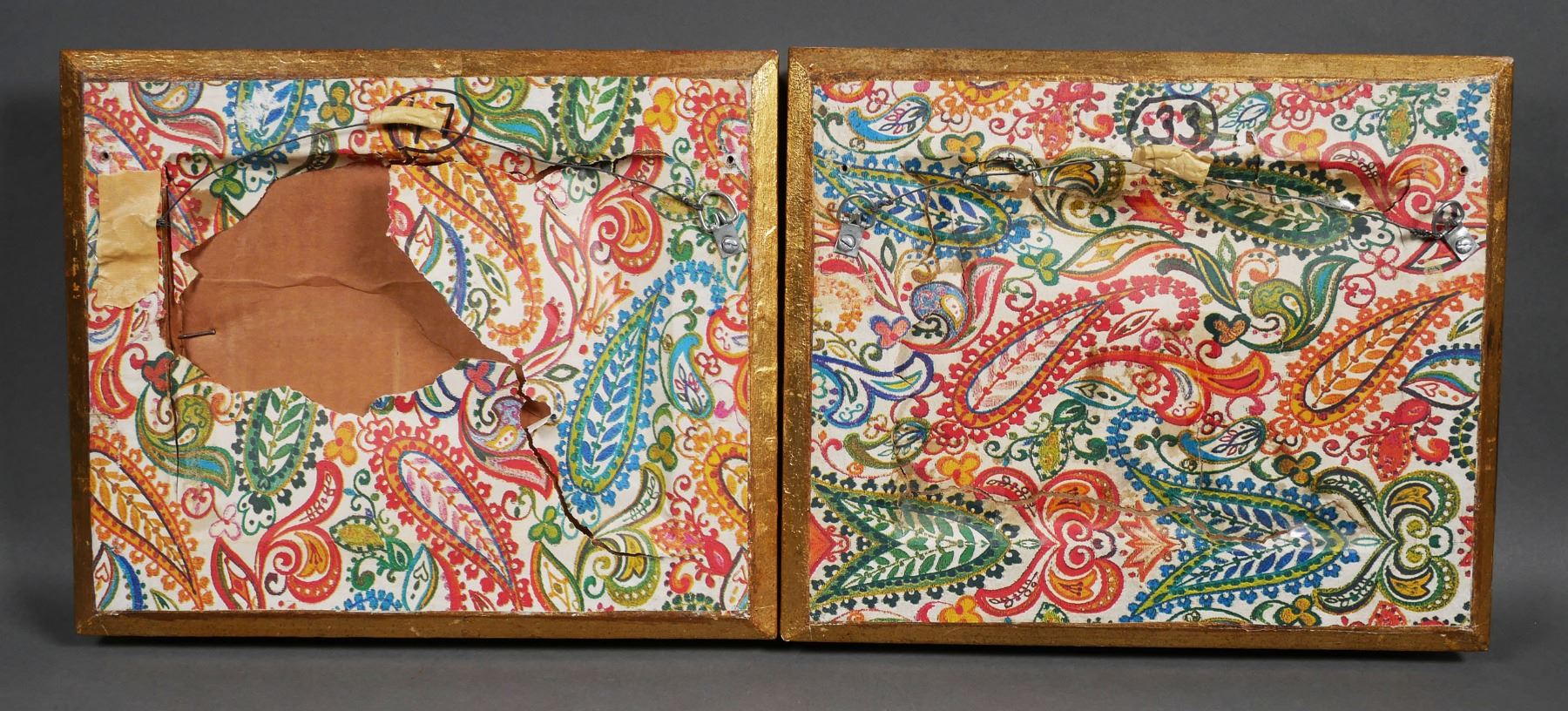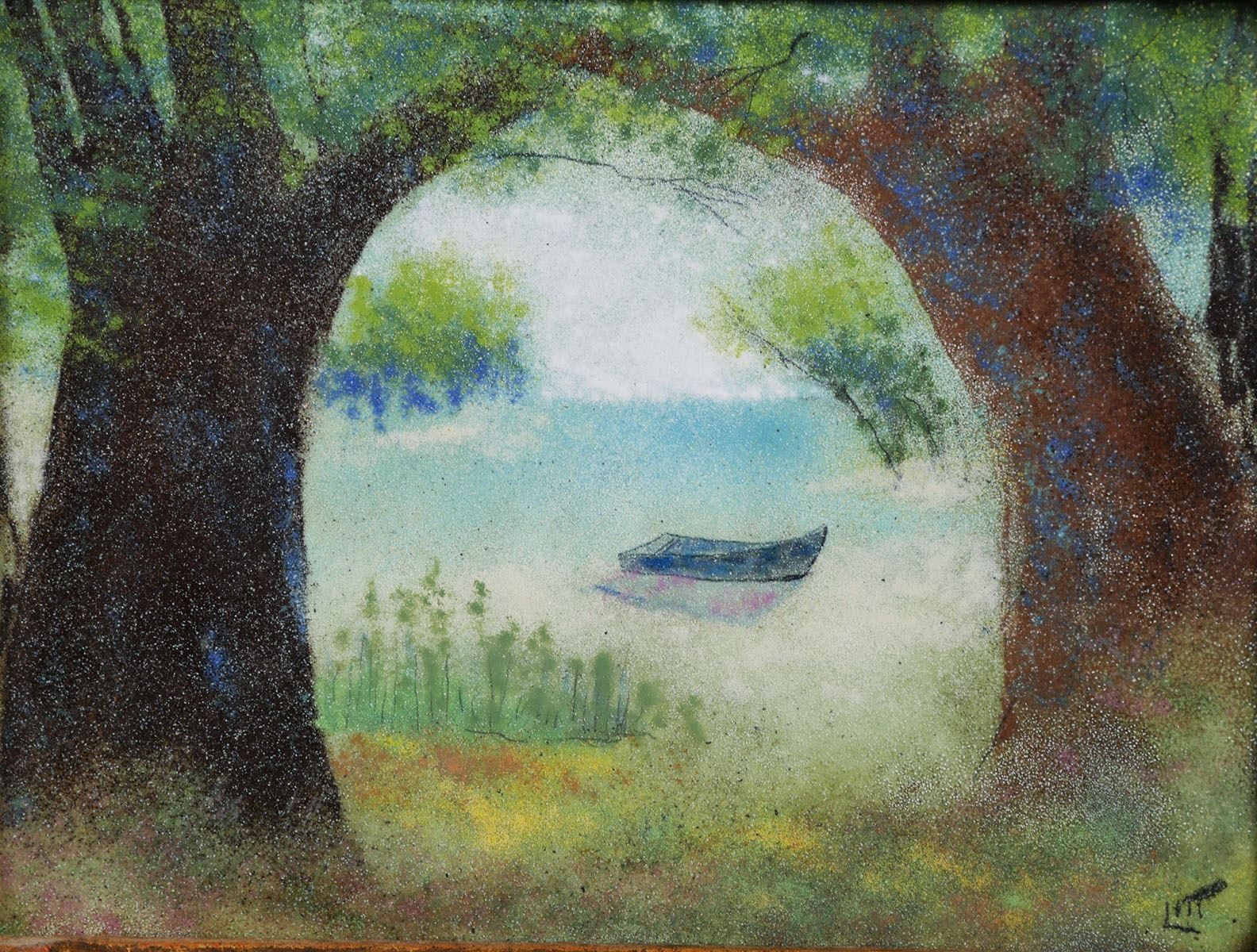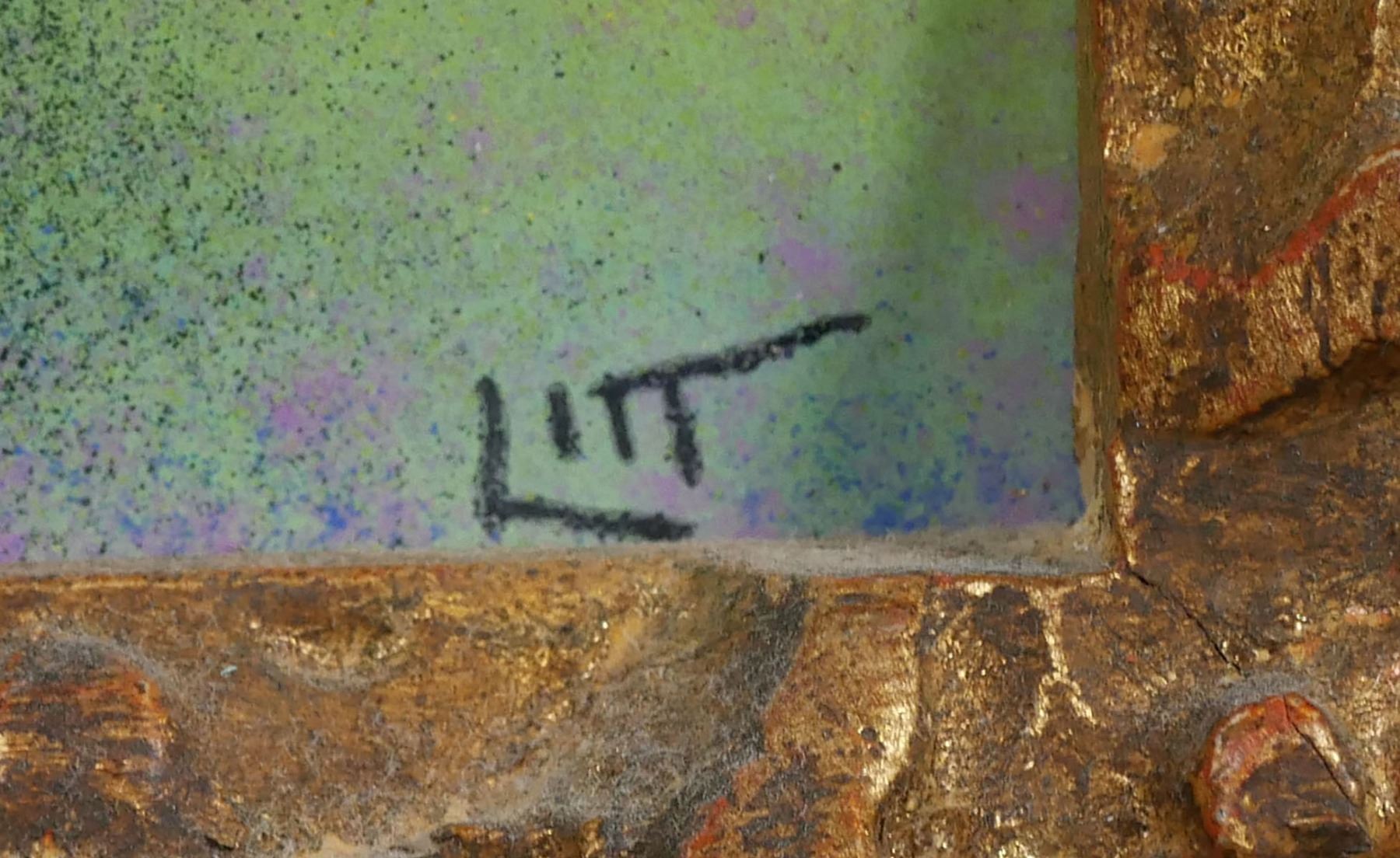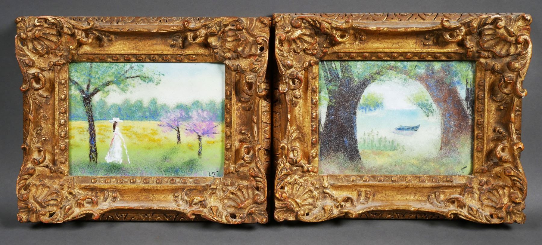 Pair of enamel on copper landscape wall hangings by Walt Litt. Each signed "Litt" in the enamel and contained in ornate gilt frames. Overall size incl frames, 10" x 12".