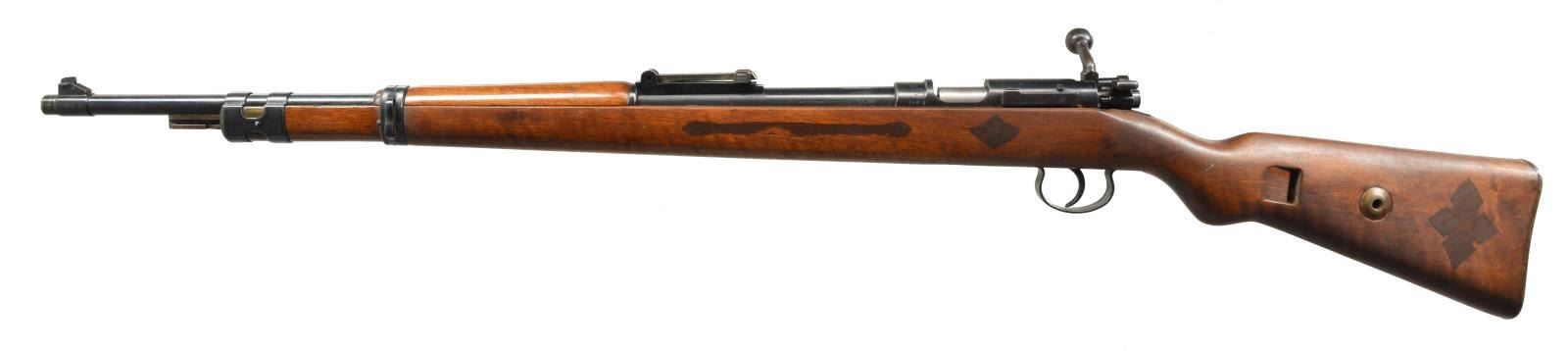 BOTH: Cal. 22 LR. 1) WALTHER KKW TRAINING RIFLE. S# 338S. Bbl. 26". Receiver ring marked on top w/ “WALTHER” banner. Receiver bridge marked on top w/ “KK Wehrsportgewehr” & marked on right side “WAFFENFABRICK WALTHER ZELLA-MEHLIS”. “B”, “G”, & “U” proofs on bbl. & receiver. Tangent rear sight graduated to 200m. Inverted V front sight. Bayonet lug. Cleaning rod is not present. Dbl. strap upper band. Lower band has provision for side sling. Walnut stock set. Buttstock has sling mortise & metal take down hole. CONDITION: stock set has areas of refinish w/ geometric designs fitted filled w/ wood filler on both sides. Stock has light wear, dents & scratches throughout. Metal retains 75% of original blue w/ wear, scratches & handling marks. Very good, shiny bore. (20-1607/RW). 2) WALTHER SPORT MODELL RIFLE. S# 42353w. Bbl. 25.5". Second Model rifle w/ grooved receiver. Receiver marked on top of bridge in German script “Waffenfabrik Walther Zella – Mehlis Thuringen”. Left side of receiver ring has Eagle “N” proof. Bbl. marked on top w/ “WALTHER” banner, “Sport Modell”, Eagle “N” proof. “KAL. 22 LANG FUR BUSHSEN”. Tangent rear sight graduated to 200m. Inverted V front sight has stacking rod. Lower bbl. band has side & bottom swivels. Walnut stock set. Buttstock has mortise for side sling. Plastic trigger guard appears to be later style replacement. CONDITION: stock has light wear, staining & handling marks. Stock has mineral inclusion in grain, common in European walnut which gives the impression of a crack in photographs. Metal has 90% original blue finish w/ light high point wear. Very good, shiny bore. (20-1610/RW). BOTH CURIO. $800-1,200.