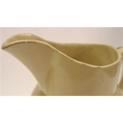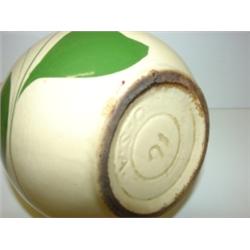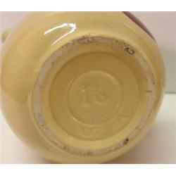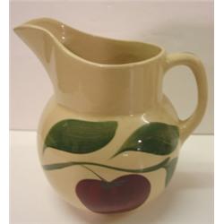 2 WATTWARE PITCHERS. Apple pattern pitcher is in excellent condition and stands 6.5" H. Marked on bottom "16-U.S.A." Floral pattern pitcher shows signs of crazing and wear around spout with small chip on bottom edge of base and stands 6.5" H. Marked on bottom "16-U.S.A."