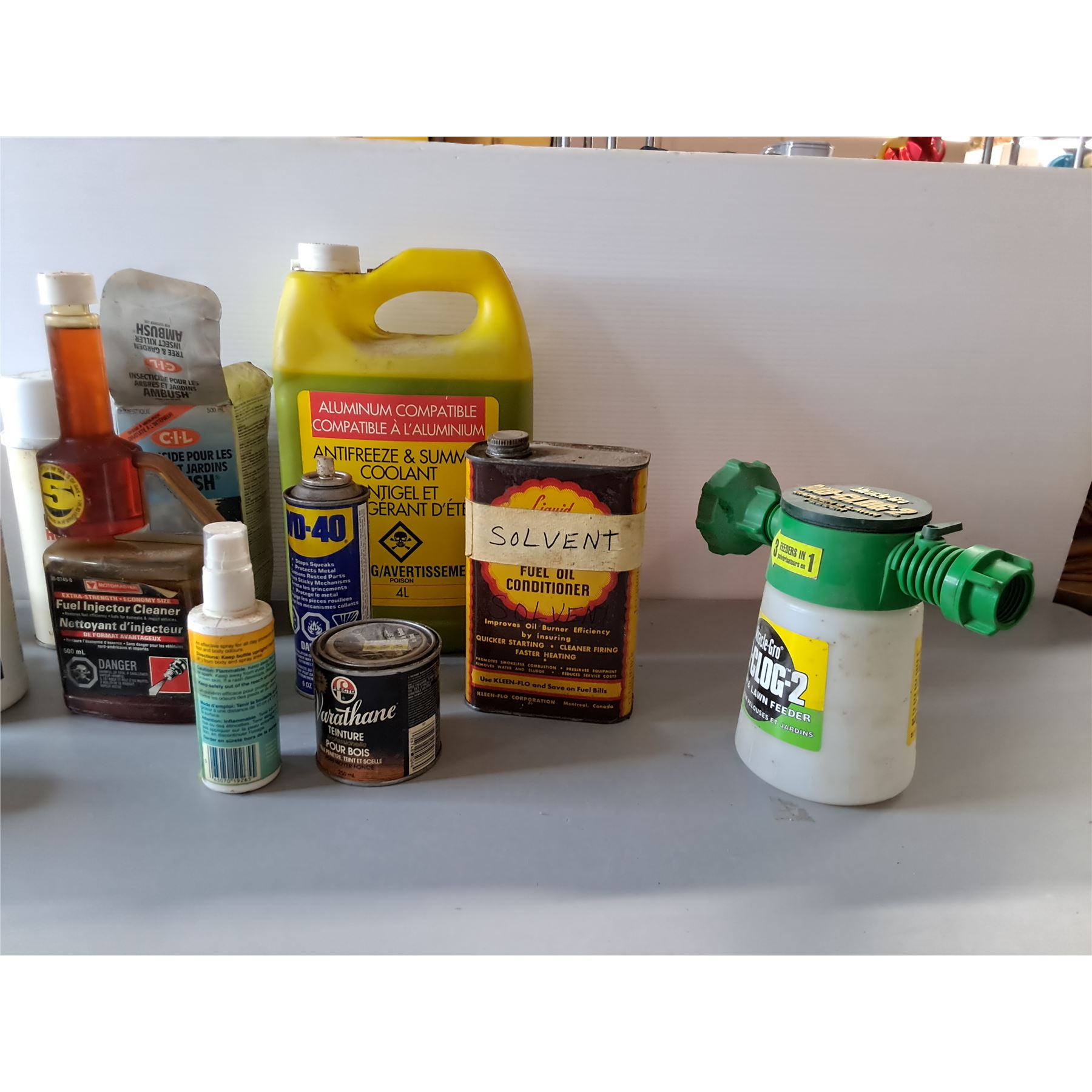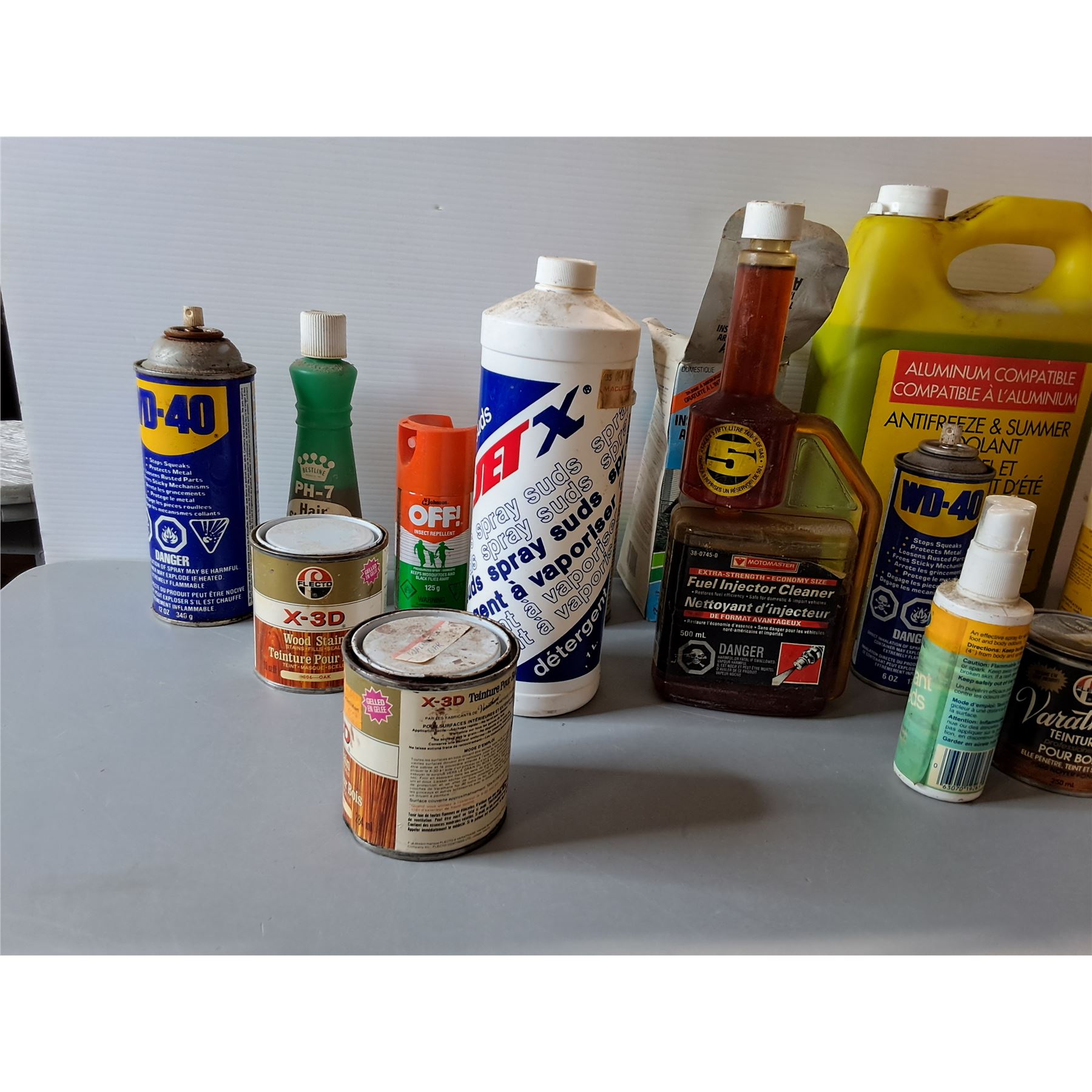 (2) WD-40, PH-7 Hair Shampoo, (3) Wood Stain, Antifreeze, Fuel Injector Cleaner, Misc- Cannot Ship