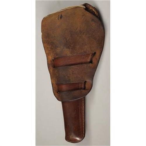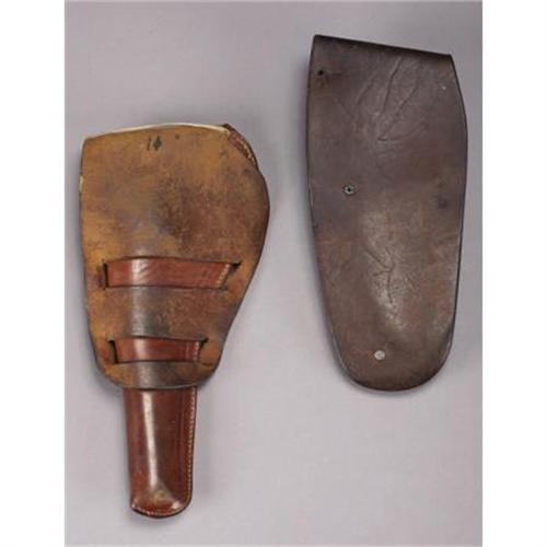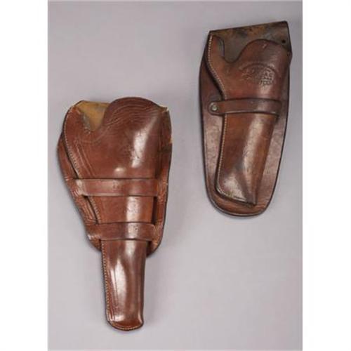 <B>TWO WESTERN STYLE HOLSTERS</B></I> - <BR> a) Montgomery Ward & Company marked; Double loop catalogue holster with ½ skirt and stitched muzzle; Labeled for 44 x 7½”; Excellent condition with good light color <BR> b) El Paso, Texas Revolver Holster; Shelton-Payne-Arms- Company marked single loop holster for a 4¾ Colt single action. Plain leather with riveted loop. Circa 1930's; Very good condition; Nice color; Hole in top of skirt<BR><BR><b>Shipping:</b> Miscellaneous Collectibles, Smal (<a target="_blank" href="http://www.heritageauctions.com/common/shipping.php">view shipping information</a>)