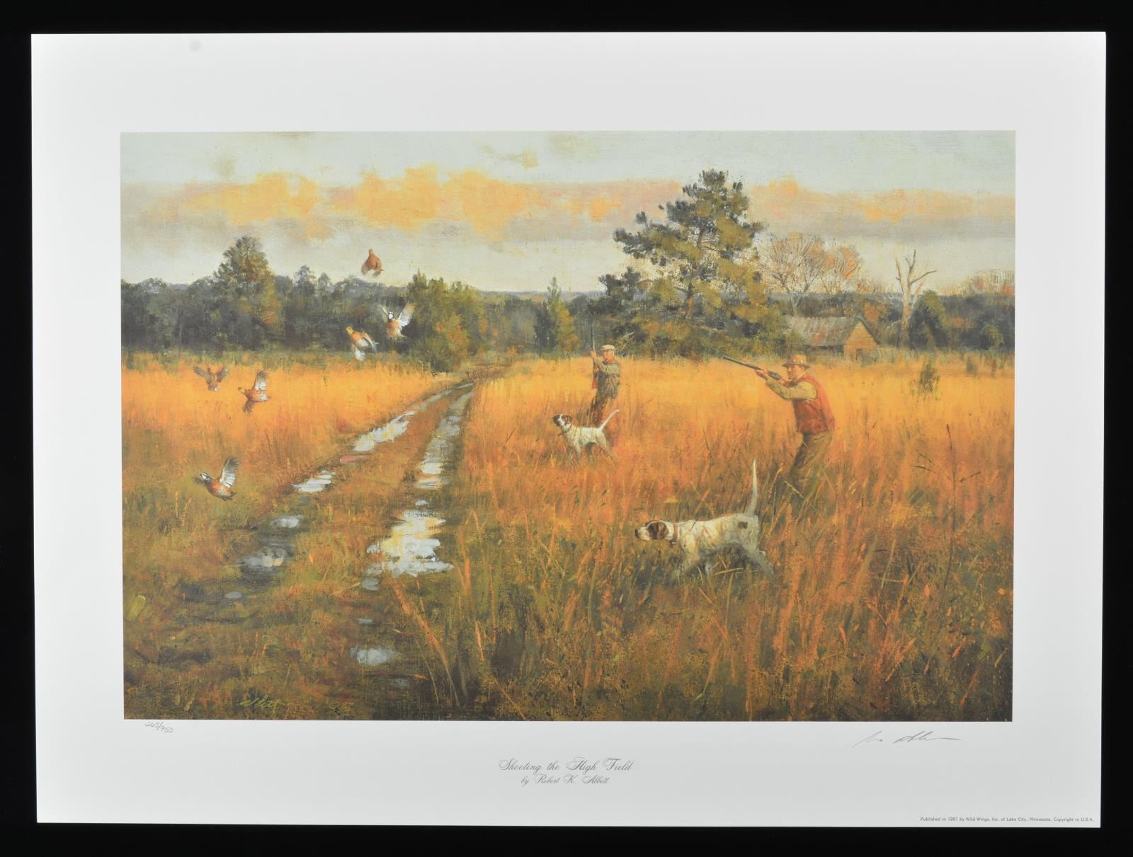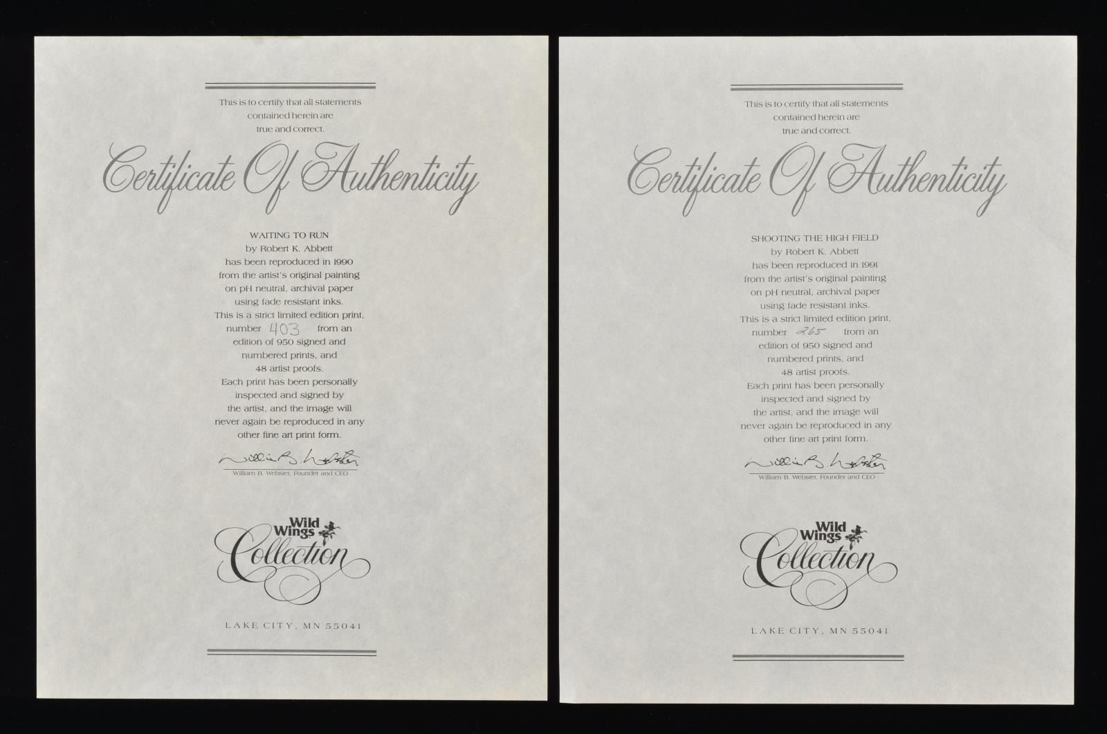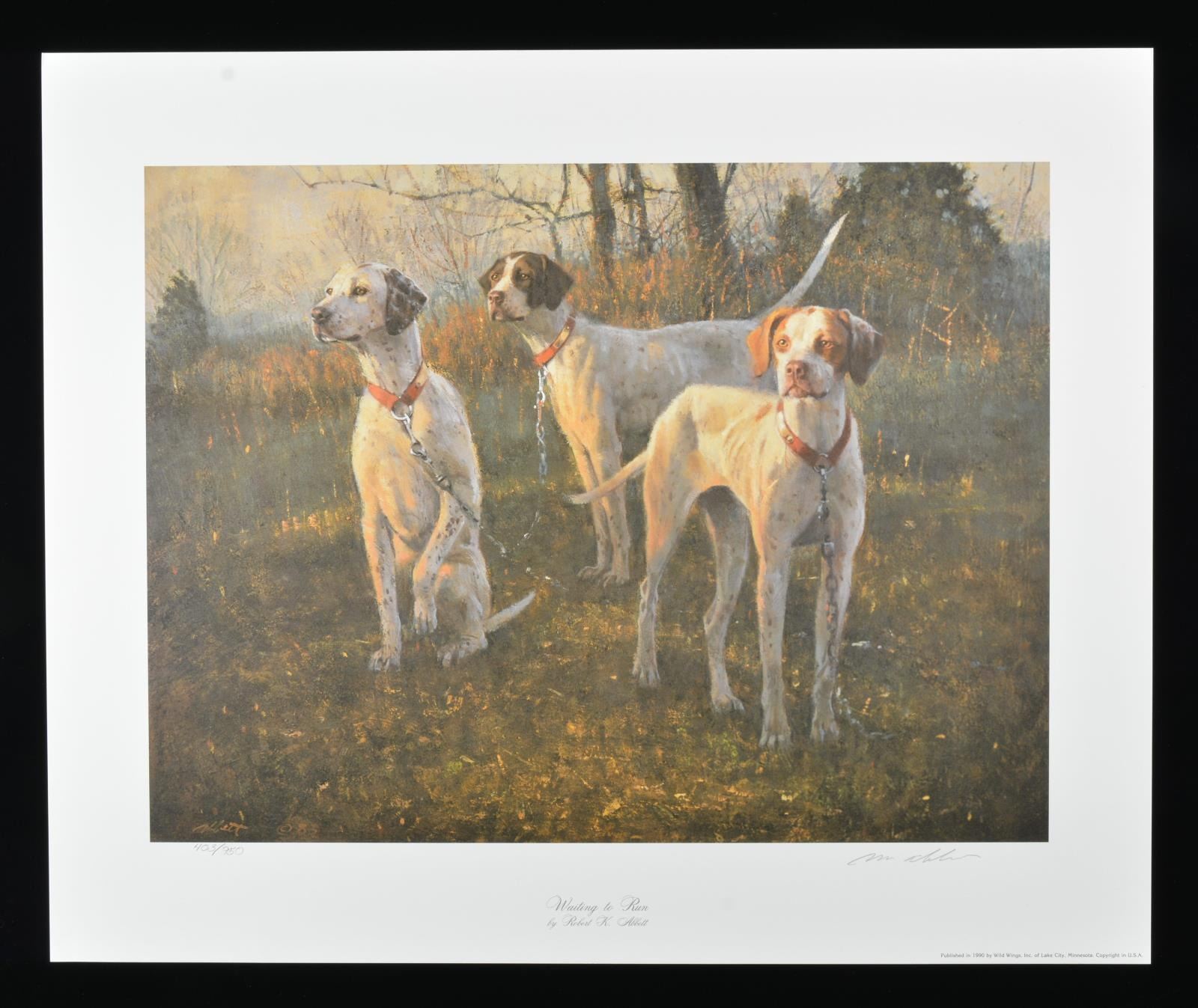 2 Wild Wings Hunting prints signed by the original painter: Robert K. Abbett (includes Wild Wings certificate of authenticity). Images are each 16-1/2" X 22-1/2" w/ 2-1/2" plain borders; reproduced from original paintings on special paper 1) "Shooting the High Field" (1991) as ltd. edition #265 of 950. It depicts dogs & game birds in lg. open area. 2) "Waiting to Run" (1990) as ltd. edition #403 of 950. This one depicts 3 bird dogs at the ready w/ chained collars. CONDITION: appears new & not previously framed. PROVENANCE: From the Collection of Thomas B. & Freeda Harper Jr. (02-16571/NW). $500-800.