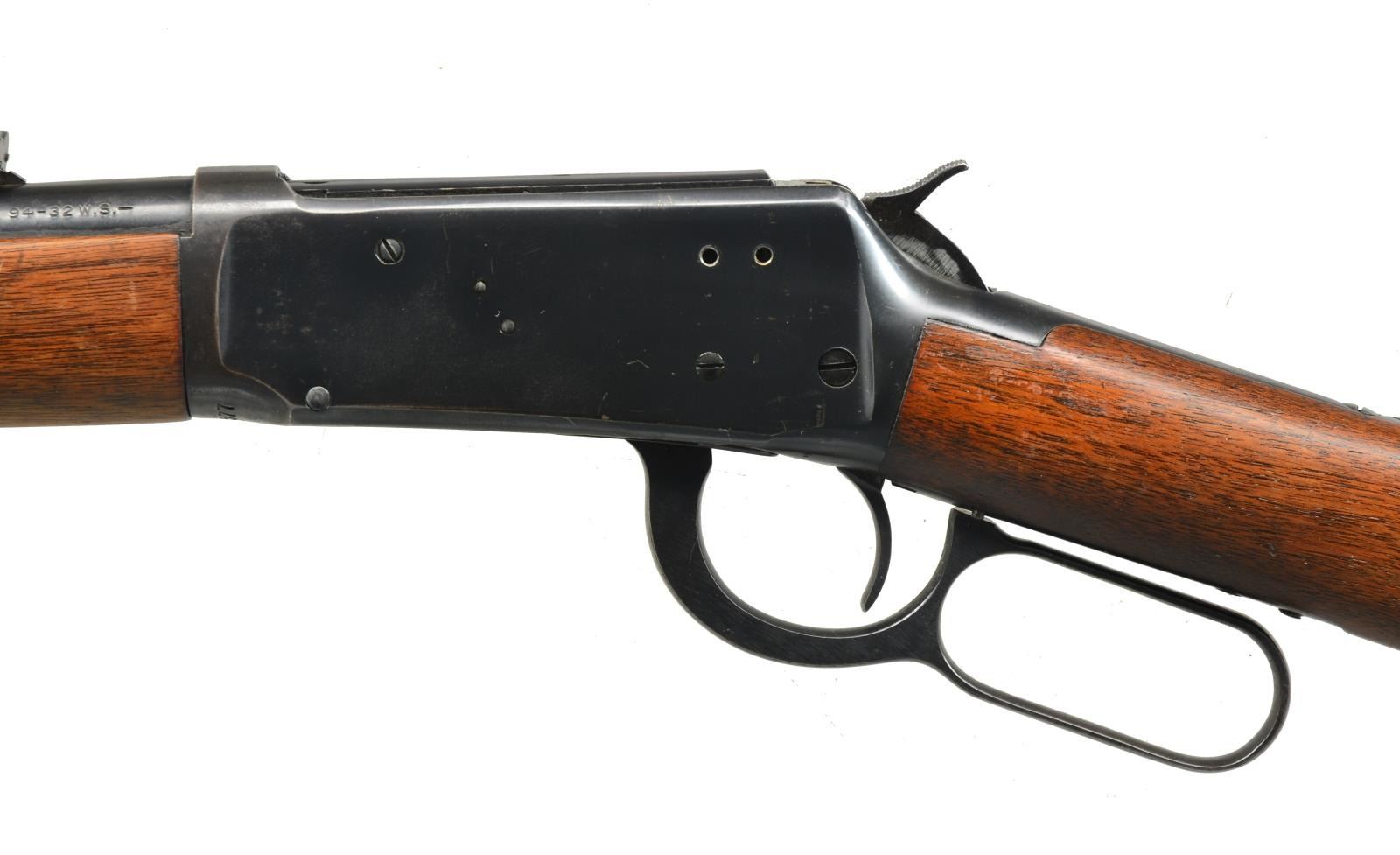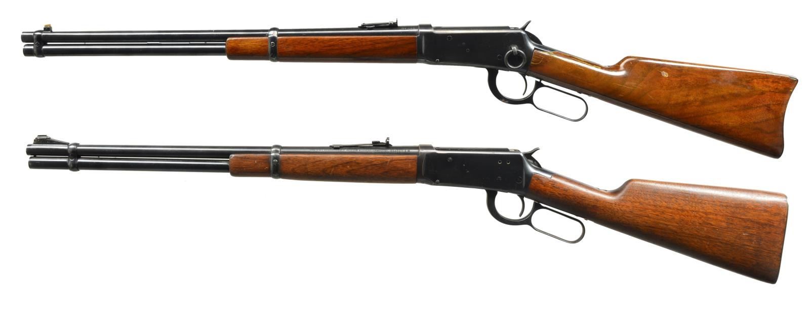 1) 1894 SRC. Cal. 38-55. S# 461313. Bbl. 20" w/ replacement brass pinned blade front sight & adj. carbine rear sight. Action has saddle ring on left side. Long wood forearm & straight grip walnut stock w/ carbine steel buttplate. 1908 Mfg. CONDITION: bbl. & action retain 90% brightly polished reblued finish. Sanded & refinished forearm shows light marks. Refinished stock has cracking & peeling finish w/ chips on both sides of top tang. Dark worn bore. (20-2648/DS). 2) PRE 64 MODEL 94. Cal. 32 WS. S# 1644577. Bbl. 20" w/ ramp mounted bead front sight & sporting rear sight. Full length mag. Long wood forearm & straight grip walnut stock w/ checkering steel buttplate. Left side of action has 2 open holes for receiver sight attachment. 1950 Mfg. CONDITION: 85% lightly worn blue showing spots & corrosion. Wood has worn finish showing scratches & marks. (20-2824/DS). ALL CURIO. $600-900.