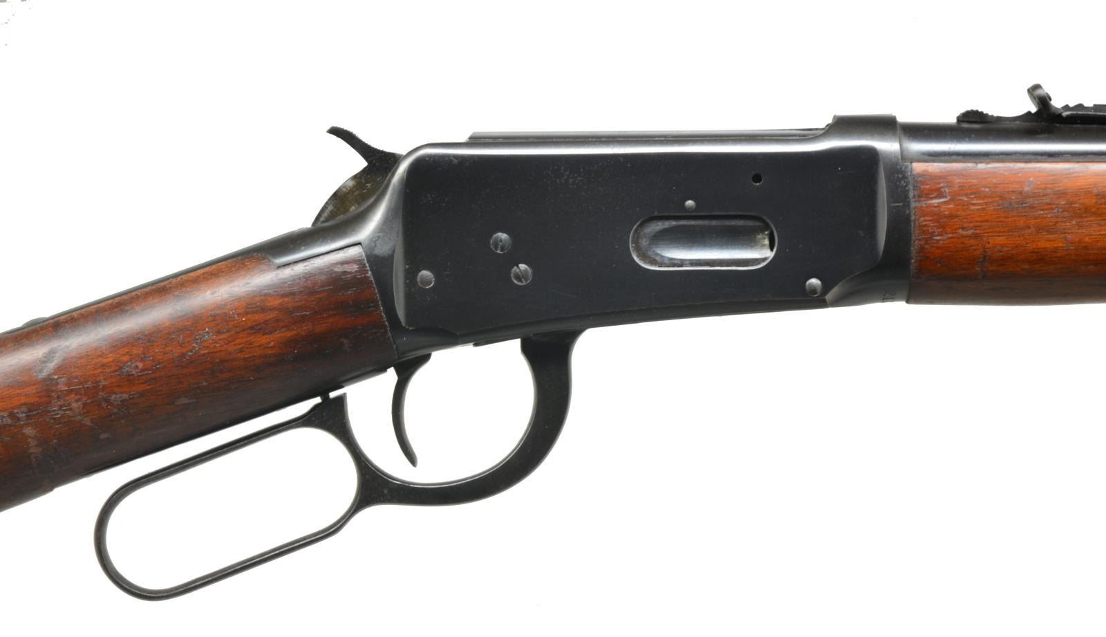 ALL: bbls. 20". Full length mags. 1) PRE 64. Cal. 30-30. S# 2106970. Ramp mounted bead front sight & elevator adj. sporting rear sight. Short wood forearm & straight grip walnut stock w/ checkered steel buttplate. 1955 Mfg. CONDITION: over 95% original blue showing area of sm. dents on left side of action. Front sight is bent. Original wood finish shows wear spots w/ numerous scratches, dents & handling marks. Bright bore w/ sharp rifling. (20-3450/DS). 2) WWII ERA. Cal. 30 WCF. S# 1293442. Ramp mounted hooded bead front sight & Marbles replacement rear sight. Longwood carbine forearm & straight grip walnut stock w/ grooved steel buttplate. Mfg. during the WWII era. CONDITION: bbl. & mag. tube retain 90% lightly faded blue. Action retains 70% blue fading to gray in carry areas. Wood has worn finish scattered light handling marks. Bore is bright w/ sound rifling. (20-3451/DS). ALL CURIO. $800-1,100.