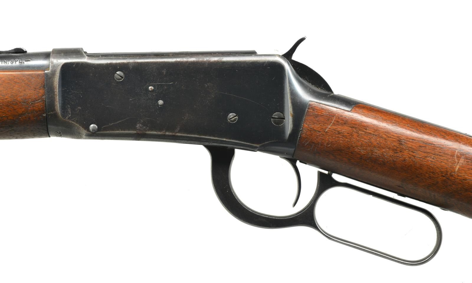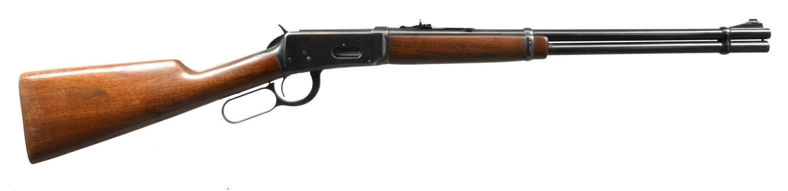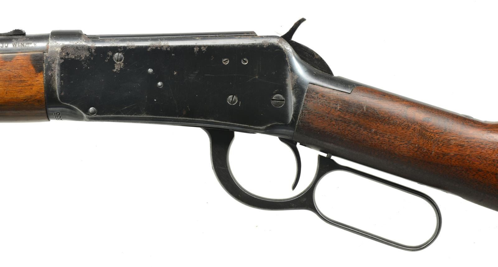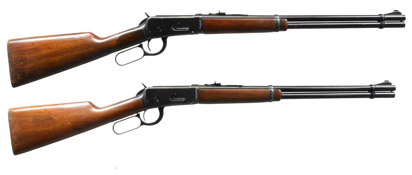 CARBINES. ALL: bbls. 20" w/ ramp mounted bead front sights & sporting rear sights. Full length mags. Short wood walnut forearms w/ straight grip walnut stocks having checkered steel buttplates. 1) Cal. 30-30. S# 1982333. 1953 Mfg. CONDITION: 80% lightly worn blue showing spots of corrosion & pitting left side of bbl. & mag. tube have a sm. area of abrasive cleaning. Stock has lightly worn finish w/ spots of peeling, scratches & marks. Bright bore w/ lightly worn rifling. (20-2825/DS). 2) Cal. 32 WS. S# 1862012. WWII Era mfg. CONDITION: 75% lightly worn blue showing spots of corrosion. Wood has worn & peeling finish showing scratches & marks. Bore is bright w/ strong rifling. (20-2826/DS). ALL CURIO. $600-900.