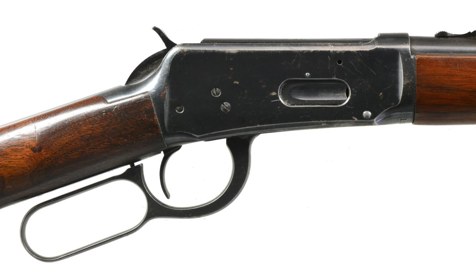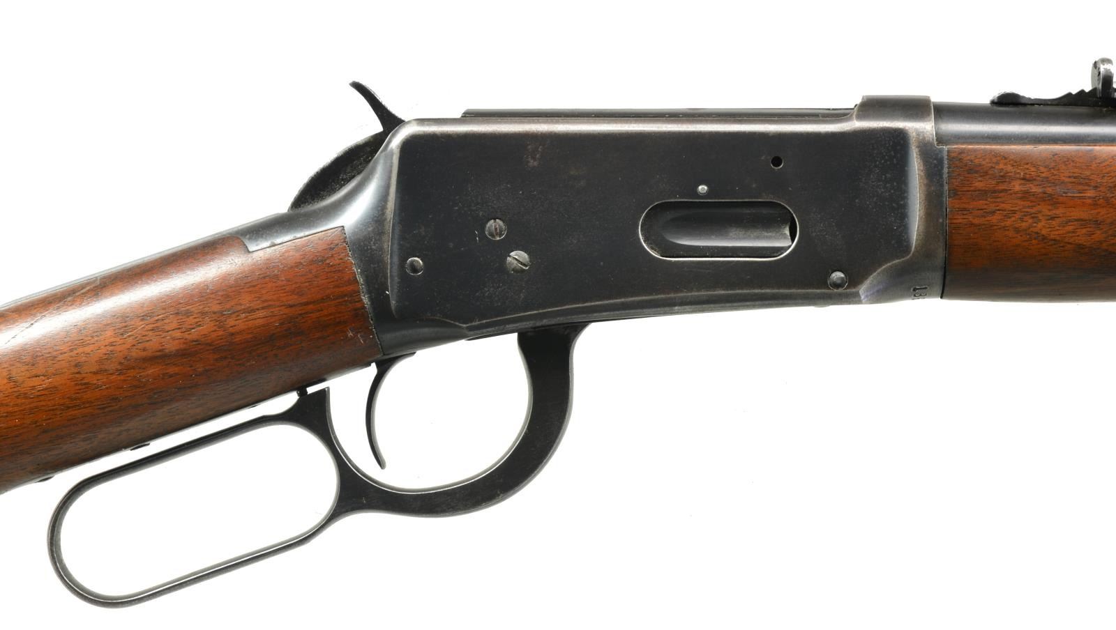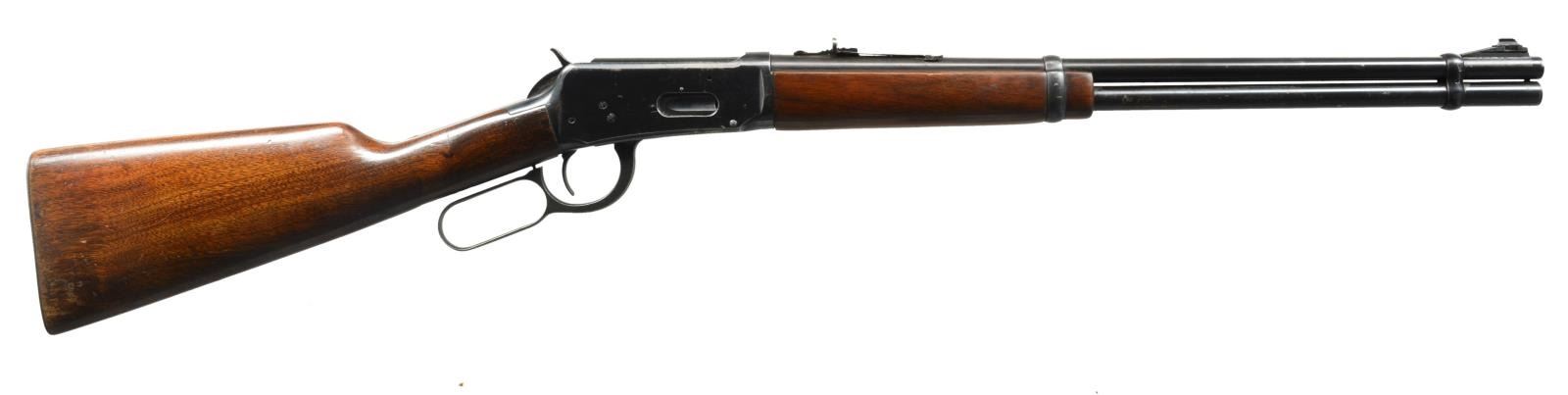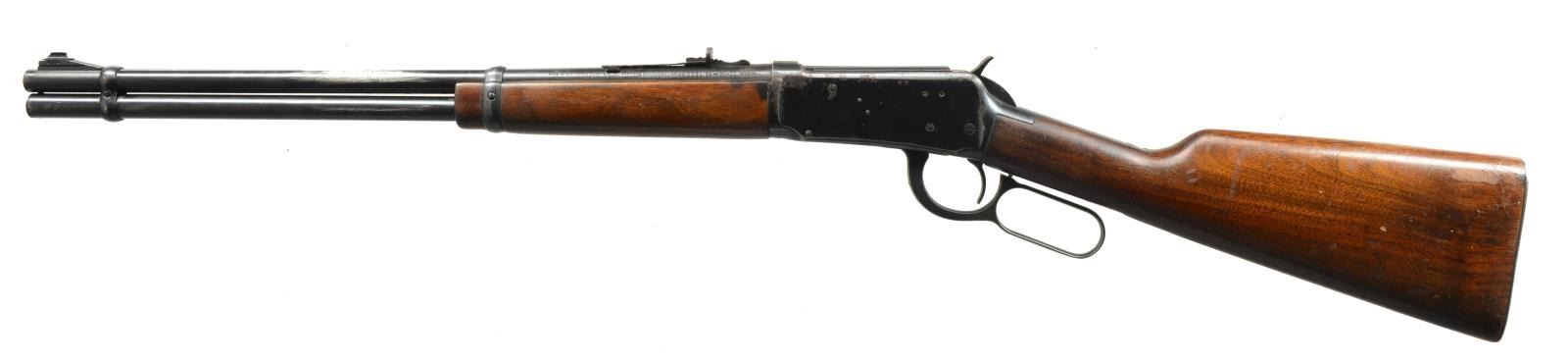 CARBINES. ALL: bbls. 20" w/ ramp mounted bead front sights & sporting rear sights. Full length mags. Short wood walnut forearms w/ straight grip walnut stocks having checkered steel buttplates. 1) Cal. 30-30. S# 1982333. 1953 Mfg. CONDITION: 80% lightly worn blue showing spots of corrosion & pitting left side of bbl. & mag. tube have a sm. area of abrasive cleaning. Stock has lightly worn finish w/ spots of peeling, scratches & marks. Bright bore w/ lightly worn rifling. (20-2825/DS). 2) Cal. 32 WS. S# 1862012. WWII Era mfg. CONDITION: 75% lightly worn blue showing spots of corrosion. Wood has worn & peeling finish showing scratches & marks. Bore is bright w/ strong rifling. (20-2826/DS). ALL CURIO. $600-900.