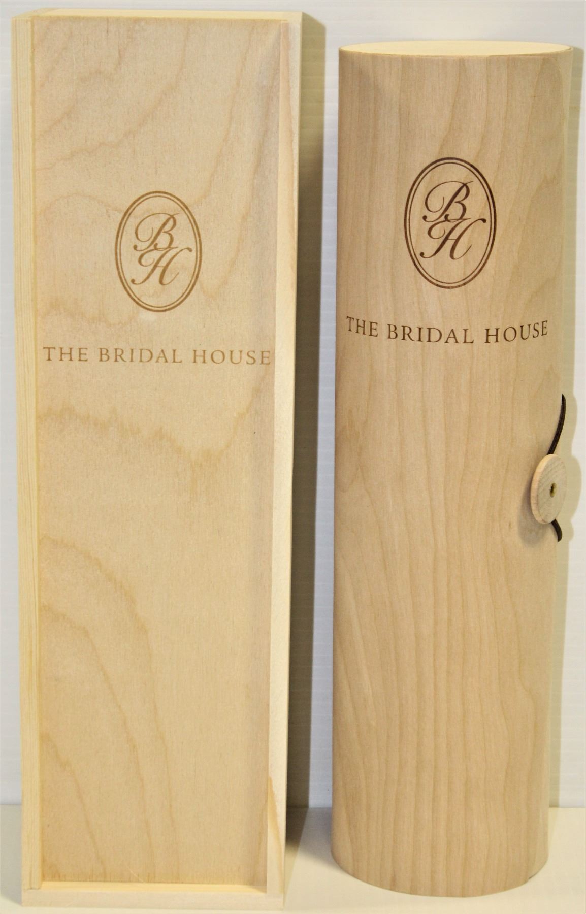 2 WOODEN GIFT WINE BOTTLE HOLDERS W/ EMBLEM