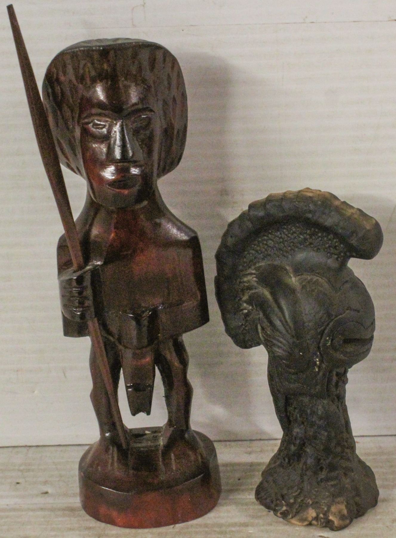 2 WOODEN STATUES HELMET AND SWORD HOLDING