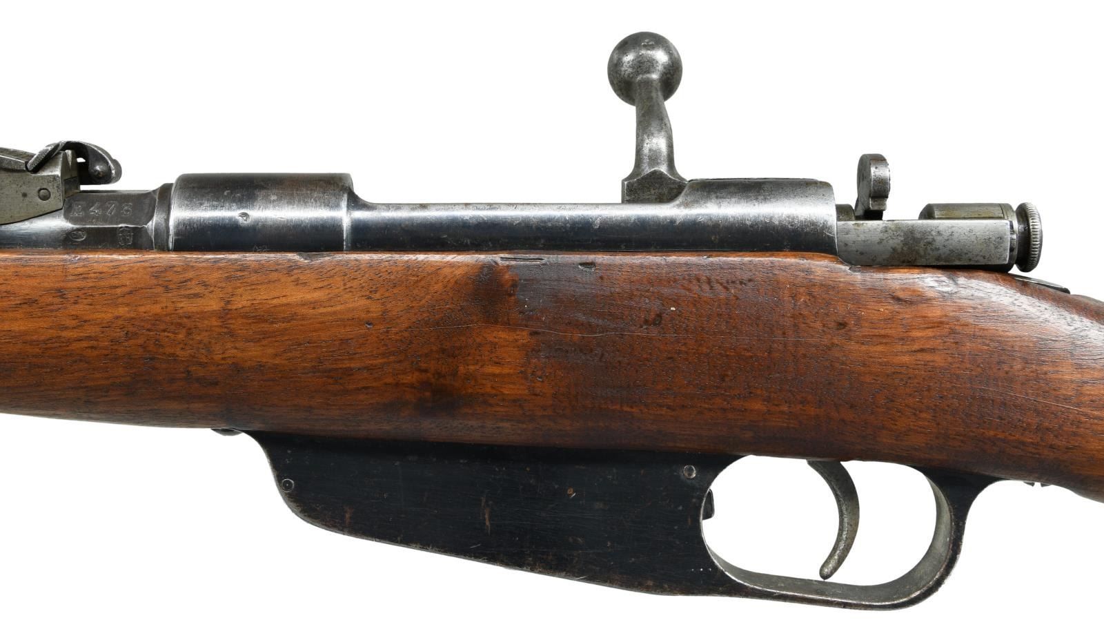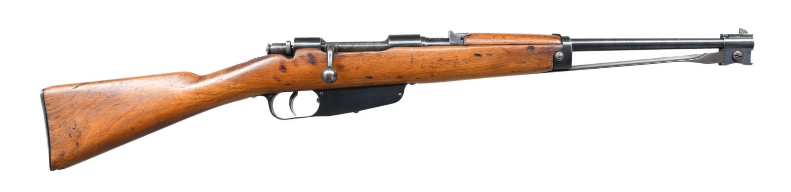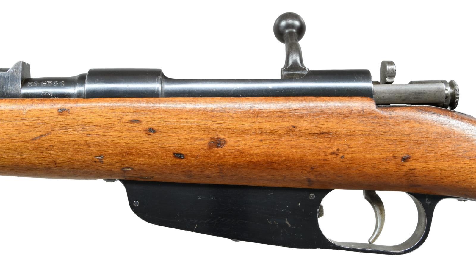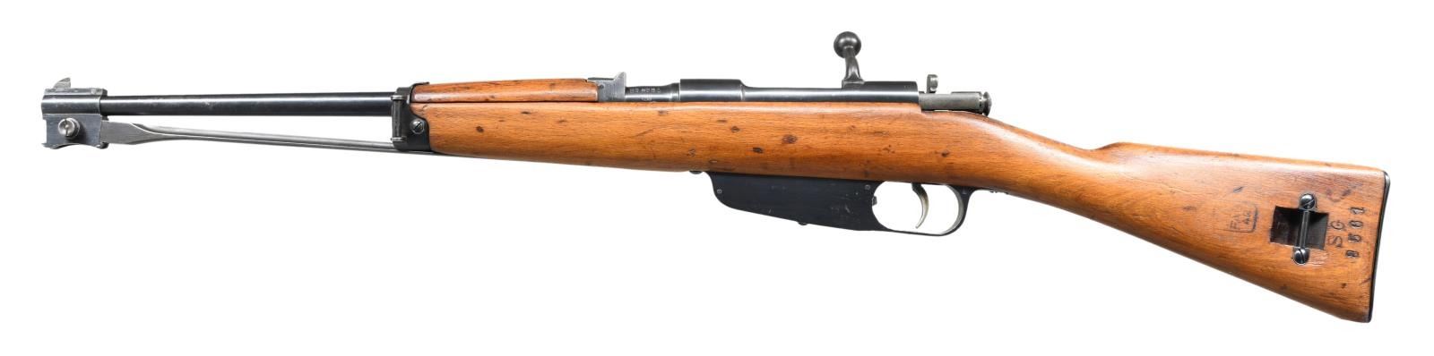 1) Cal. 6.5 Carc. S# SG8561. Bbl. 17 1/2". Matching number on butt stock. Right side of bbl. has 1942 date. Top of bbl. has Gardone marking. Fixed rear sight. Blade front sight. Folding spike bayonet w/ 13" blade. Beech stock w/ left side sling provisions. Stock has faint "FAG 42" cartouche on the left side of butt & what appears to be a faint German depot stamp along the bottom of butt. CONDITION: stock set appears lightly sanded w/ added finish, a large chip at toe, another chip near sling slot, scattered dings & handling marks. Metal retains 70% arsenal blue w/ some light pitting on bbl., scattered fading & edge wear. Very good bore. (23-1929/MJC). 2) Cal. 6.5 Carc. S# E473. Bbl. 18". Mismatched number on stock. Top of receiver has Gardone marking. Left side of receiver has 1935 date in standard form & Roman numeral form. Tangent rear sight graduated to 1500m. Blade front sight. Folding spike bayonet w/ 13" blade. Hardwood stock w/ "CAL 7.35" marking, faint Gardone cartouche & left side sling provisions. Metal is proud of wood. CONDITION: refinished stock set w/ added varnish, a small crack on rear of handguard, a 2 1/4" crack behind trigger guard extending into wrist, scattered dings & handling marks. Metal retains 30% arsenal blue w/ overall thinning to gray, some light pitting on mag body & scattered oxidation. Fair bore w/ scattered pitting & frosting. (23-1982/MJC). ALL CURIO. $300-600.