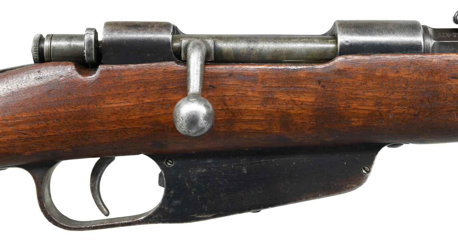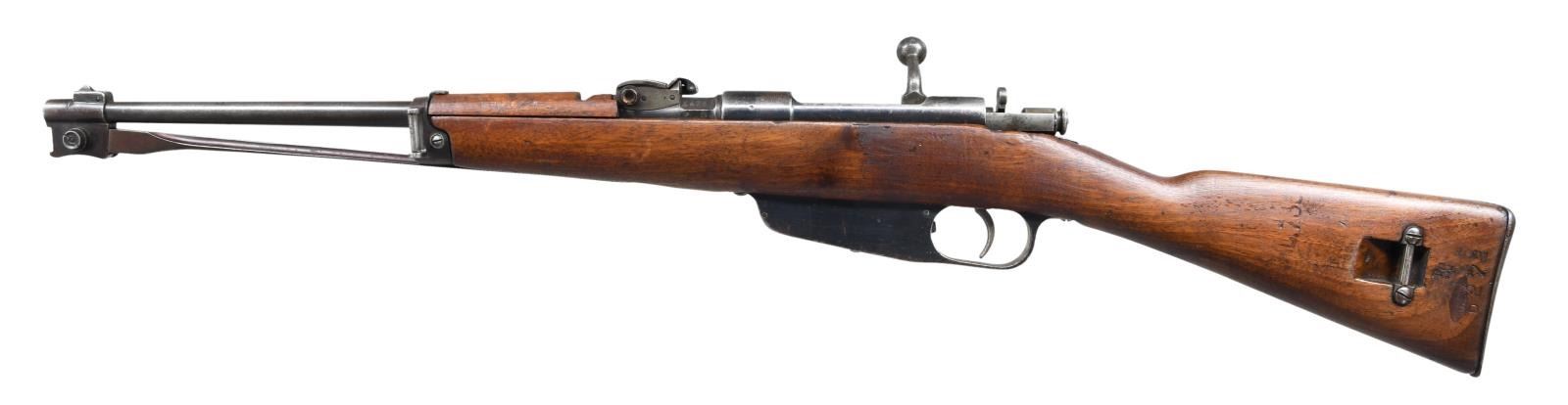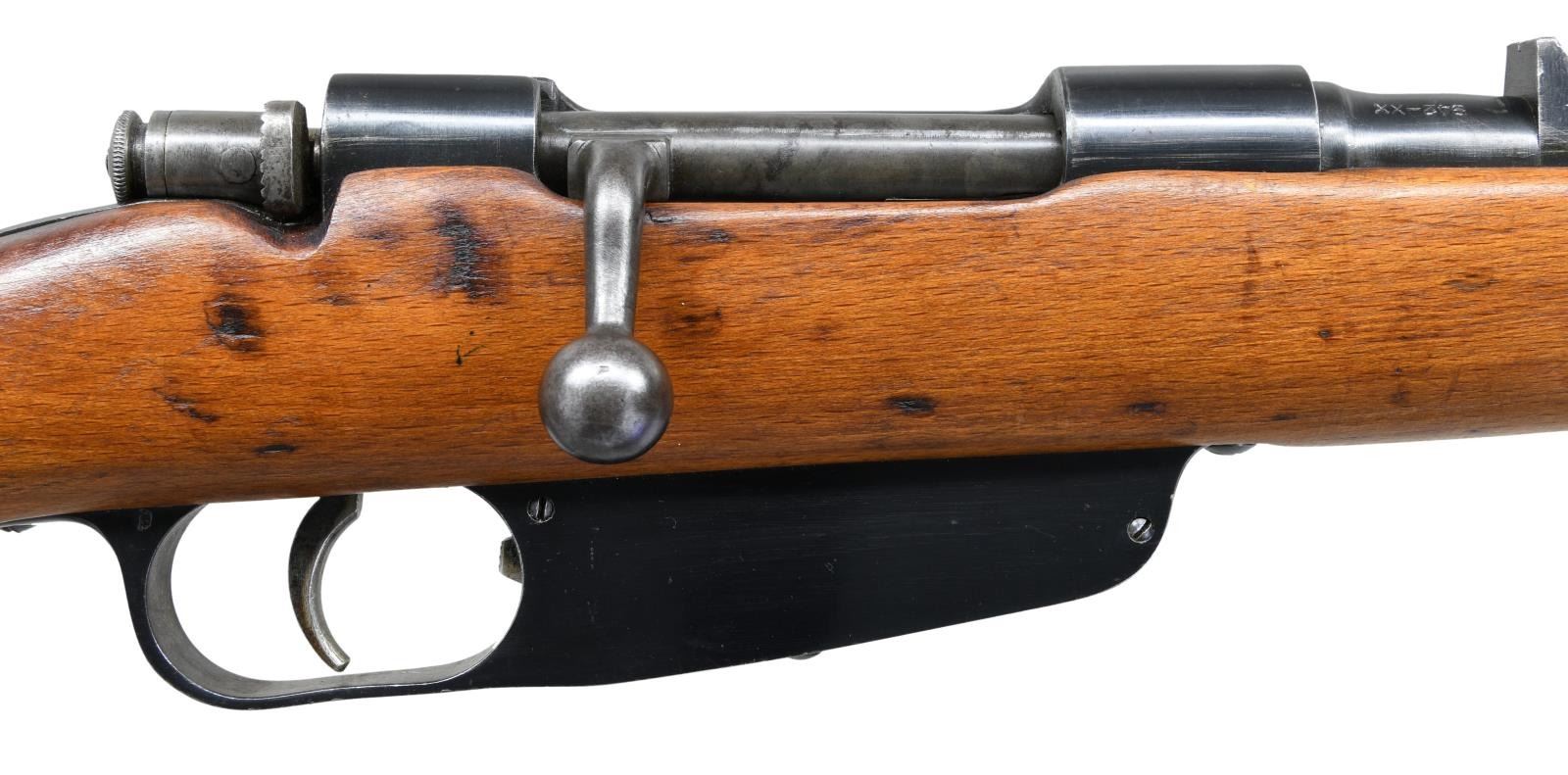 1) Cal. 6.5 Carc. S# SG8561. Bbl. 17 1/2". Matching number on butt stock. Right side of bbl. has 1942 date. Top of bbl. has Gardone marking. Fixed rear sight. Blade front sight. Folding spike bayonet w/ 13" blade. Beech stock w/ left side sling provisions. Stock has faint "FAG 42" cartouche on the left side of butt & what appears to be a faint German depot stamp along the bottom of butt. CONDITION: stock set appears lightly sanded w/ added finish, a large chip at toe, another chip near sling slot, scattered dings & handling marks. Metal retains 70% arsenal blue w/ some light pitting on bbl., scattered fading & edge wear. Very good bore. (23-1929/MJC). 2) Cal. 6.5 Carc. S# E473. Bbl. 18". Mismatched number on stock. Top of receiver has Gardone marking. Left side of receiver has 1935 date in standard form & Roman numeral form. Tangent rear sight graduated to 1500m. Blade front sight. Folding spike bayonet w/ 13" blade. Hardwood stock w/ "CAL 7.35" marking, faint Gardone cartouche & left side sling provisions. Metal is proud of wood. CONDITION: refinished stock set w/ added varnish, a small crack on rear of handguard, a 2 1/4" crack behind trigger guard extending into wrist, scattered dings & handling marks. Metal retains 30% arsenal blue w/ overall thinning to gray, some light pitting on mag body & scattered oxidation. Fair bore w/ scattered pitting & frosting. (23-1982/MJC). ALL CURIO. $300-600.
