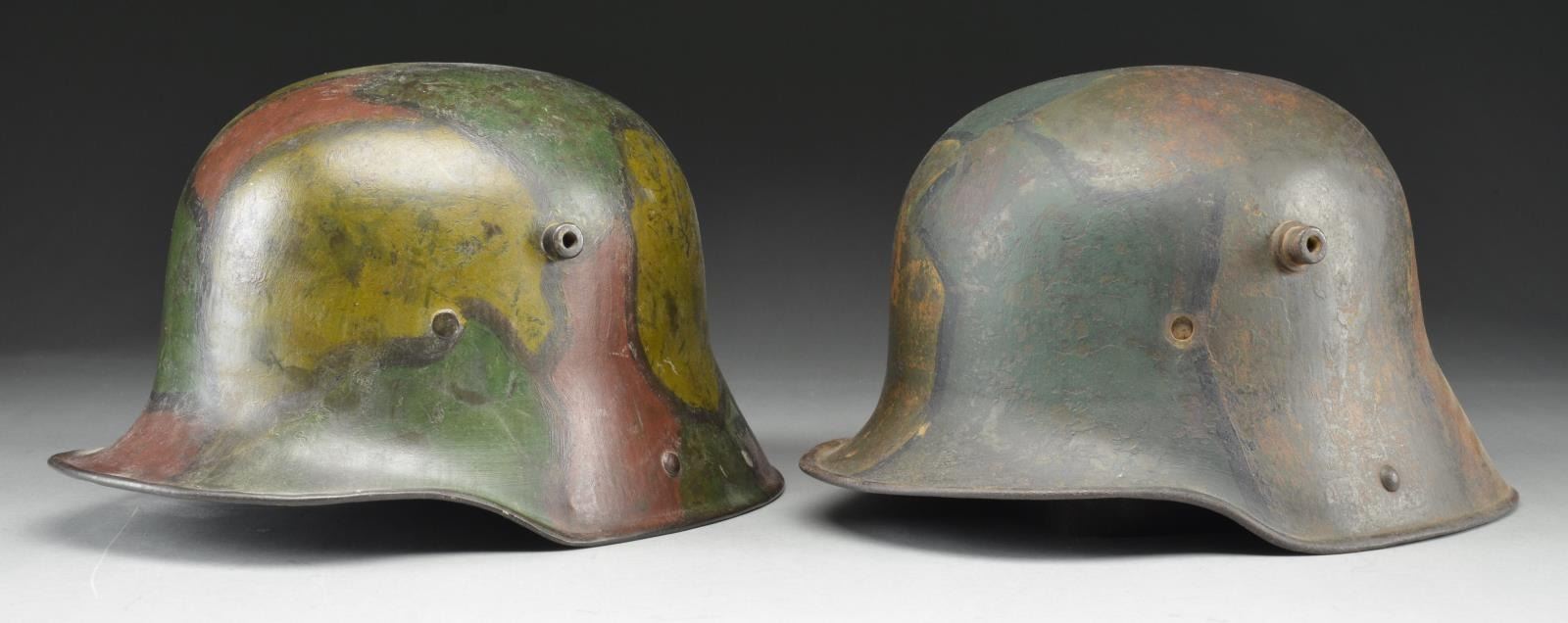 2) Another classic WWI steel camouflage trench helmet known as the M1916/17. Body of helmet appears to be painted in light green, dark green & yellow camouflage paint separated by black lines. Interior has a dark green finish. 3 Section pad liner w/ leather chinstrap. Left interior of the helmet is stamped, "K3". CONDITION: camouflage paint is approx. 50%. Chinstrap & liner show wear but are substantially solid. (02-16329/BF). $700-1,200.