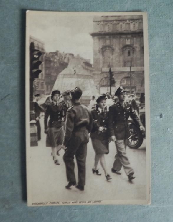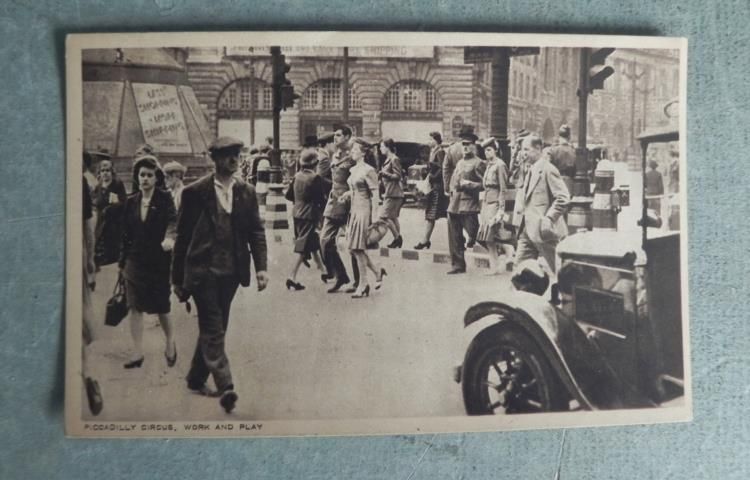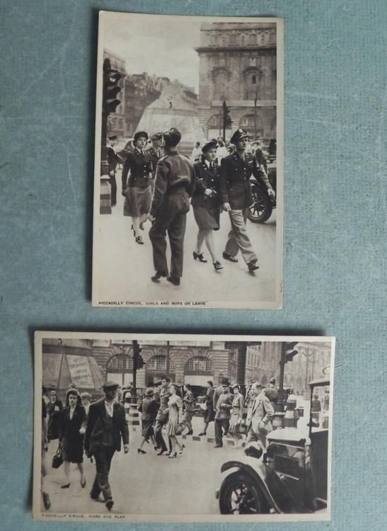 2 WWII BRITISH POSTCARDS-PICCADILLY CIRCUS-SHOWING MILITARY PERIOD ORIGINALS--3 1/2 X 5 1/2