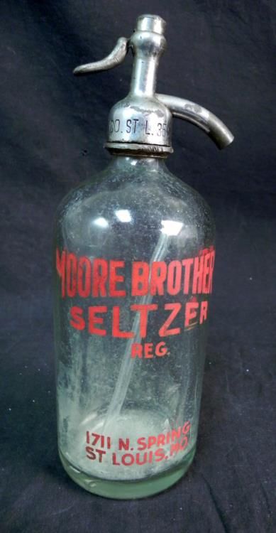 2 WWII ERA SELTZER WATER BOTTLES - ONE WITH TOP TAPPER---ONE IS MOORE BROS. SELTZER ST. LOUIS WITH SILVER TOP TAPPER AND SPIGGOT - OTHER IS CLOVER LEAF SELTZER ST. LOUIS