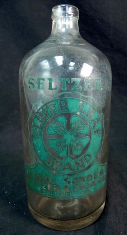 2 WWII ERA SELTZER WATER BOTTLES - ONE WITH TOP TAPPER---ONE IS MOORE BROS. SELTZER ST. LOUIS WITH SILVER TOP TAPPER AND SPIGGOT - OTHER IS CLOVER LEAF SELTZER ST. LOUIS