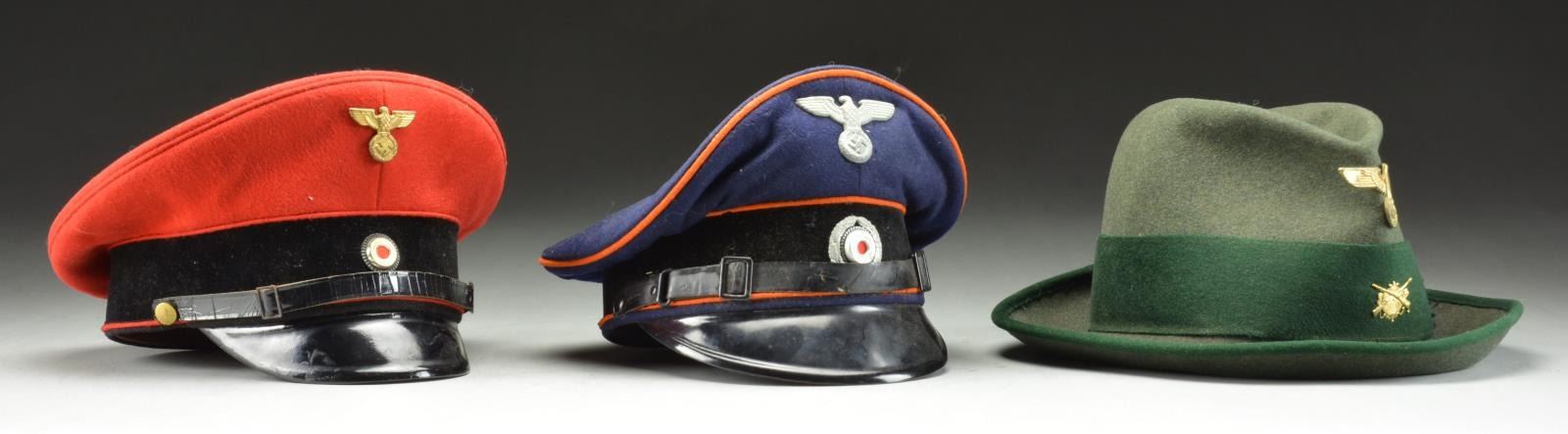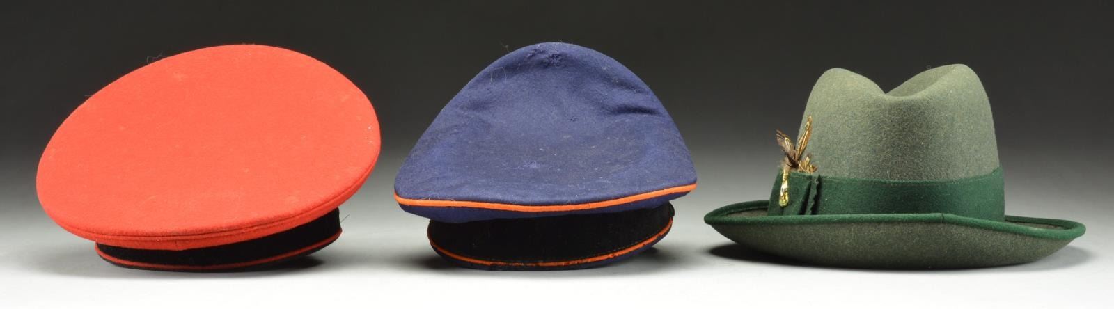 3) HUNTING FEDORA. An interesting German Hunting Association fedora in sage green with forest green band & edging. There is a gilded Party eagle above crossed rifles & target pin on the front of the fedora. The left side has a few feathers tucked into the band & another gilded pin featuring crossed rifles with a target & hunting horn. The brown sweatband is marked, "Rheinhut" & "A. Durmeier Rastatt Herrenstr 7". There are oval initials applied to the sweatband that read, "W W". CONDITION: hat shows light wear overall. (02-17097/BF). $1,000-1,300.