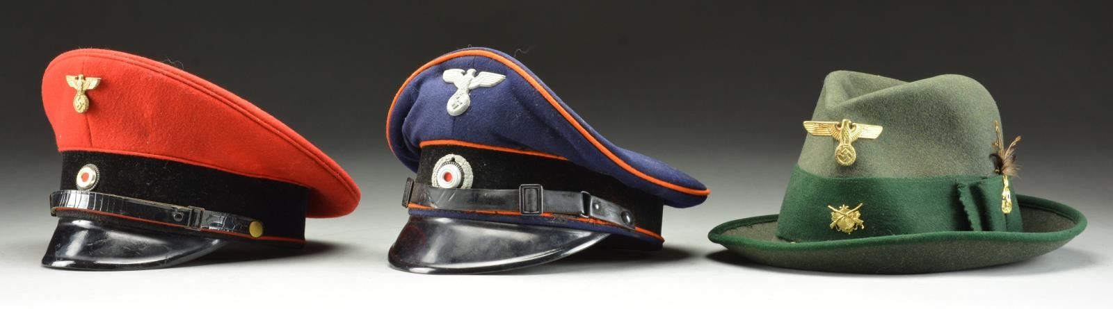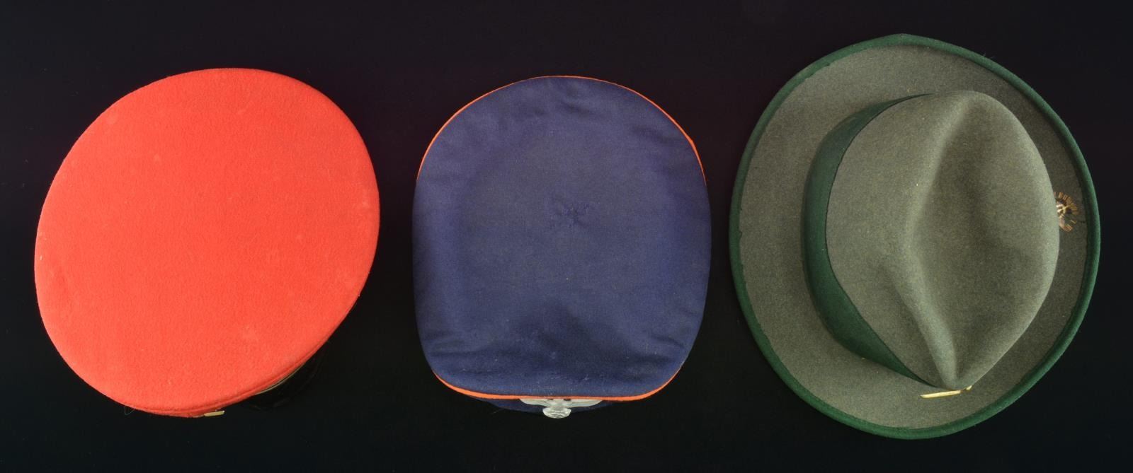 1) FIRE POLICE. This visor cap has a dark navy blue crown with a black band. It is piped in orange throughout. There is an zinc police eagle at the front of the crown along with a small zinc wreath with a central national cockade at the front of the band. Black visor with black leather chinstrap terminated by black enameled buttons. Gray sweatband with rounded diamond shaped sweatshield. Sweatshield is embossed "Litte Mutze -WIEN- Sonderklasse". Orange cotton lining with coated crown. CONDITION: cap shows evidence of scattered mothing with 4 small period repaired holes in the crown. Sweatband & lining show light wear. Sweatshield shows moderate wear.