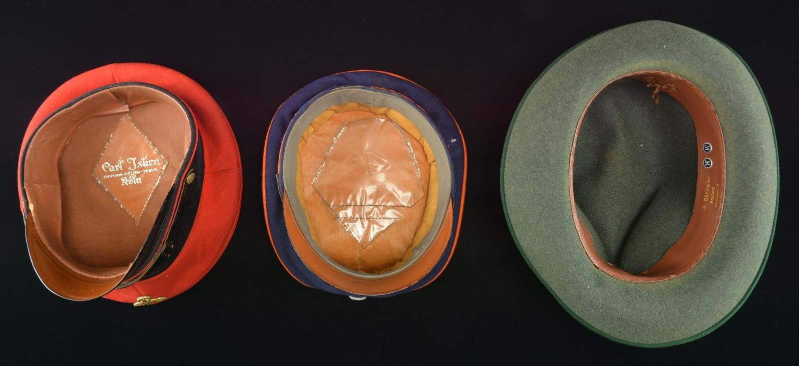 2) STATION MASTER. This scarce visor cap is for a railway stationmaster & features a red crown with a black velvet band. It is piped in red throughout. There is a gilded railway eagle at the front of the crown along with a national cockade at the front of the band. Black visor with black leather chinstrap terminated by gold pebble finished buttons. Brown sweatband with diamond shaped sweatshield. Sweatshield is embossed in silver, "Carl Isken UNIFORM-MUTZEN-FABRIK Koln". Orange/brown cotton lining with coated crown. CONDITION: cap shows some light moth tracks. Sweatband has a bit of flexing. Interior shows light wear.
