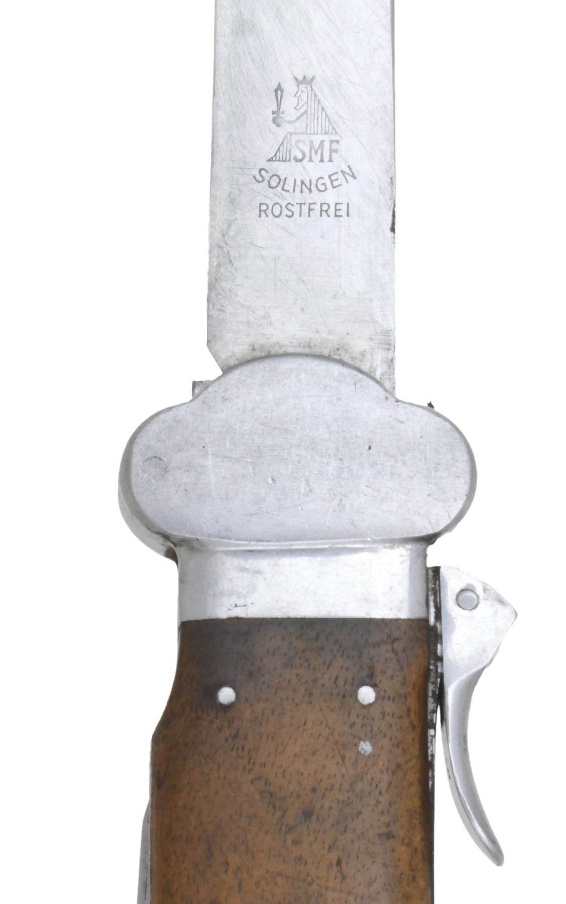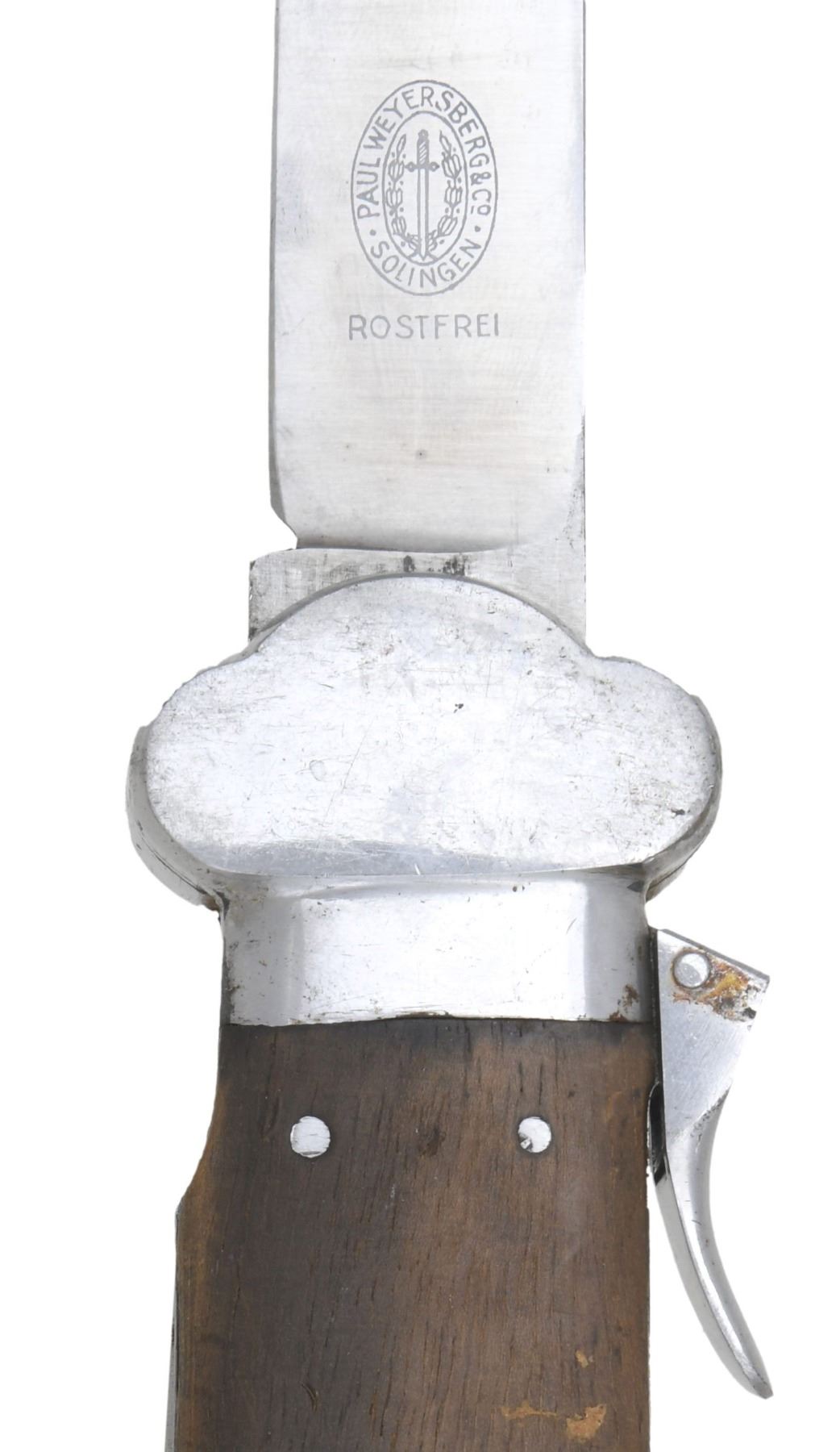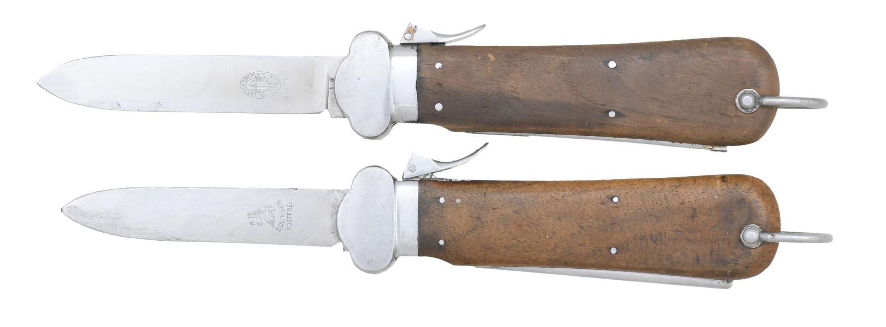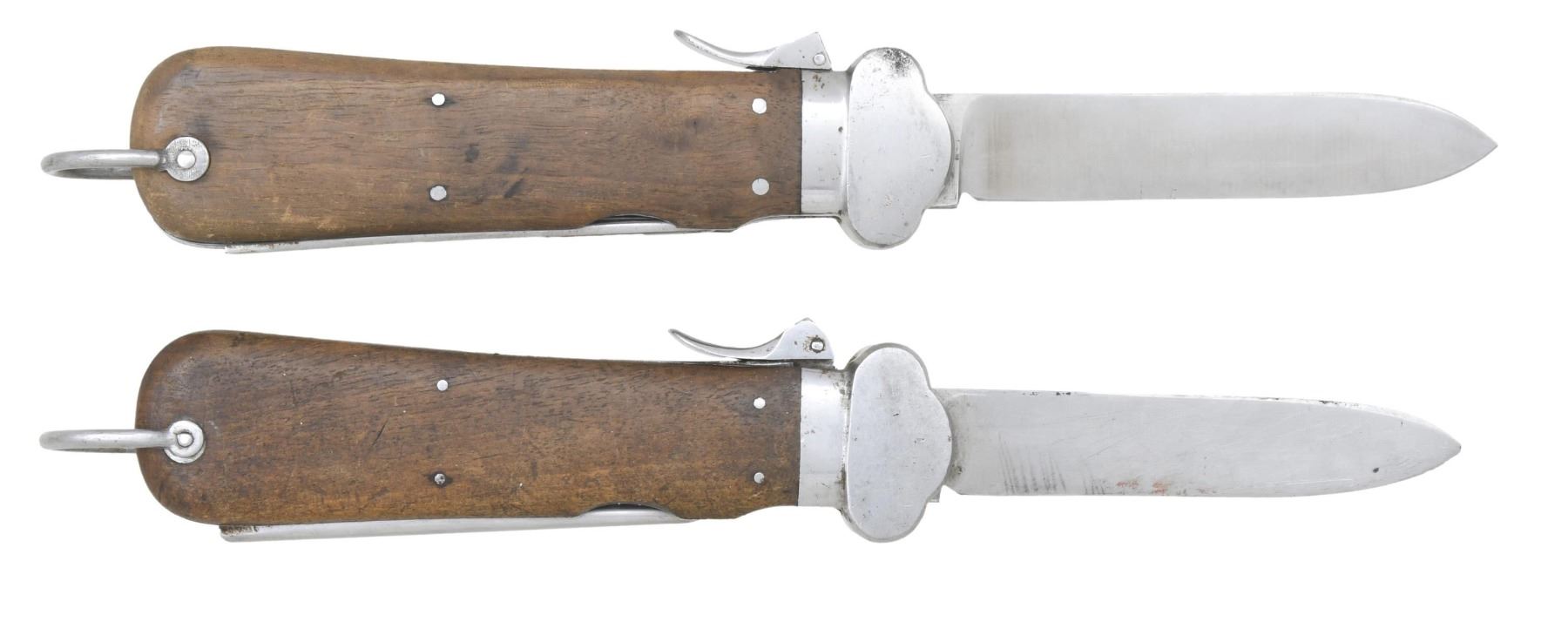 1) Overall length: 10 5/8" with blade and lanyard ring extended. The blade is marked "PAUL WEYERSBERG & CO. (logo) SOLINGEN". Opposite the blade is a folding spike and an end-mounted lanyard ring. Two-piece wooden grip with four rivets on each side and a lanyard ring rivet. CONDITION: knife shows light wear overall with no notable damage. Spring and blade function well. 2) Overall length: 10 5/8" with blade and lanyard ring extended. The blade is marked "(logo) SMF SOLINGEN ROSTFREI". Opposite the blade is a folding spike and an end-mounted lanyard ring. Two-piece wooden grip with four rivets on each side and a lanyard ring rivet. CONDITION: knife generally shows light wear, but the blade shows evidence of sharpening. The knife does function, but the blade is a bit loose. (02-22922-4/BF). $700-900.