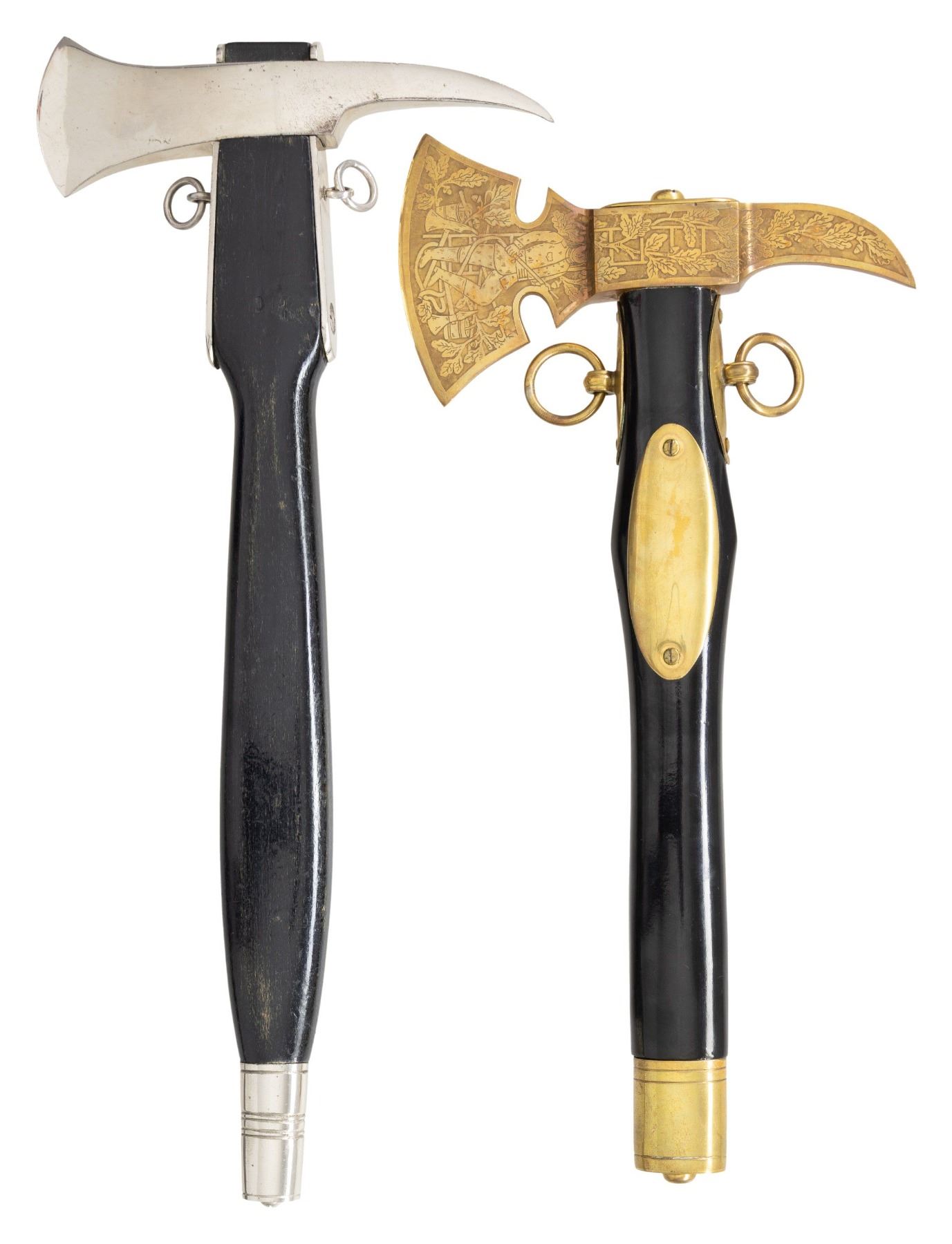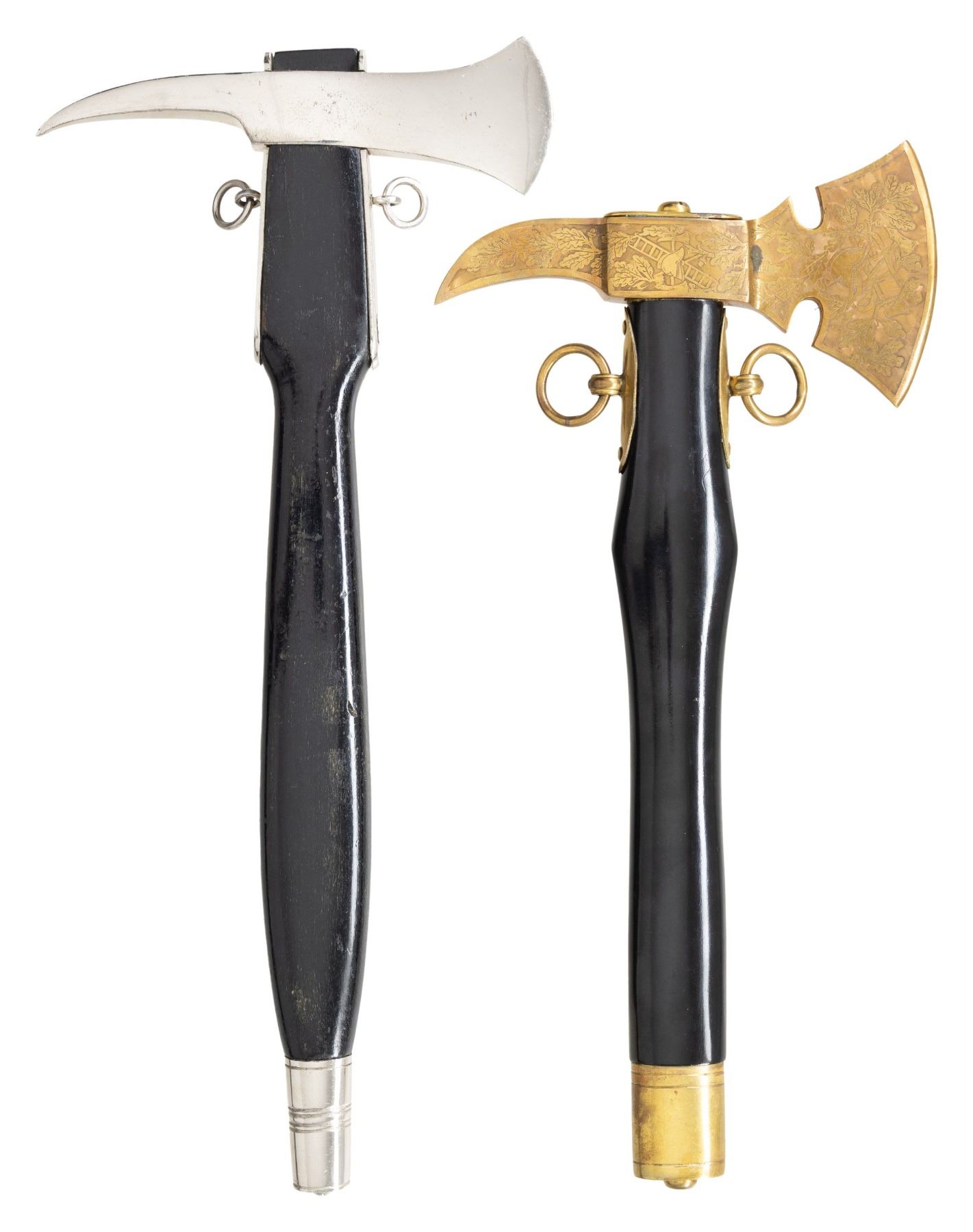 1) A very fine WWI German fireman dress Ax with gold plated fittings on a black enameled haft. The ax measures about 14" in length and the head is 7" across with a 3 3/4" bit. The Head is etched with oak leaves as well as a fireman and scenes of fire equipment. There is a ring on either side of the haft an and oval plate that has not been inscribed. CONDITION: very light wear. 2) A fine WWI German fireman dress Ax with plated fittings on a black enameled haft. The ax measures about 15 1/2" in length and the head is 7" across with a 2 1/8" bit. There is a ring on either side of the haft an cap on the butt. CONDITION: very light wear. (02-24964/BF). NON-GUN. $700-1,200.