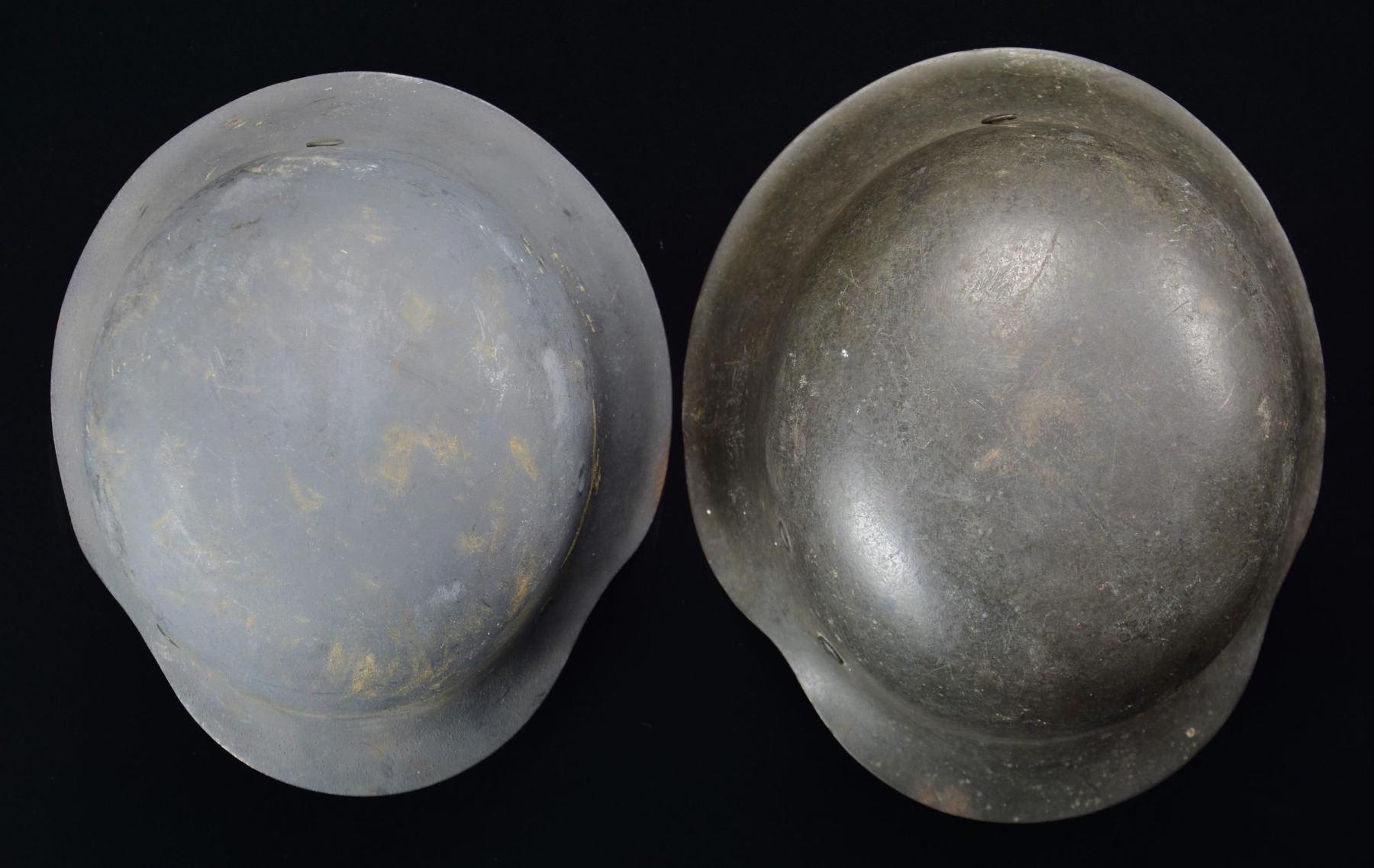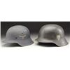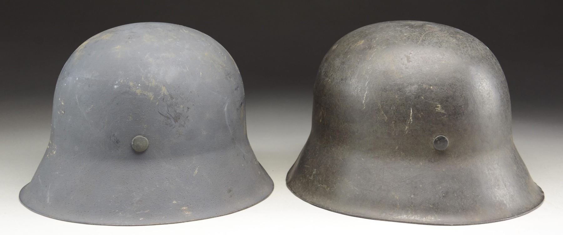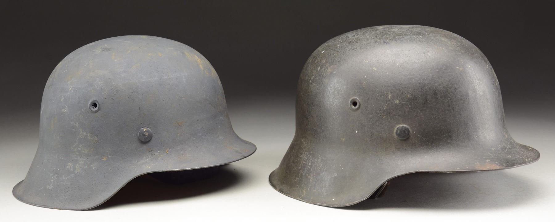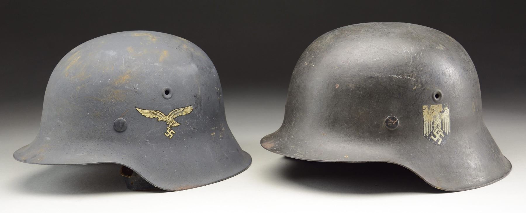 1) ARMY. A good M1942 single-decal German helmet with a gray-green painted finish and a Wehrmacht decal on the left side. Interior rear is stamped "35877" and the interior left is stamped "EF64". Original brown liner and dark brown chinstrap. Liner is stamped size "57" along with a name that is illegible. CONDITION: painted finish is approx. 85%. Decal is about 65%. Liner shows light overall wear, as does the chinstrap. 2) LUFTWAFFE. An M1942 Luftwaffe single-decal helmet with a dark gray-painted finish and a single decal on the left side. This helmet appears to be repainted and has a replacement liner and chinstrap. The inside rear of the helmet is stamped "2336" and the inside left is stamped "ET60". The light tan replacement liner is stamped "53", and the dark brown chinstrap appears original but is likely a replacement. CONDITION: helmet finish is approx. 95%, as is the decal. Liner and chinstrap show very light wear. (02-23293-1/BF). $400-600.