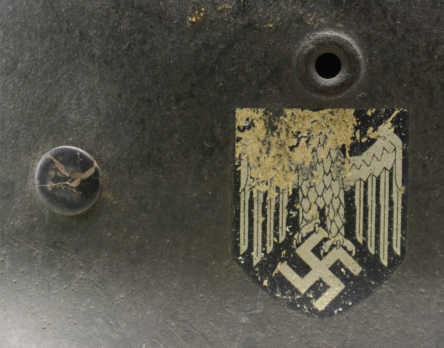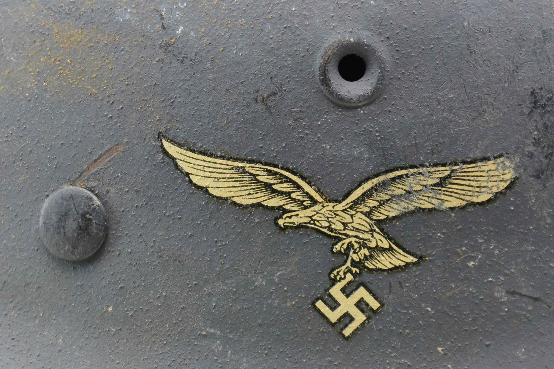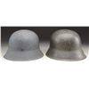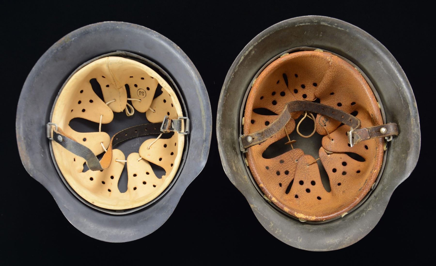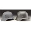 1) ARMY. A good M1942 single-decal German helmet with a gray-green painted finish and a Wehrmacht decal on the left side. Interior rear is stamped "35877" and the interior left is stamped "EF64". Original brown liner and dark brown chinstrap. Liner is stamped size "57" along with a name that is illegible. CONDITION: painted finish is approx. 85%. Decal is about 65%. Liner shows light overall wear, as does the chinstrap. 2) LUFTWAFFE. An M1942 Luftwaffe single-decal helmet with a dark gray-painted finish and a single decal on the left side. This helmet appears to be repainted and has a replacement liner and chinstrap. The inside rear of the helmet is stamped "2336" and the inside left is stamped "ET60". The light tan replacement liner is stamped "53", and the dark brown chinstrap appears original but is likely a replacement. CONDITION: helmet finish is approx. 95%, as is the decal. Liner and chinstrap show very light wear. (02-23293-1/BF). $400-600.