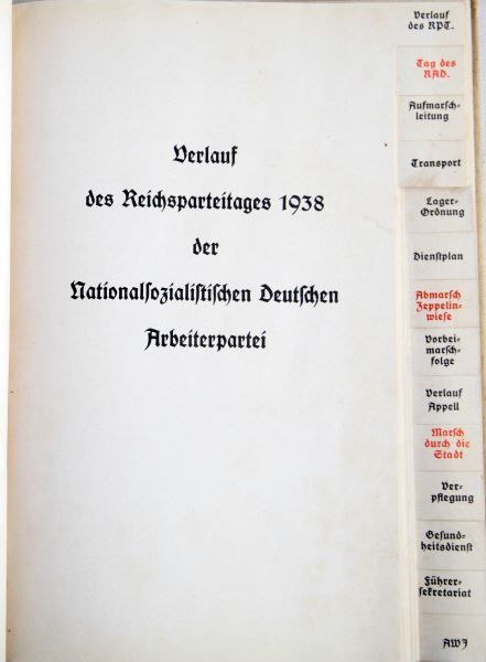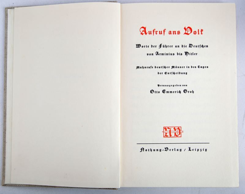 Two WWII German publications. "Aufruf ans Volk" (A Call to the People) with subtitle translating to "Words of German leaders from Arminius to Hitler. Stamped on inside cover "SS Sturm 5/31 Berchtesgaden". Also included is a book from the German Labor Corps regarding the 1938 Nuremberg rally. Both books in good condition. This lot has a reserve.