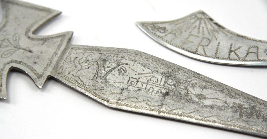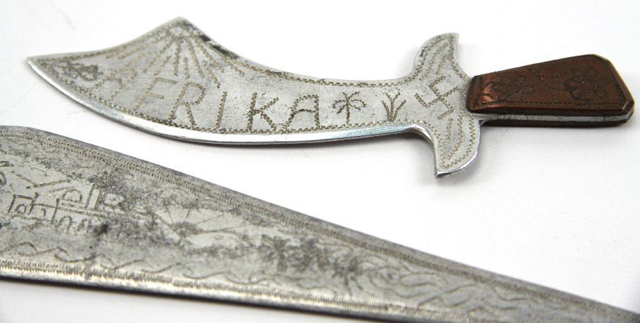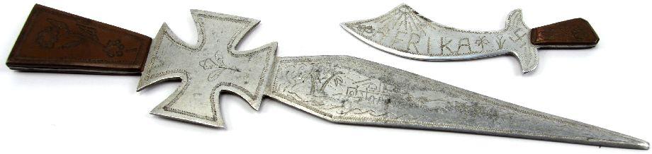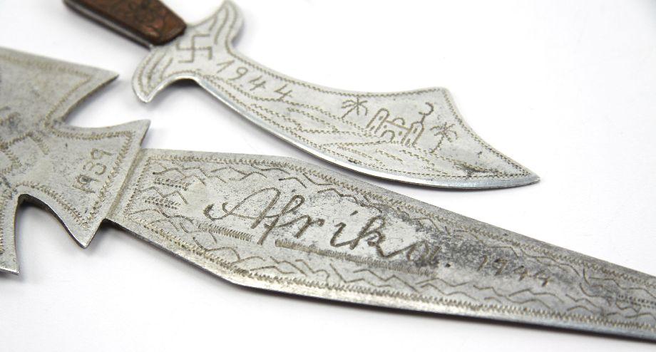 Two hand made trench art knives, crafted from aluminum, with copper handle. The first, measuring 10.5 inches, engraved with "Afrika 1944", with an iron cross design at top, with swastika in middle, and a Sahara desert scene on opposite side of blade. The second, measuring approximately 4.5 inches, engraved "Afrika" with a swastika on one side, and "1944" on the other, with a Saharan scene. Possibly German POW. Exact origin is unverified.